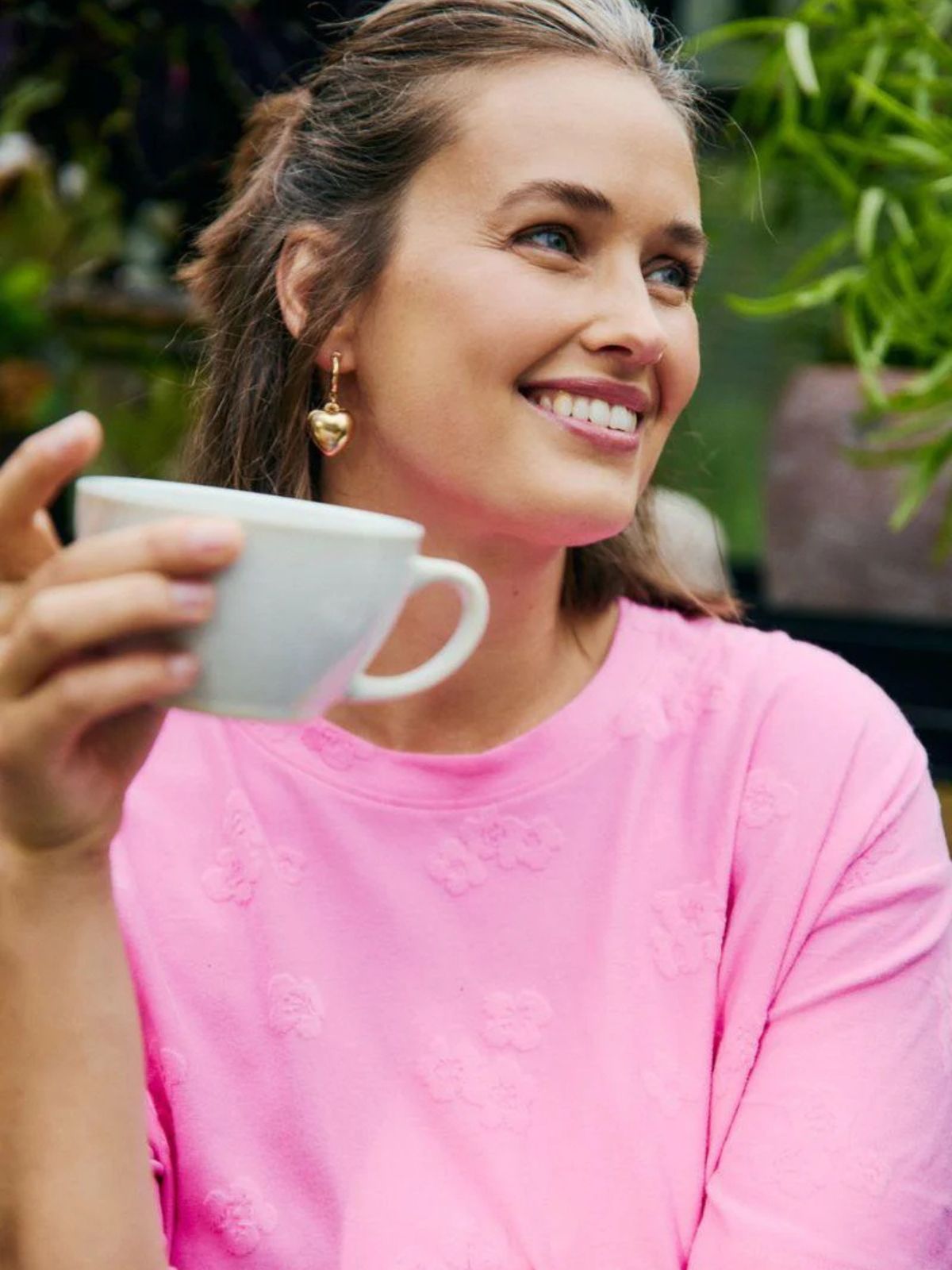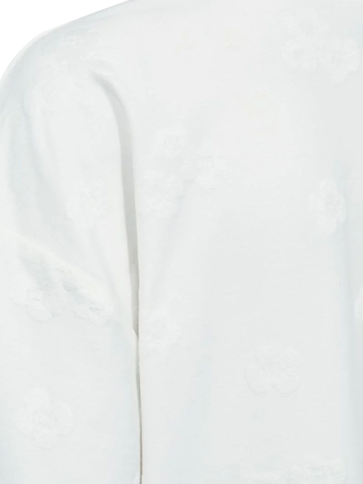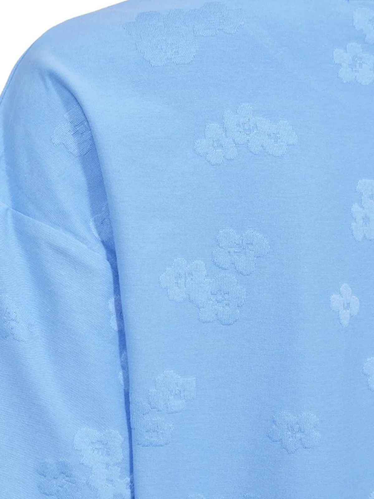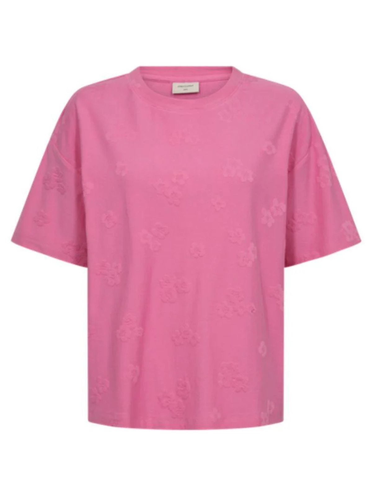 Feminin T-shirt fra FREEQUENT med jaquard vævede blomster tone i tone mønster. Blusen har rund hals, et lige snit smat korte ærmer.Længde: ca. 60 cm