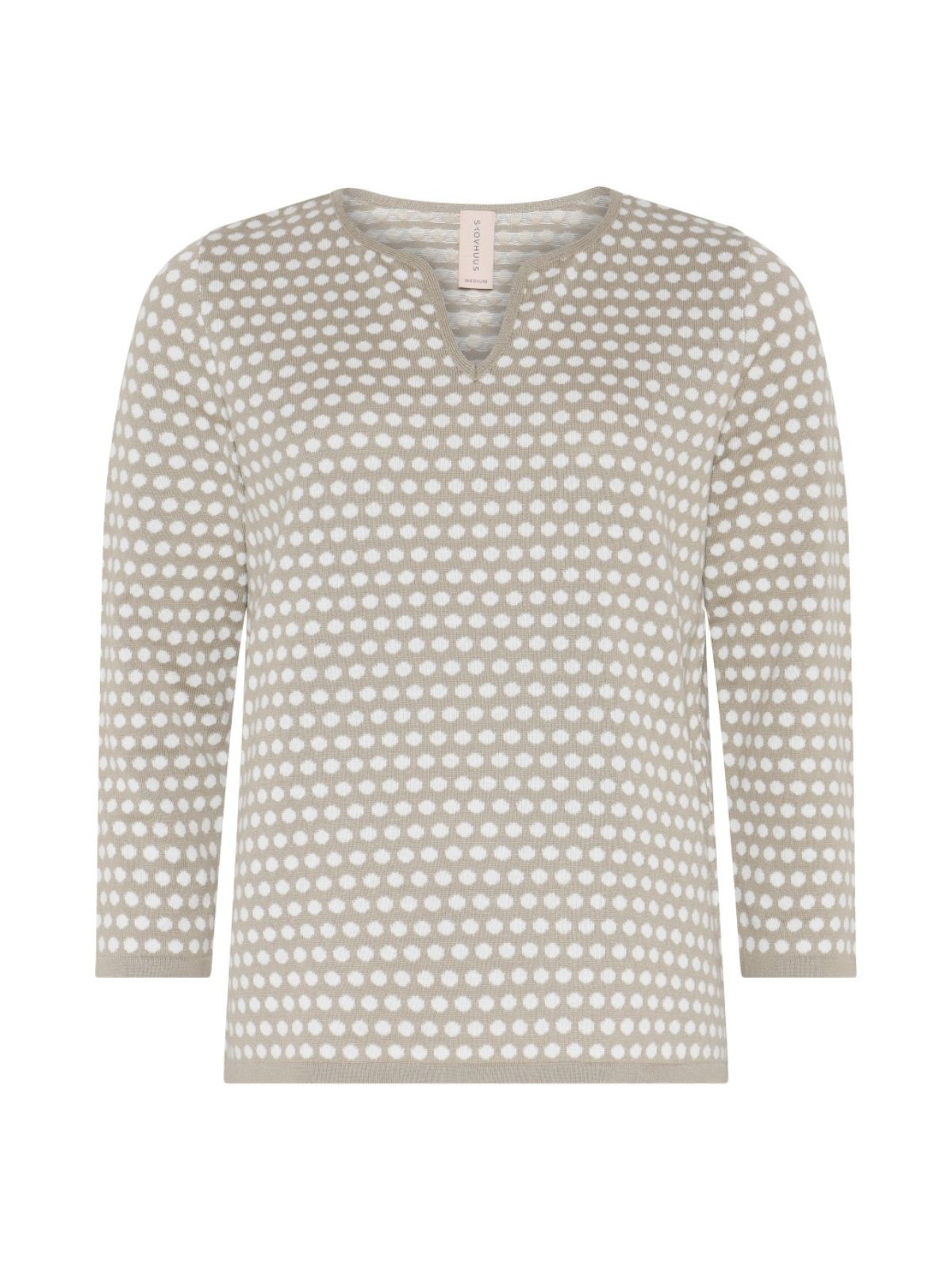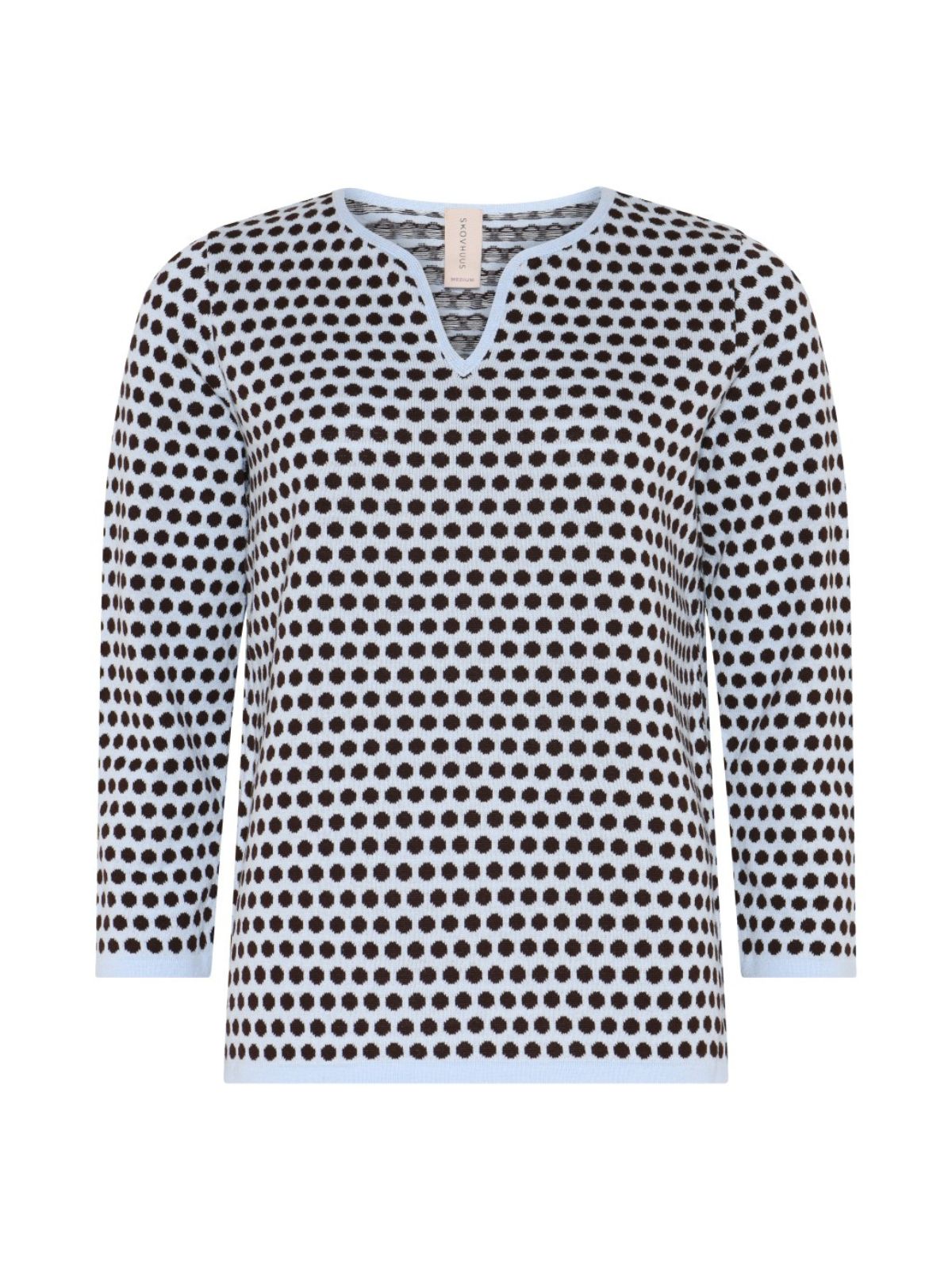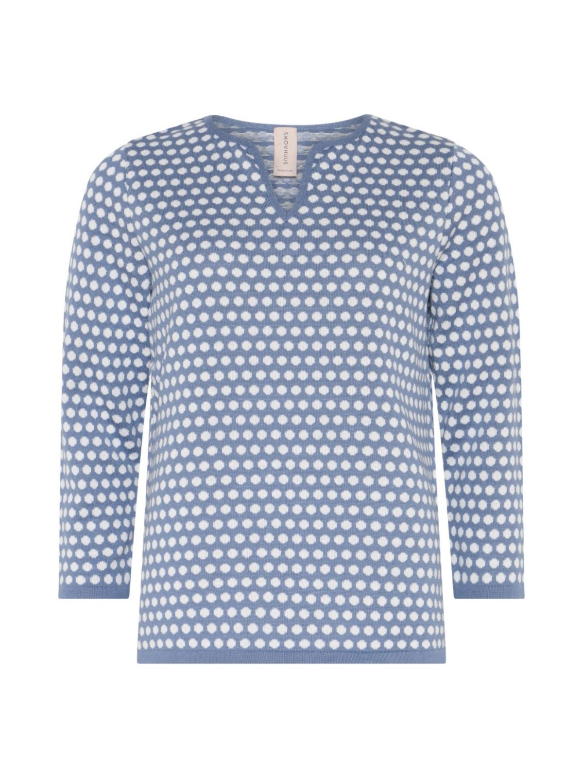 Denne strik fra Skovhuus kombinerer klassisk charme med moderne detaljer. De legende prikker giver et stilfuldt mønster, mens det lille V-udsnit tilføjer et feminint og flatterende touch. Blød og behagelig, den er perfekt til både hverdagsbrug og mere polerede looks.