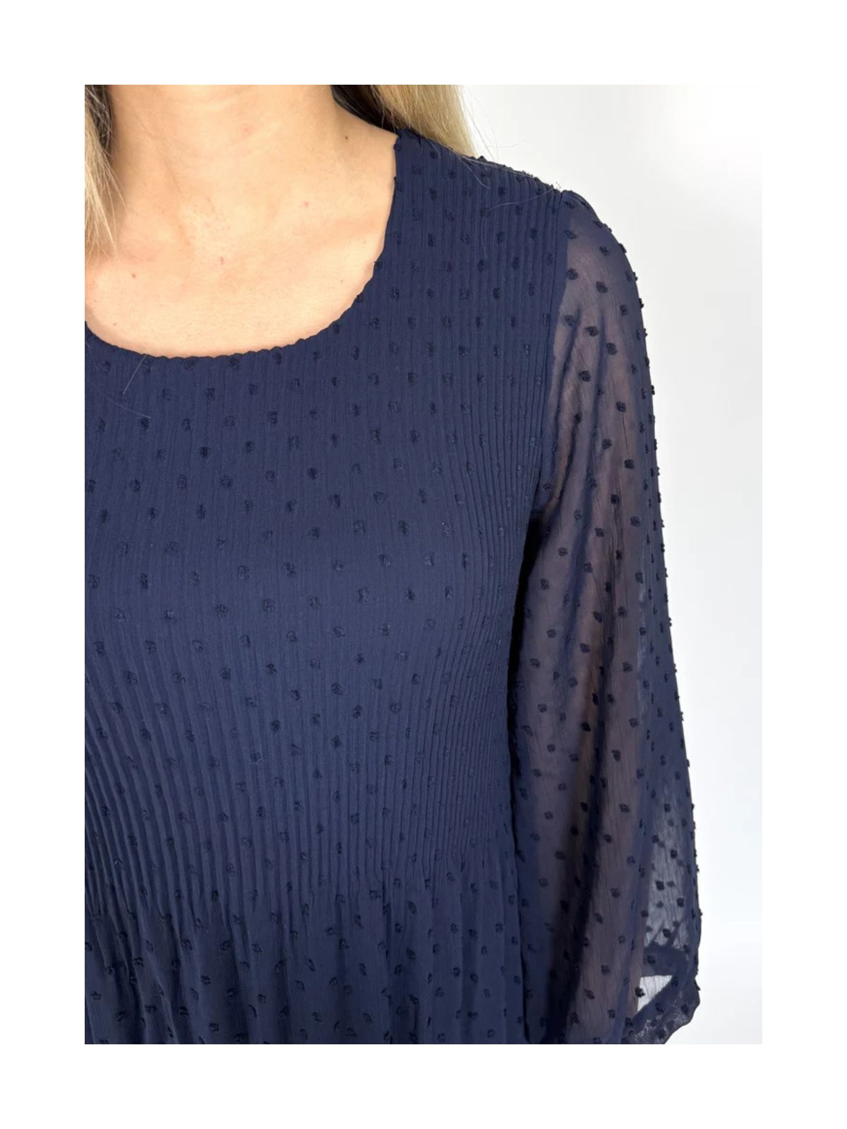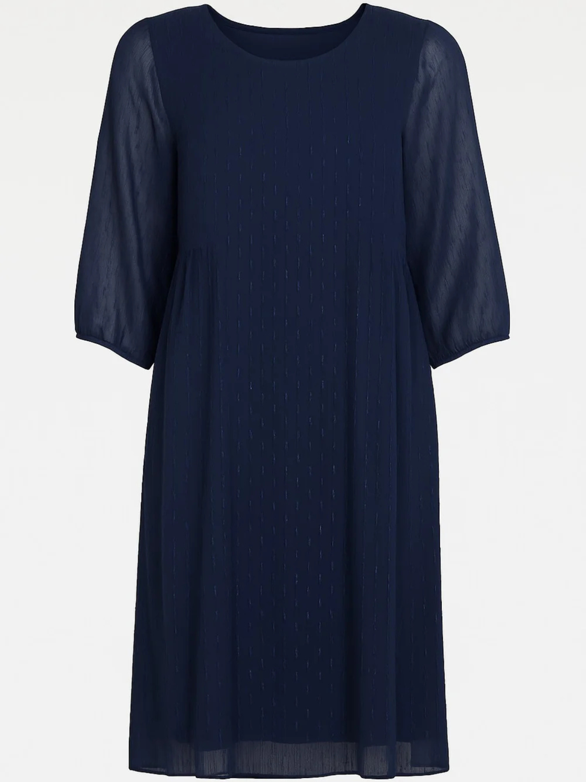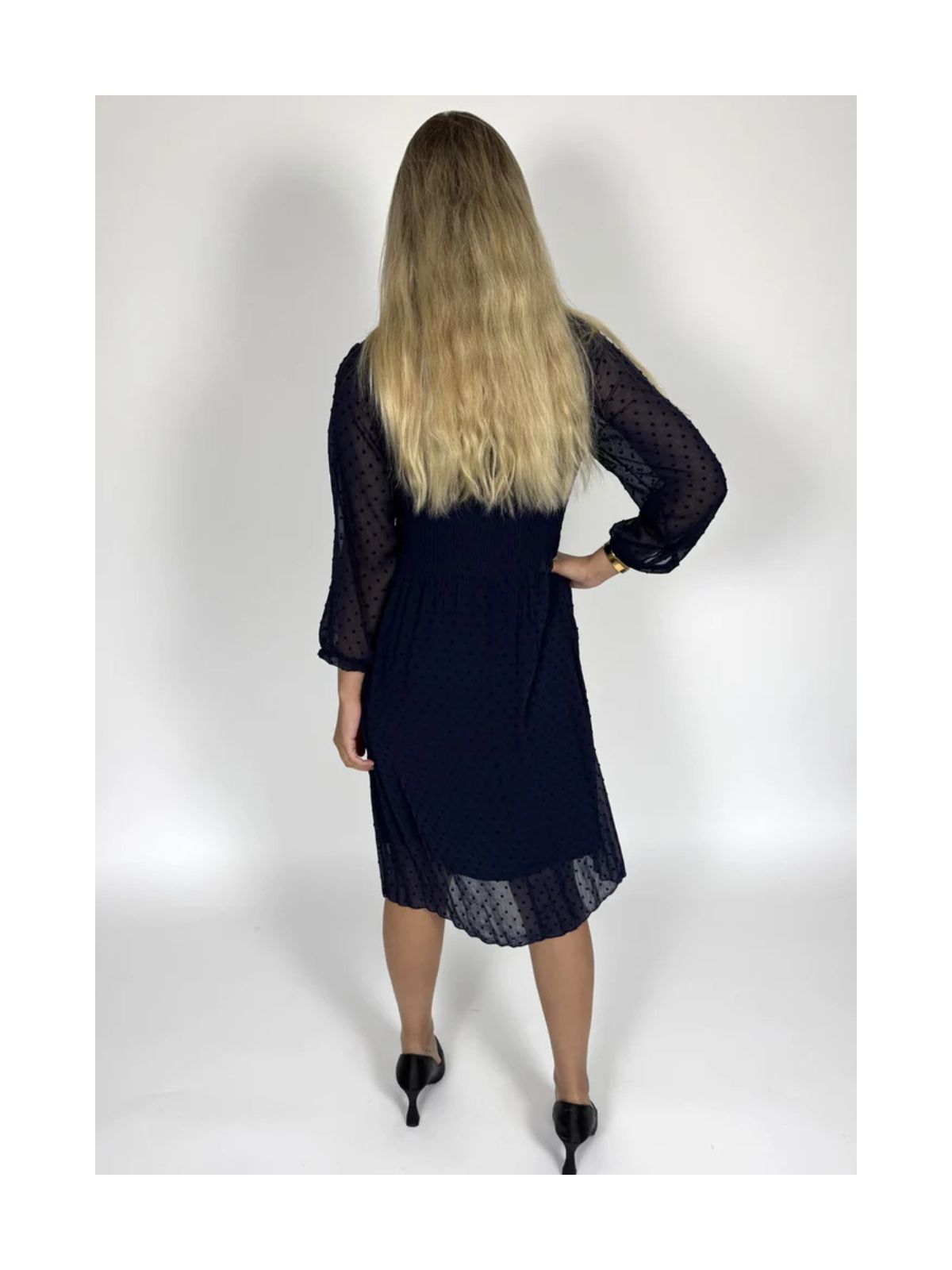 Feminin kjole fra 2 BIZ i let transparent plissé stof med prikker. Kjolen har en rund hals samt 3/4 lange ærmer. Kjolen har en fast underkjole.Længde: ca. 98 cm