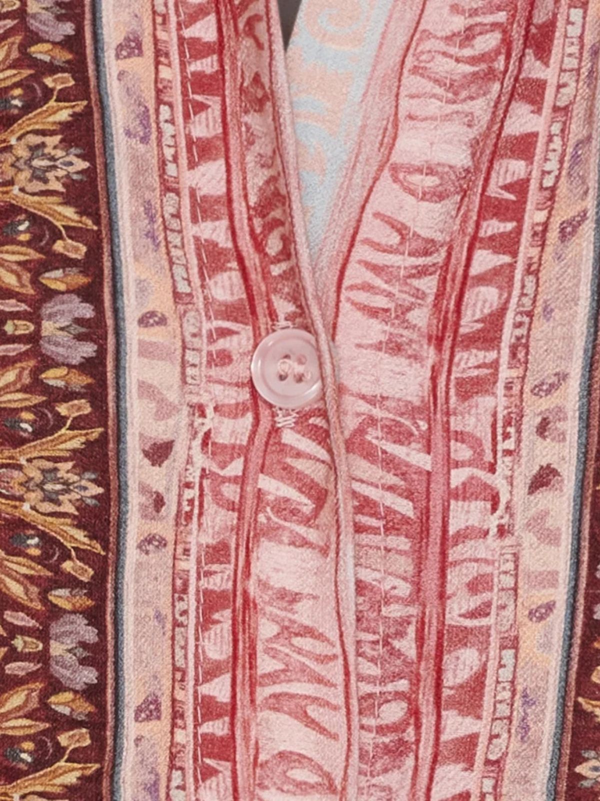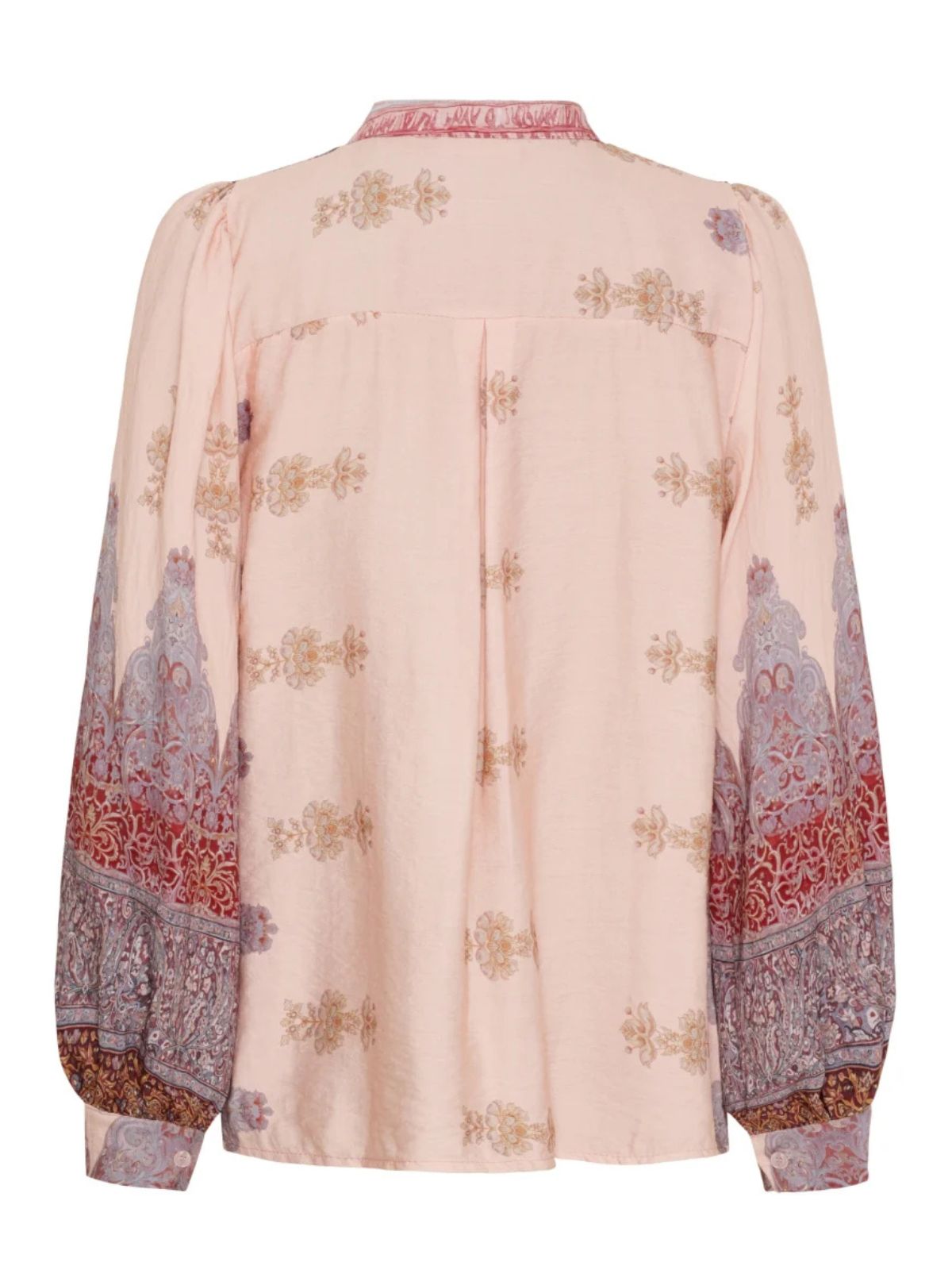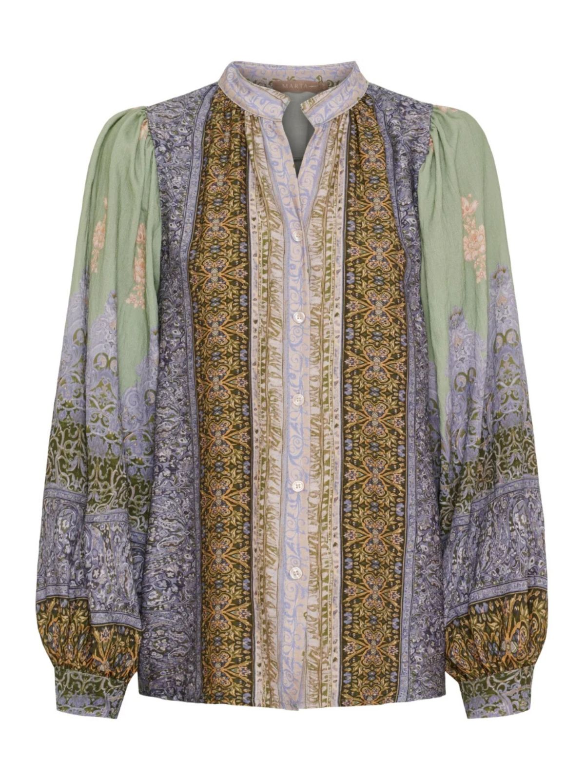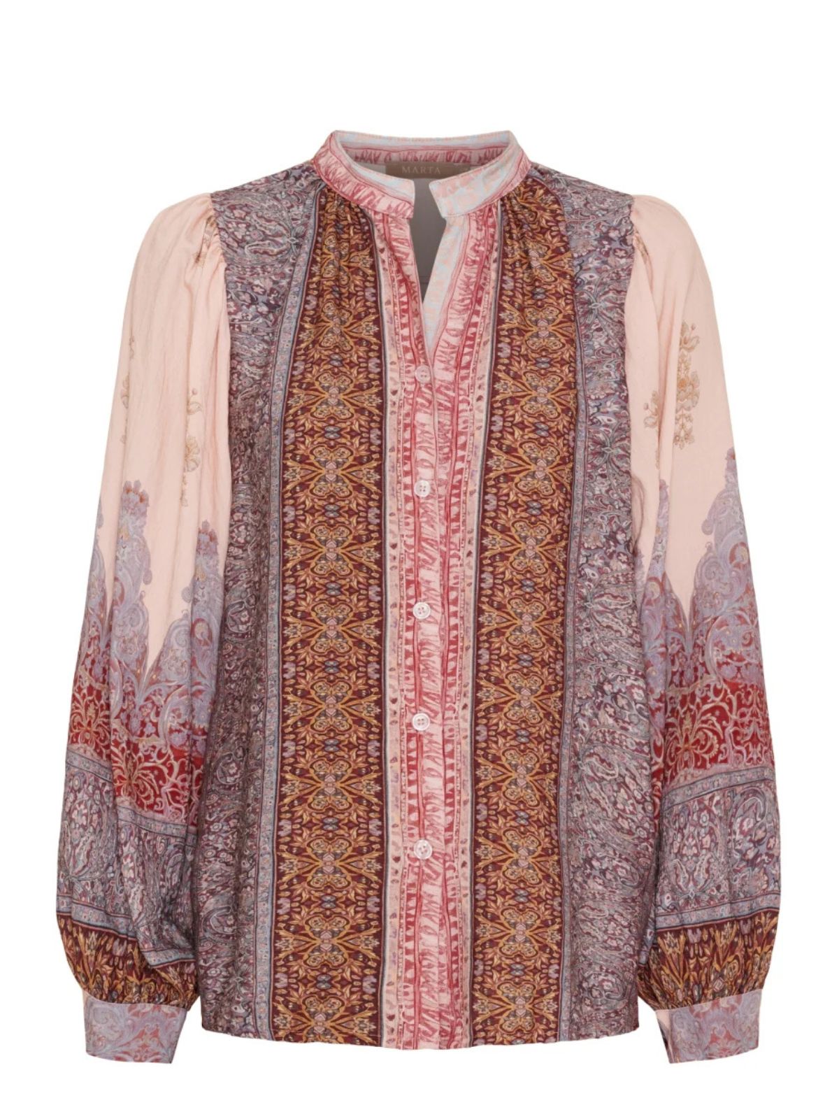 Elegant feminin bluse fra Marta Du Chateau i boheme stil i et smukt patchwork‑inspireret. Blusen har en rund hals med V-udsnit, knaplukning samt lange ballonærmer med bred manchet.