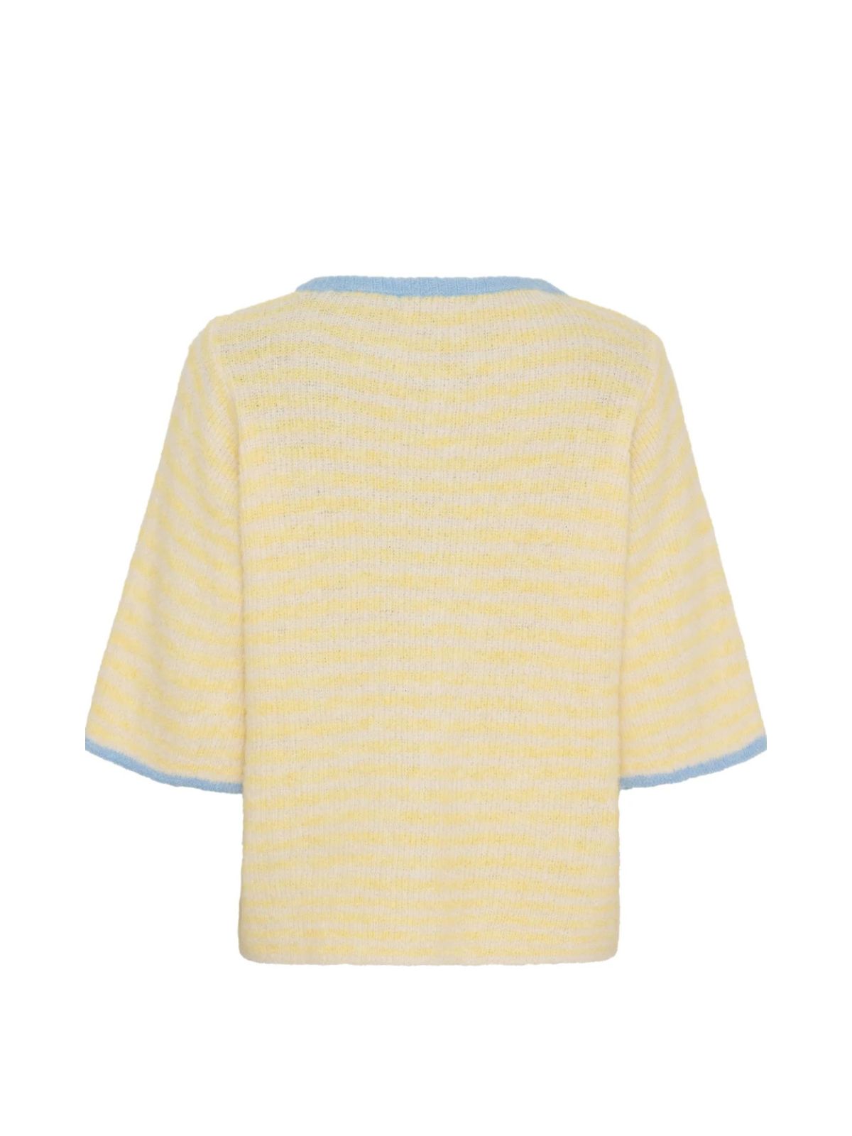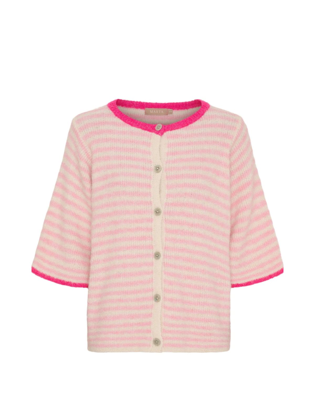 SUSANNE feminin strik cardigan med korte ærmer fra MARTA i friske farver og striber samt i smart design med rund hals , knaplukning samt dropskuldre og albuelange ærmer.S/M - Brystmål: 56 cm. - Længde: 61 cm.