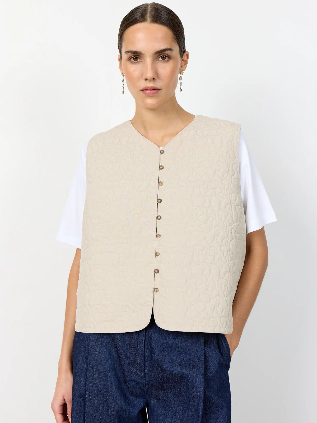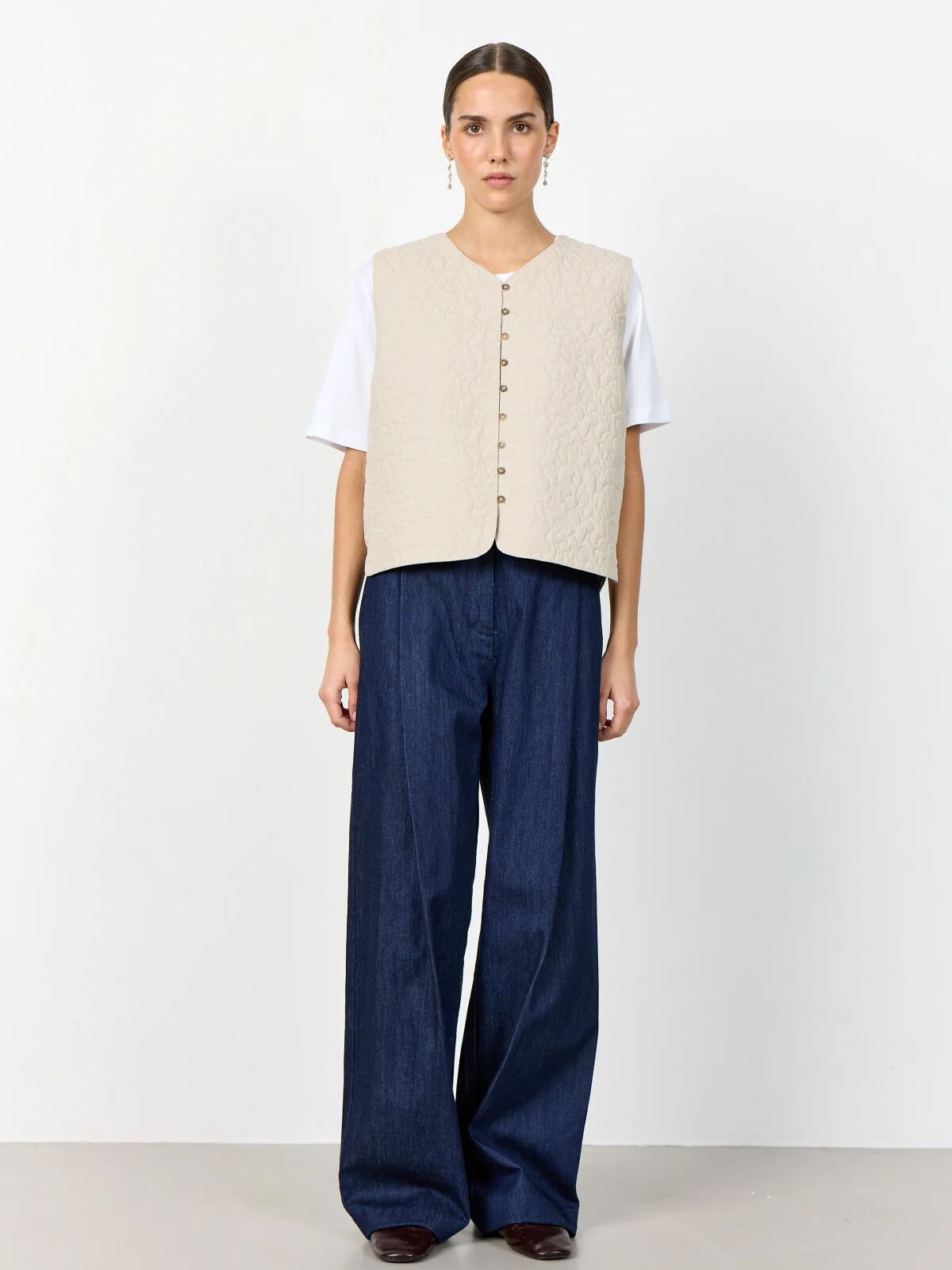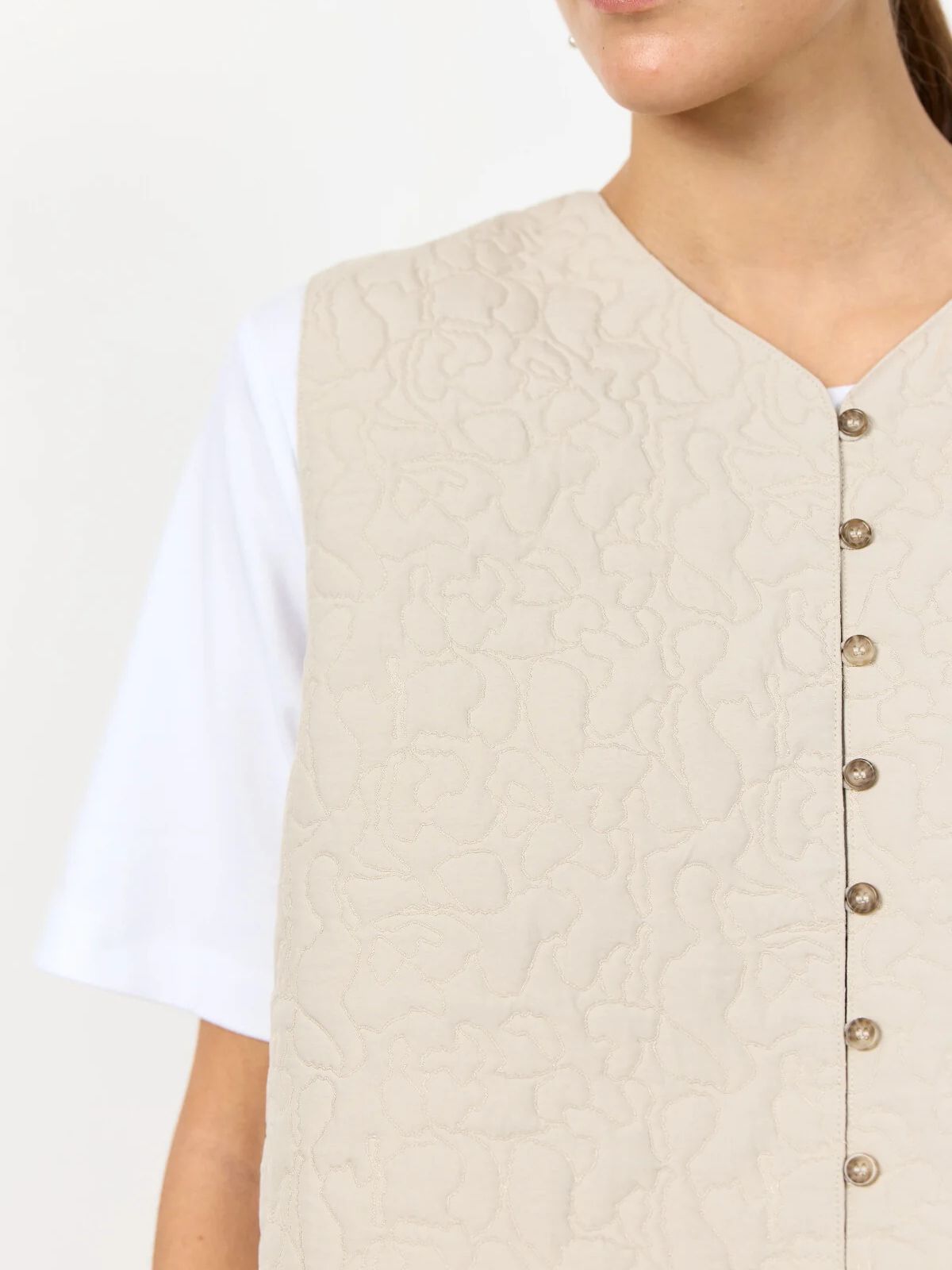 PIPPA 2 fra LEVETÉ ROOM er en sød vest fremstillet af 100 % polyester. Vesten har en sofistikeret quiltet tekstur, en klassisk V-hals-krave og stilfulde knapper foran. Brug den over en enkel skjorte for et afslappet og elegant look, der passer til forskellige lejligheder.Længde: ca. 59 cm målt i str. L