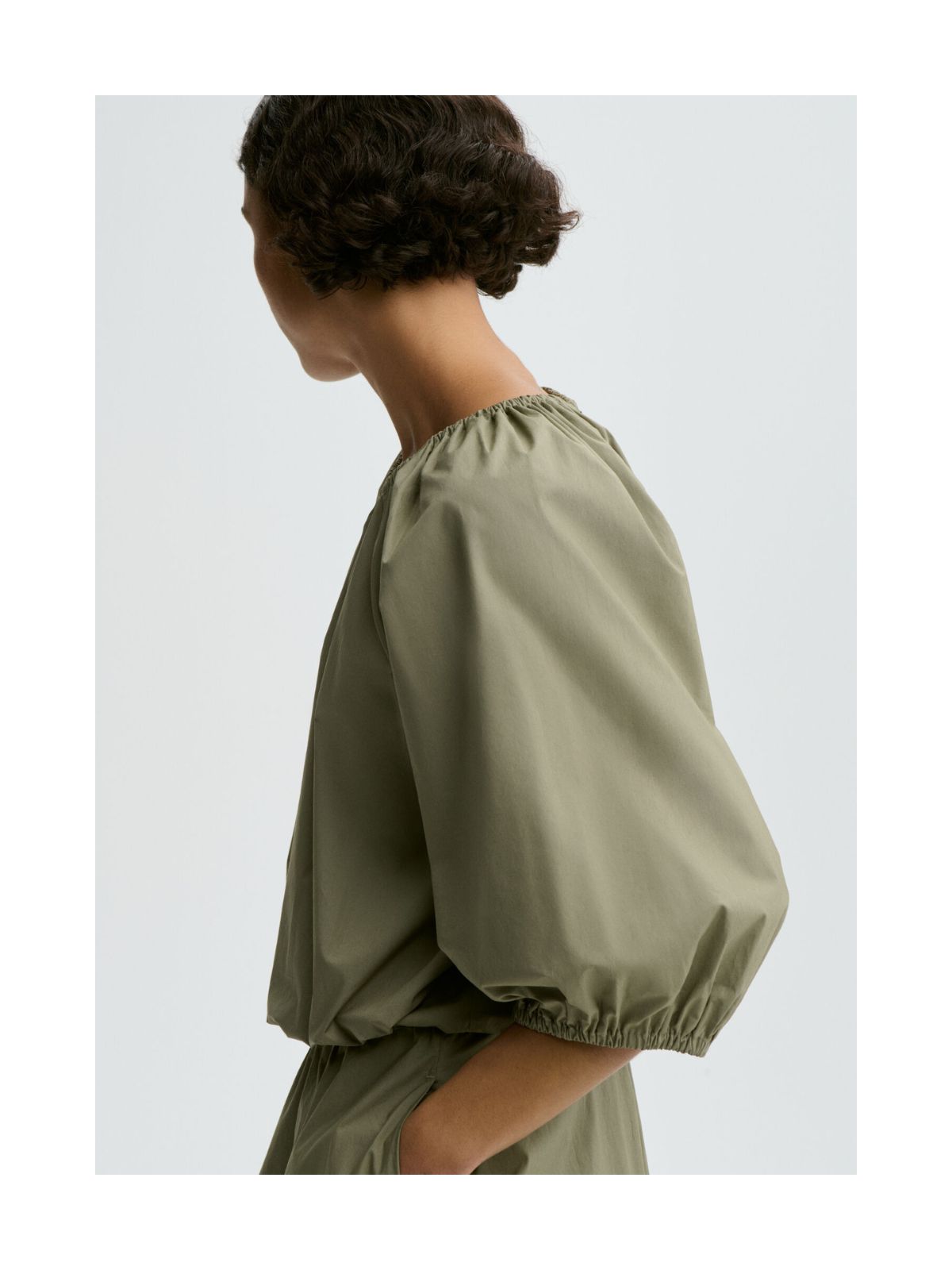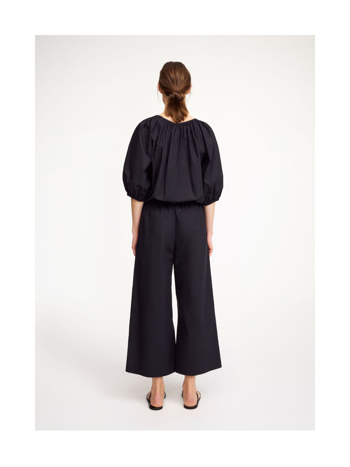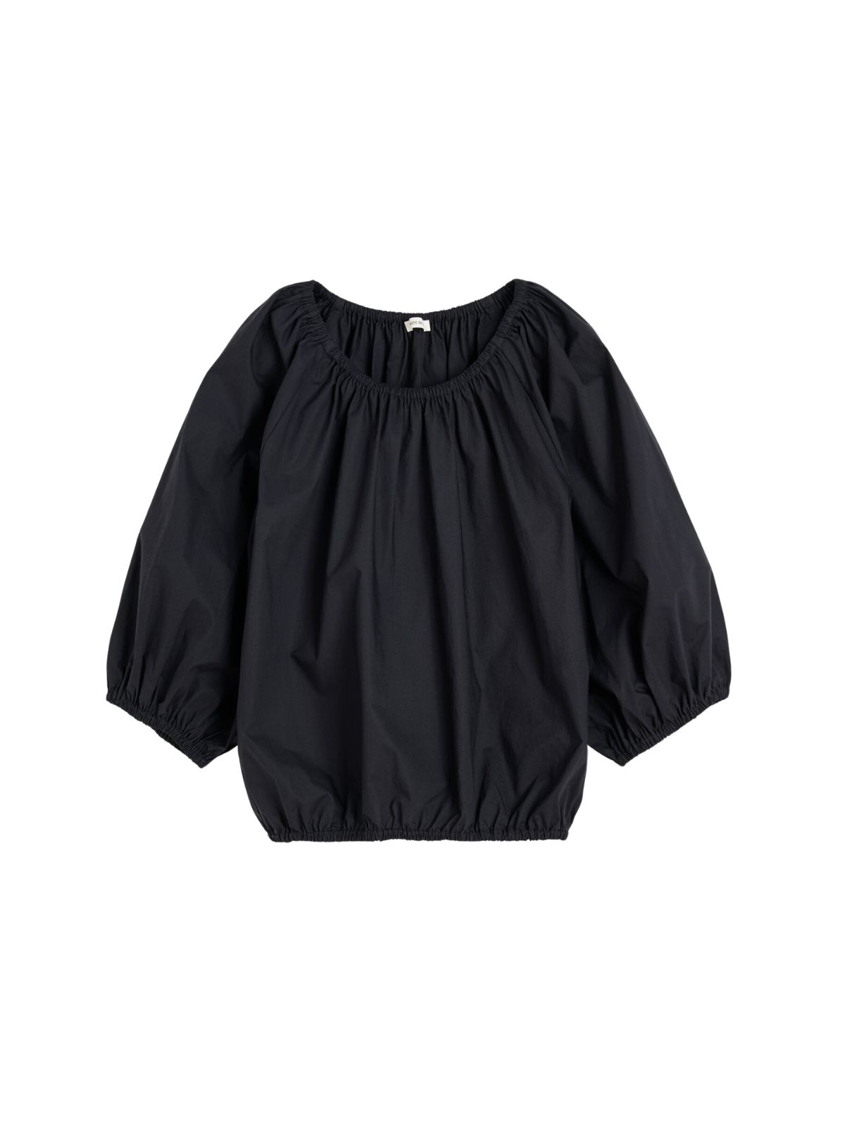 Elegant LeLow bluse fra By Malene Birger forener sprød økologisk bomuld med en afslappet, voluminøs silhuet. Blusen har elastikdetaljer i manchetter, hals og søm som giver mulighed for styling både med og uden skuldre – afhængigt af humør og anledning.Længde: ca. 60 cm
