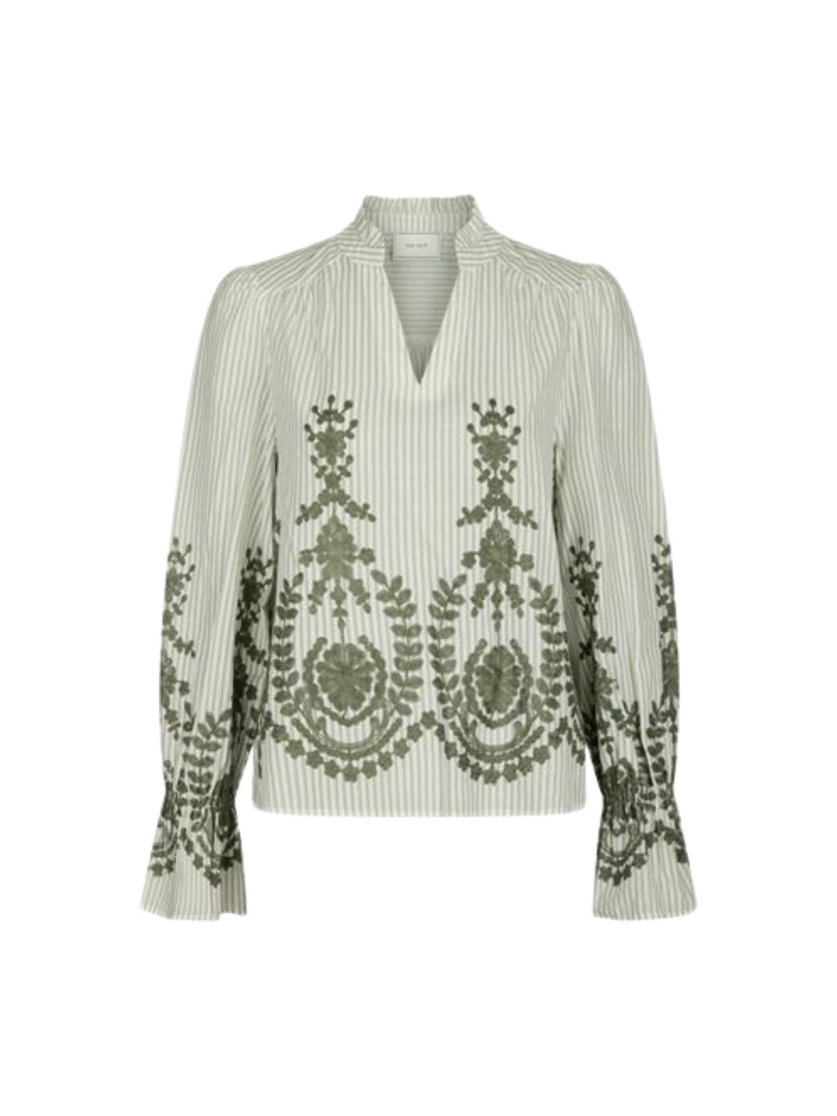 Langærmet bluse fra Neo Noir i grøn med V-udskæring og fine striber. Blusen har broderede detaljer, puf-effekt ved skuldrene og flæsekant i kraven, hvilket giver et feminint og moderne look.