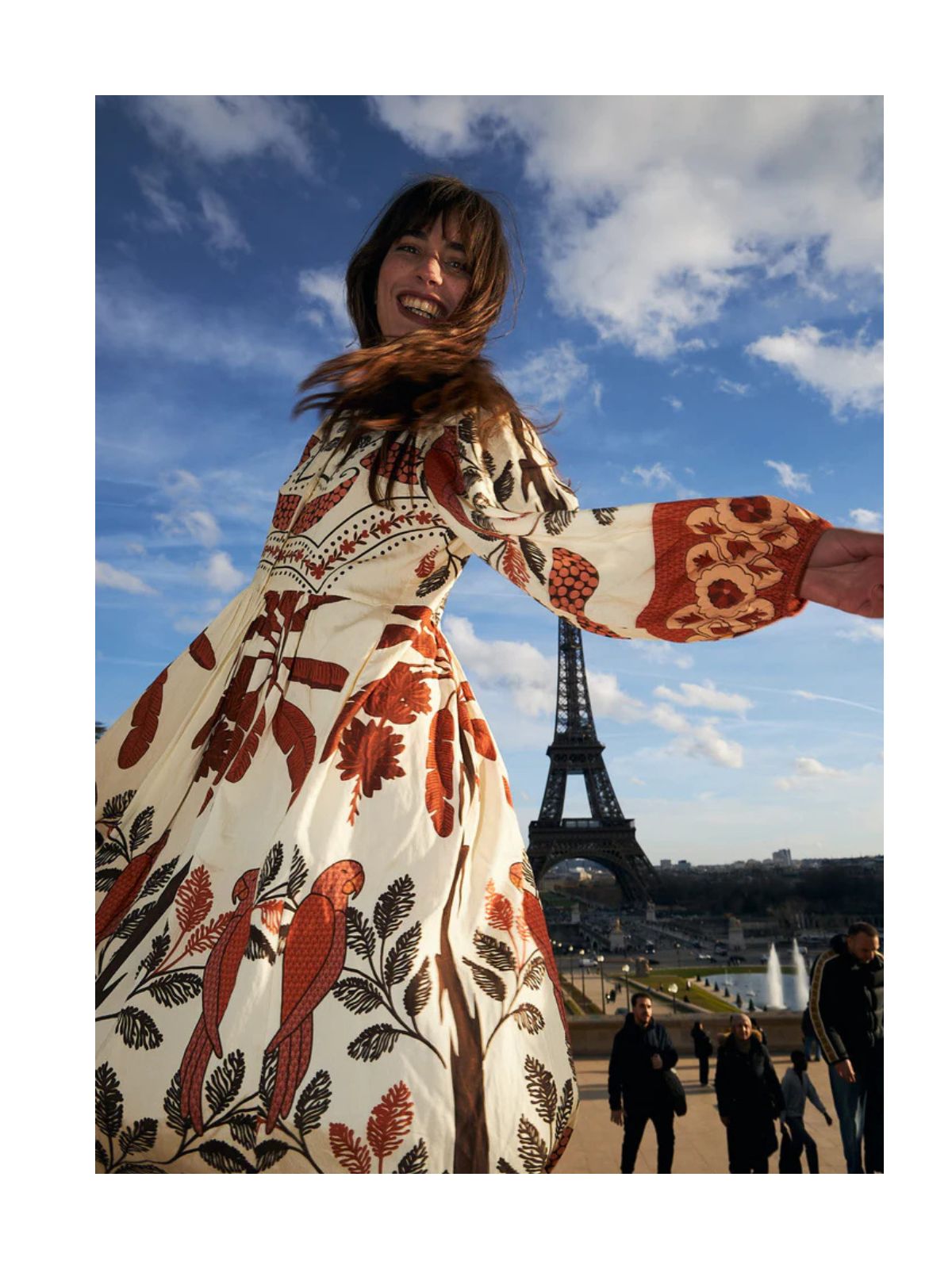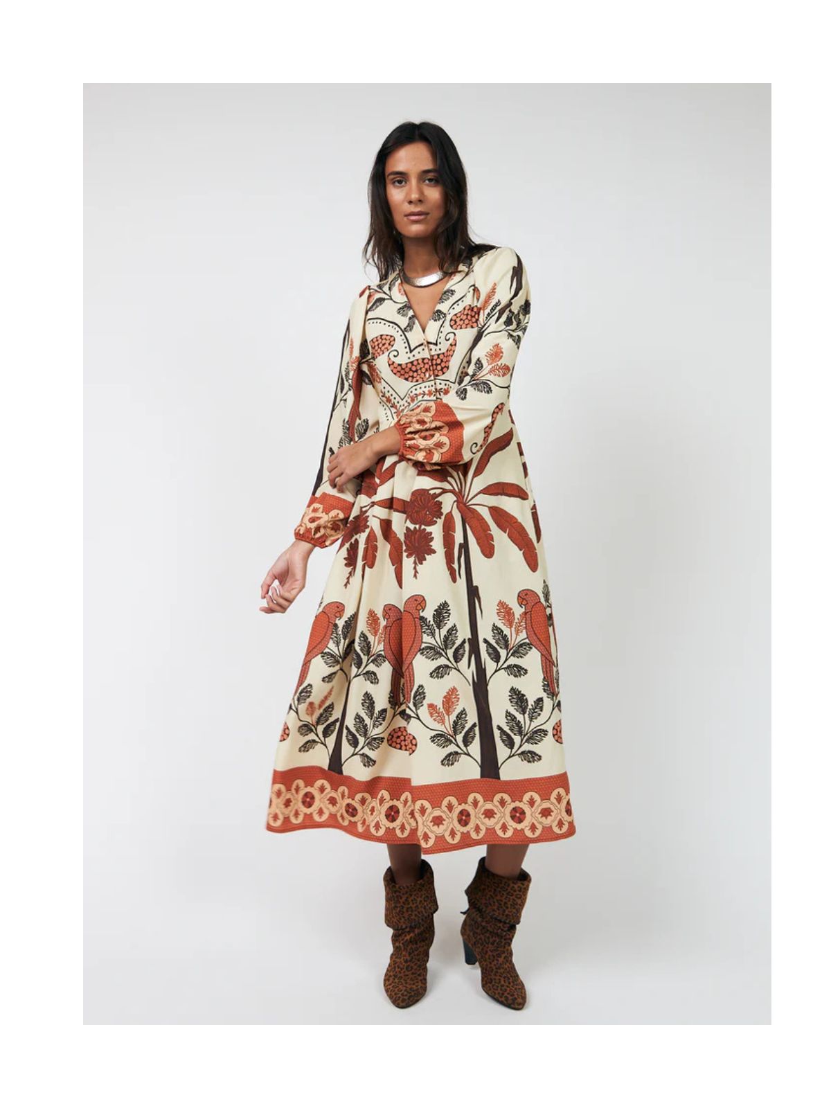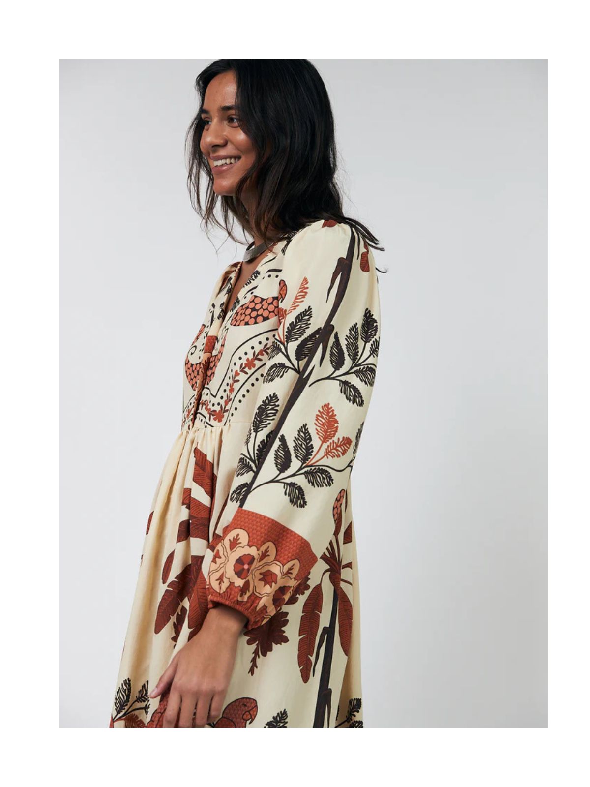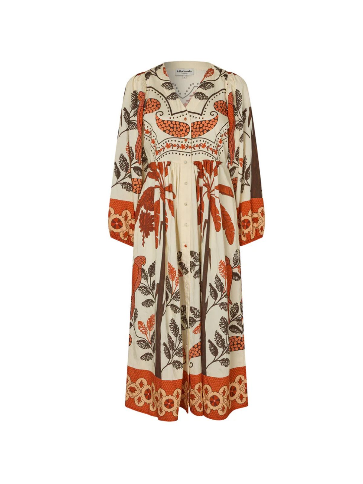Raffineret SaraiL kjole fra LOLLYS LAUNDRY er en drømmende og kunstnerisk kjole i varme farver og et detaljerigt print. Kjolen er bohemeinspireret og har en helt unik charme. Silhuetten er løs og feminin med knaplukning foran og et let fald, der gør den komfortabel at bruge både til hverdag og fest.Længde: 130 cm - målt i str. M