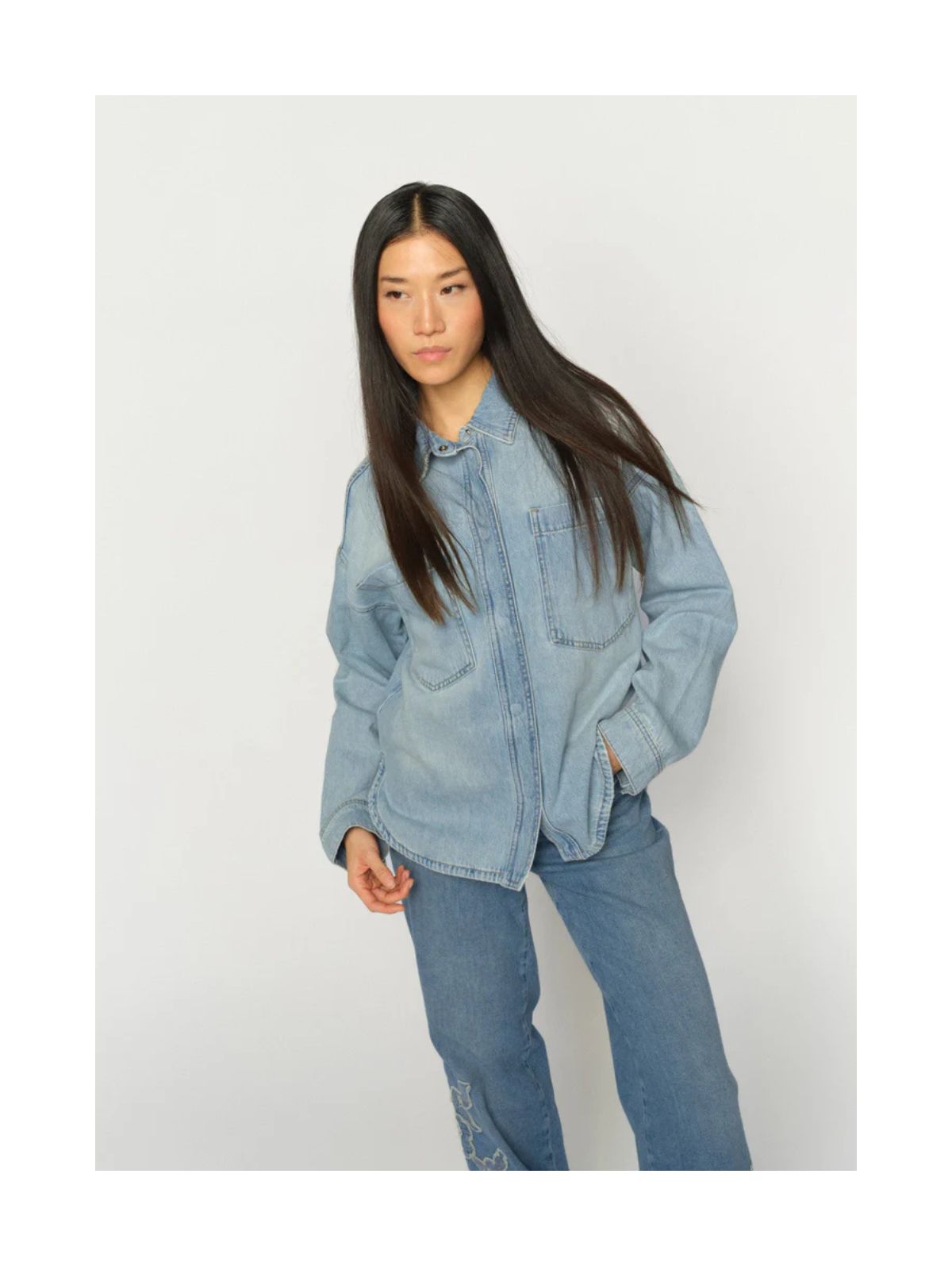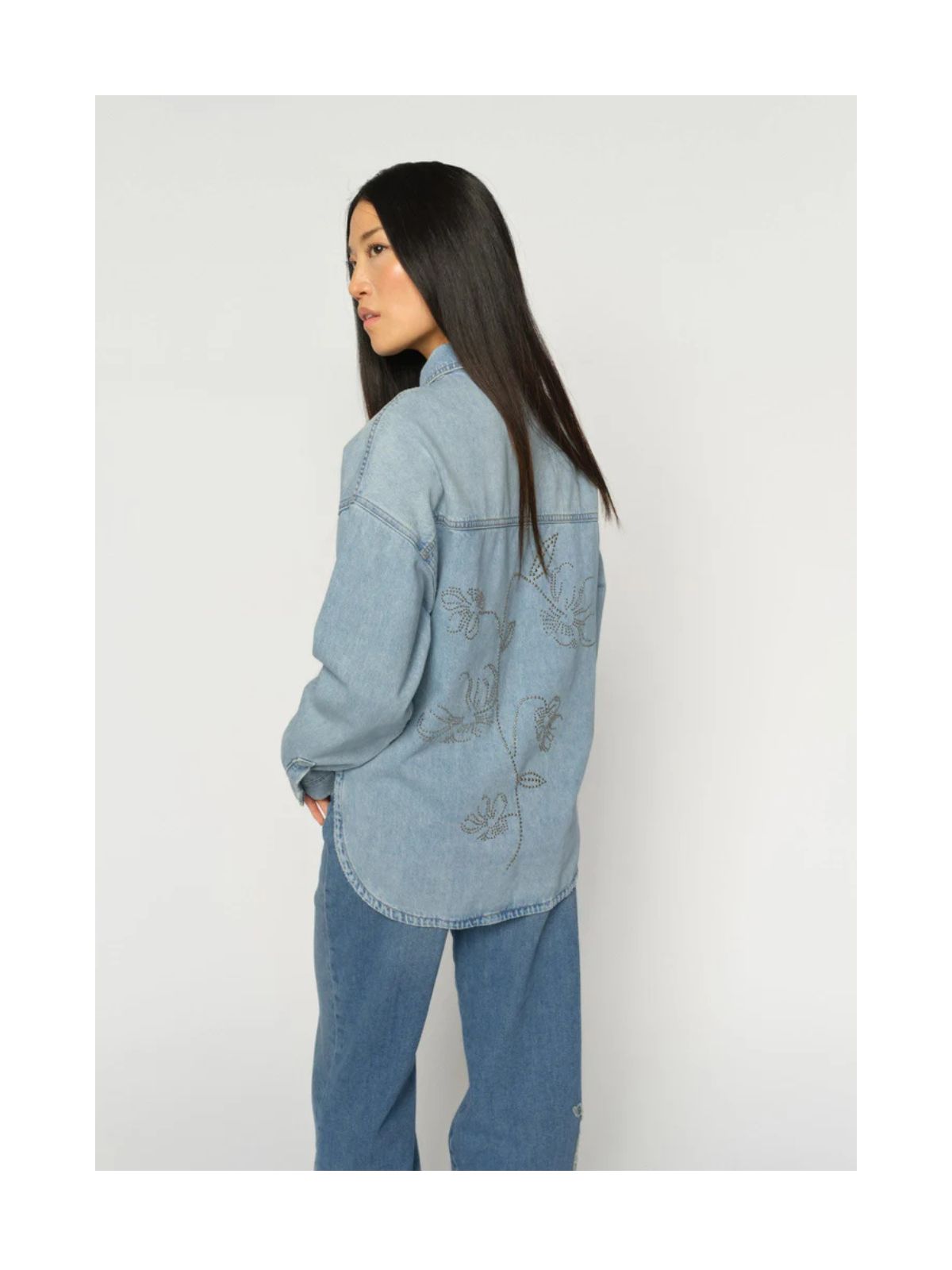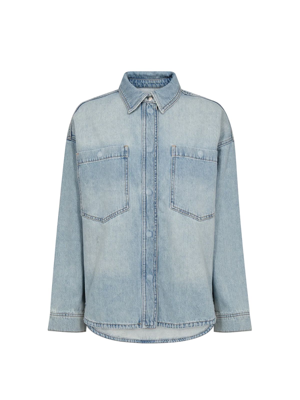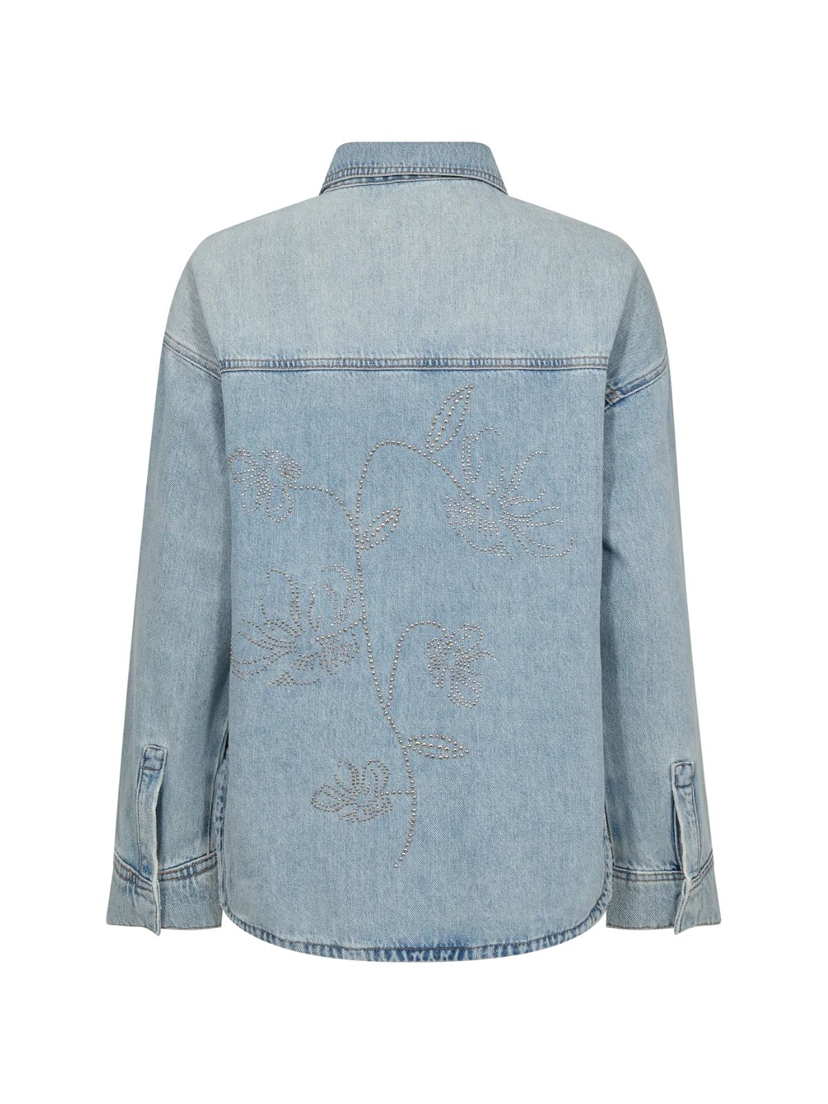 Tidløs klassisk denim skjorte fra MOS MOSH med et feminint twist. Denim skjorten er designet i en afslappet pasform med klassisk krave og knaplukning og med et fint smykkesten blomsterbroderi på ryggen, som tilfører et diskret, men charmerende touch. Perfekt over en T-shirt eller stylet med jeans for et chikt denim-on-denim look.Længde: ca. 70 cm