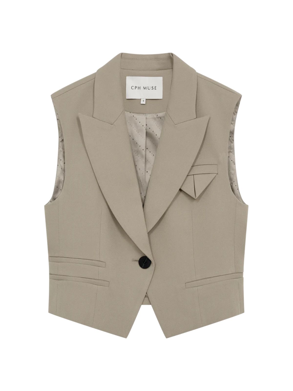 TAILOR-WAISTCOAT er en skarpt skræddersyet vest fra COPENHAGEN MUSE i en struktureret vævet kvalitet. Markante, brede skuldre og reverskrave skaber en stærk, arkitektonisk silhuet. Den rene, ærmeløse konstruktion fremhæver den definerede skulderlinje, mens en enkel knaplukningunderstreger det stringente udtryk. En justerbar strop bagpå giver mulighed for at tilpasse pasformen.Længde: ca. 55 cm