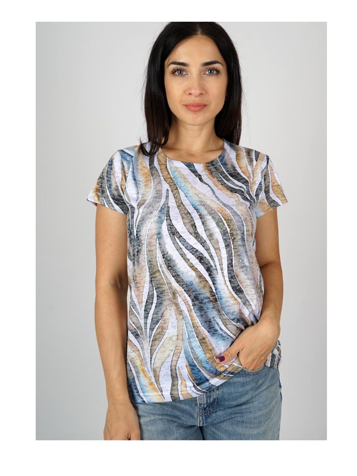 Elegant bluse fra Tekstil Karntner med smuk farvekombination samt dekorative smykkesten. Blusen har rund hals og korte ærmer.Længde: ca. 60 cm