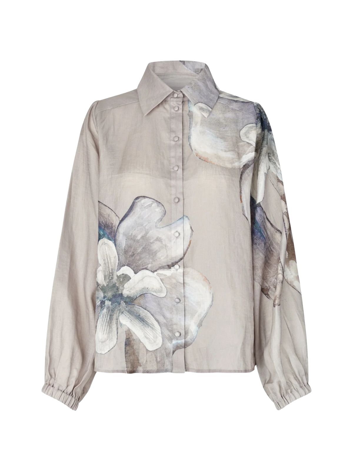 Denne bluse har en almindelig pasform og fyldige, voluminøse ærmer, der giver et feminint og elegant udtryk. Det fine hørstof føles let og eksklusivt, mens printet med store, maleriske blomster tilfører et dramatisk og stilfuldt præg. Elastikmanchetterne understreger det afslappede look og sikrer god komfort.