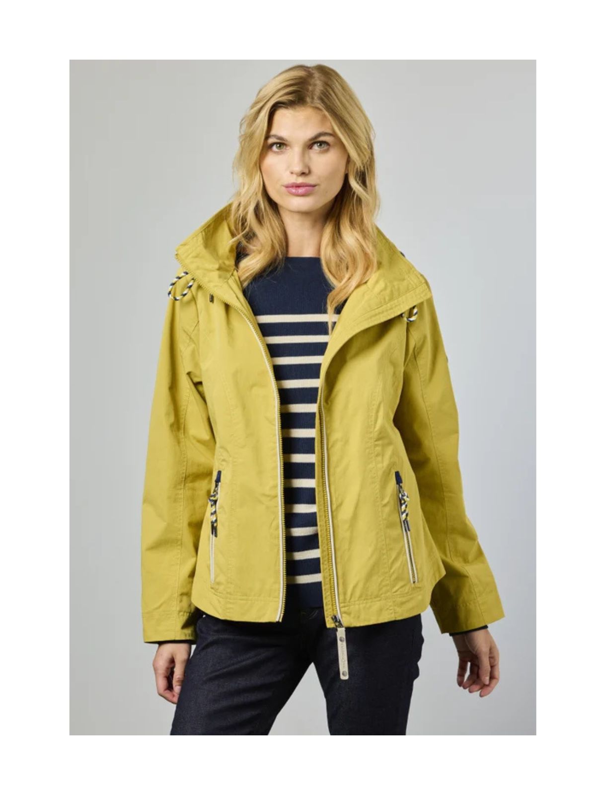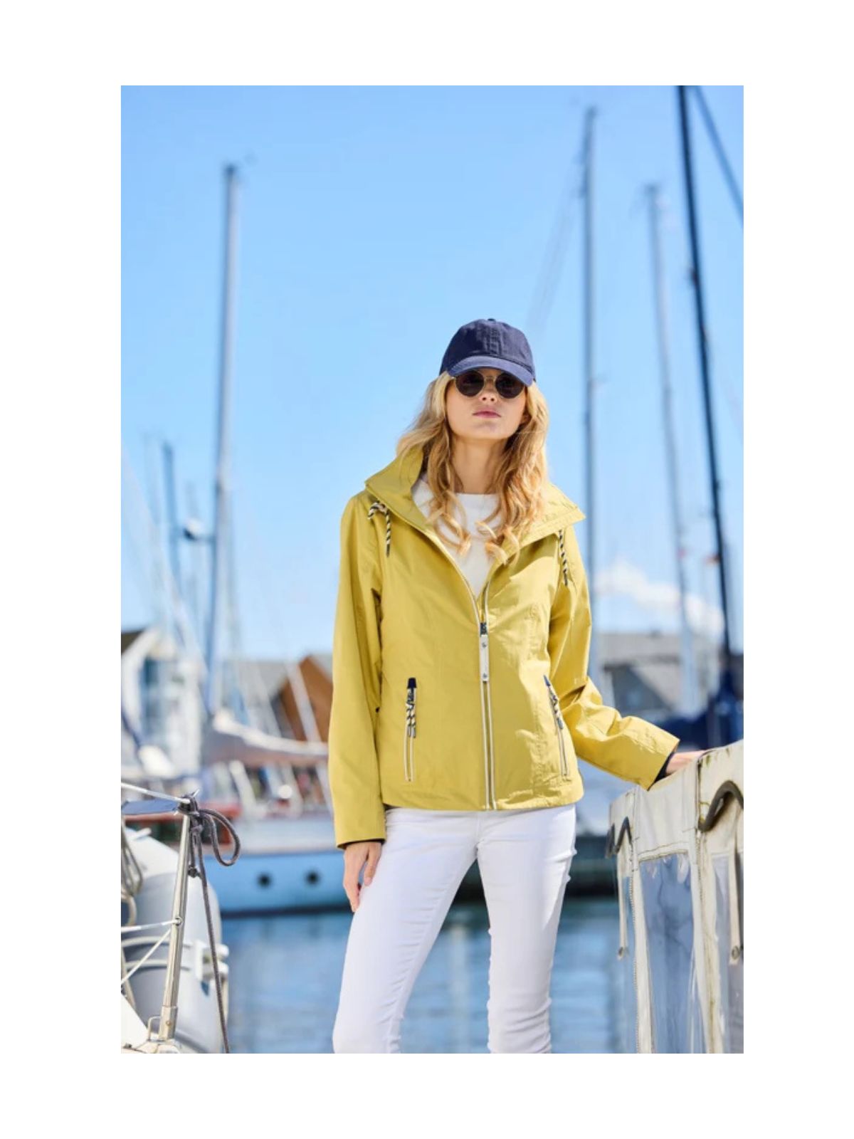 Navy- og hvid piping fremhæver det maritime udtryk, mens den aftagelige hætte med justerbar snøre tilføjer funktionalitet og fleksibilitet.