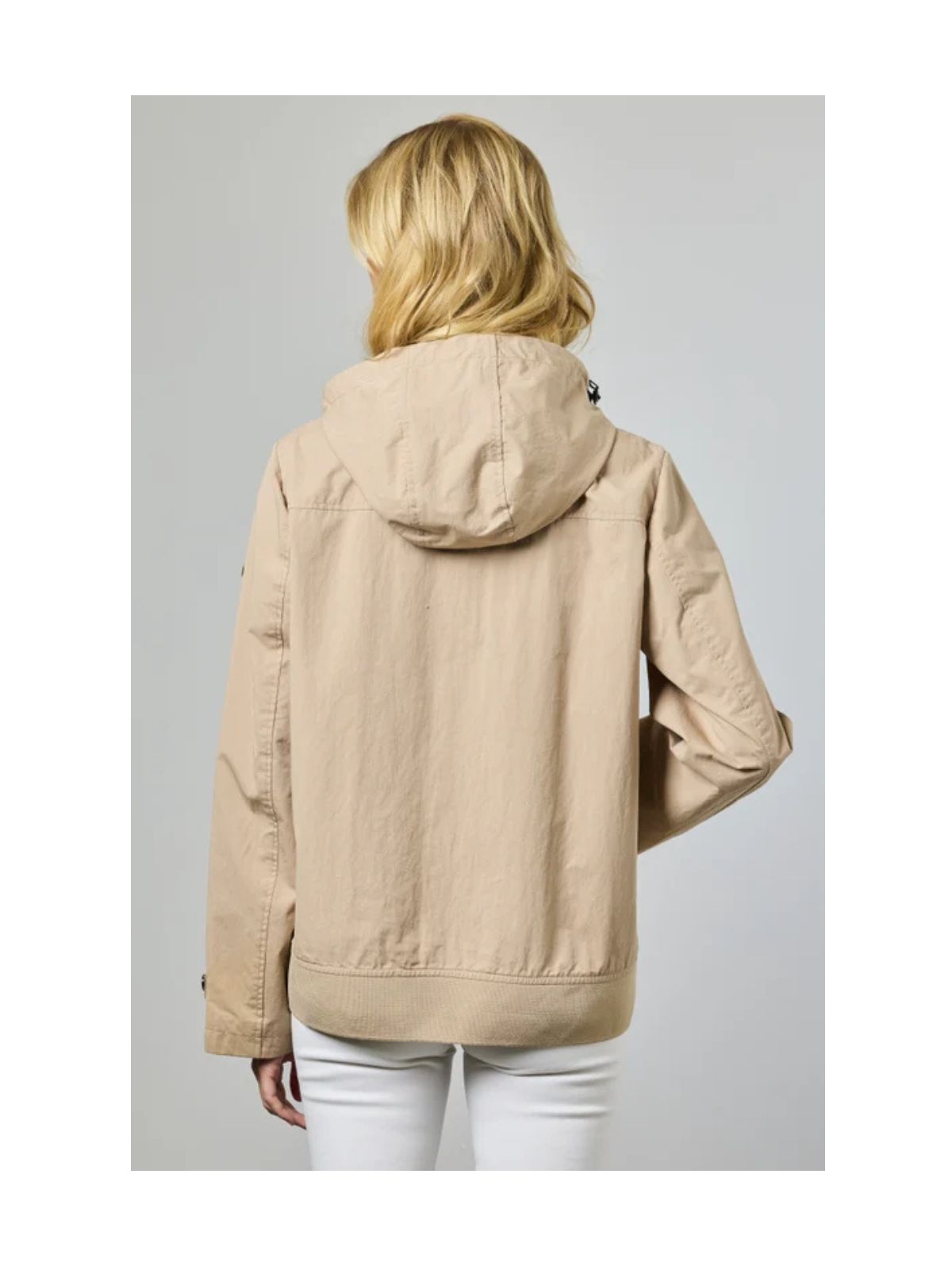 Den faste hætte tilfører et afslappet udtryk og praktisk beskyttelse, mens den ribbede kant bagpå sikrer god komfort og pasform.