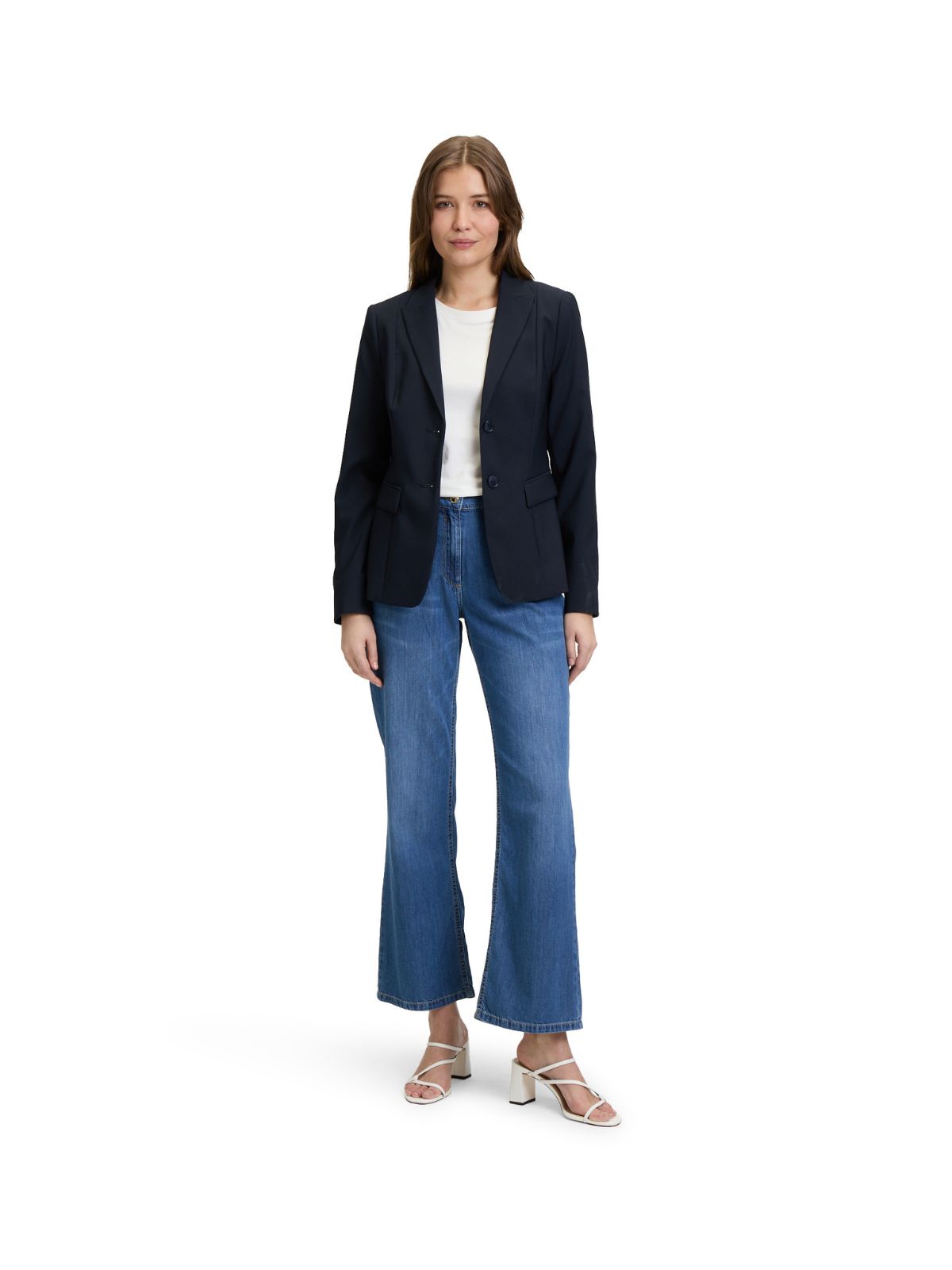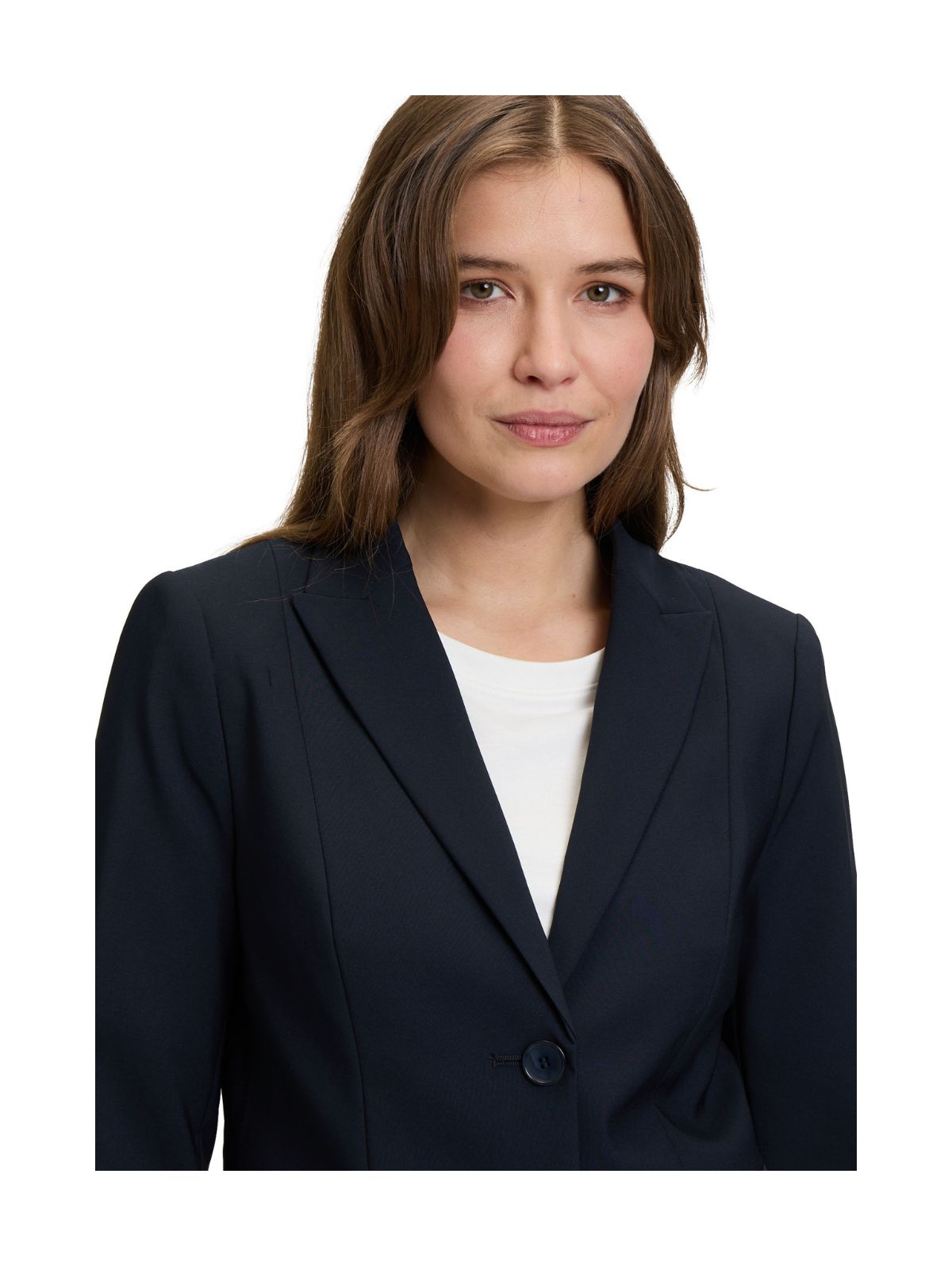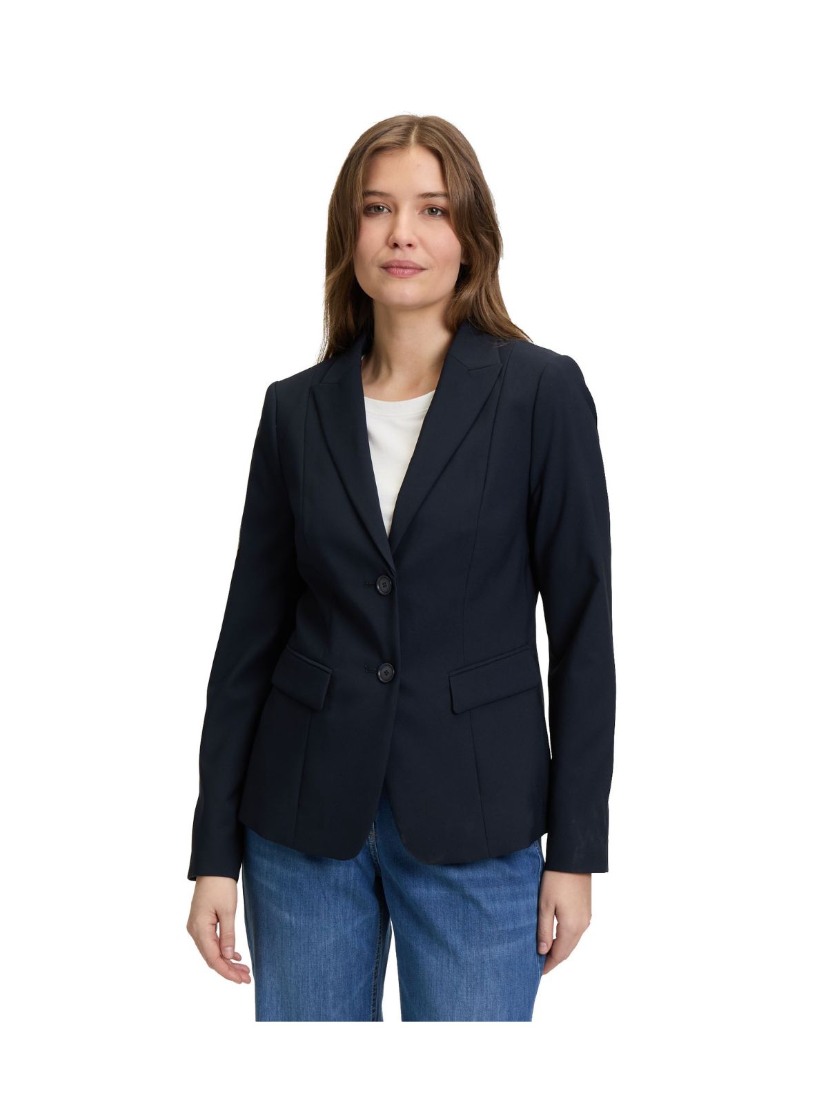 Klassisk blazer jakke fra Betty Barclay i let taljeret design med 2 knapper. Blazer jakken har et pænt revers samt dyb udsnit og stiklommer med lommeklap. En tidløs model passende til mange anledninger.Længde: ca. 64 cm