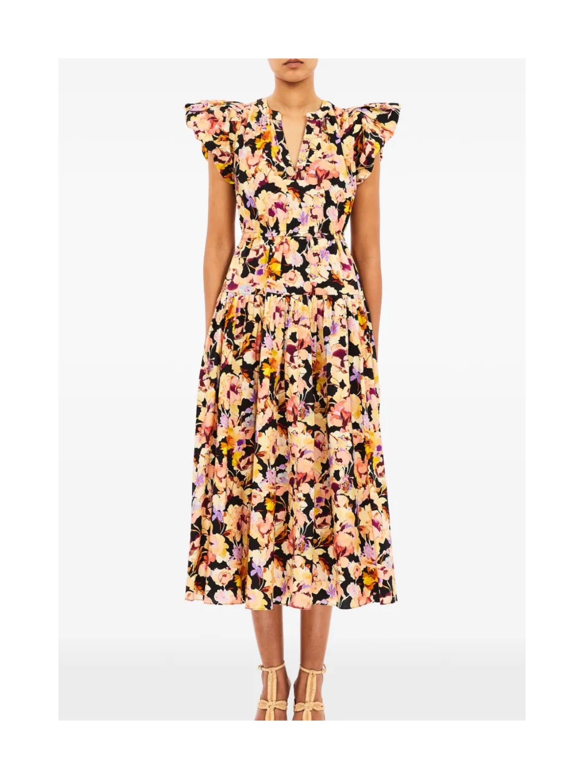 Smuk kjole med lyserød, sort og flerfarvet blomsterprint. V-hals og mellemlang længde, lavet i 100% bomuld for en behagelig pasform. Perfekt til festlige lejligheder.