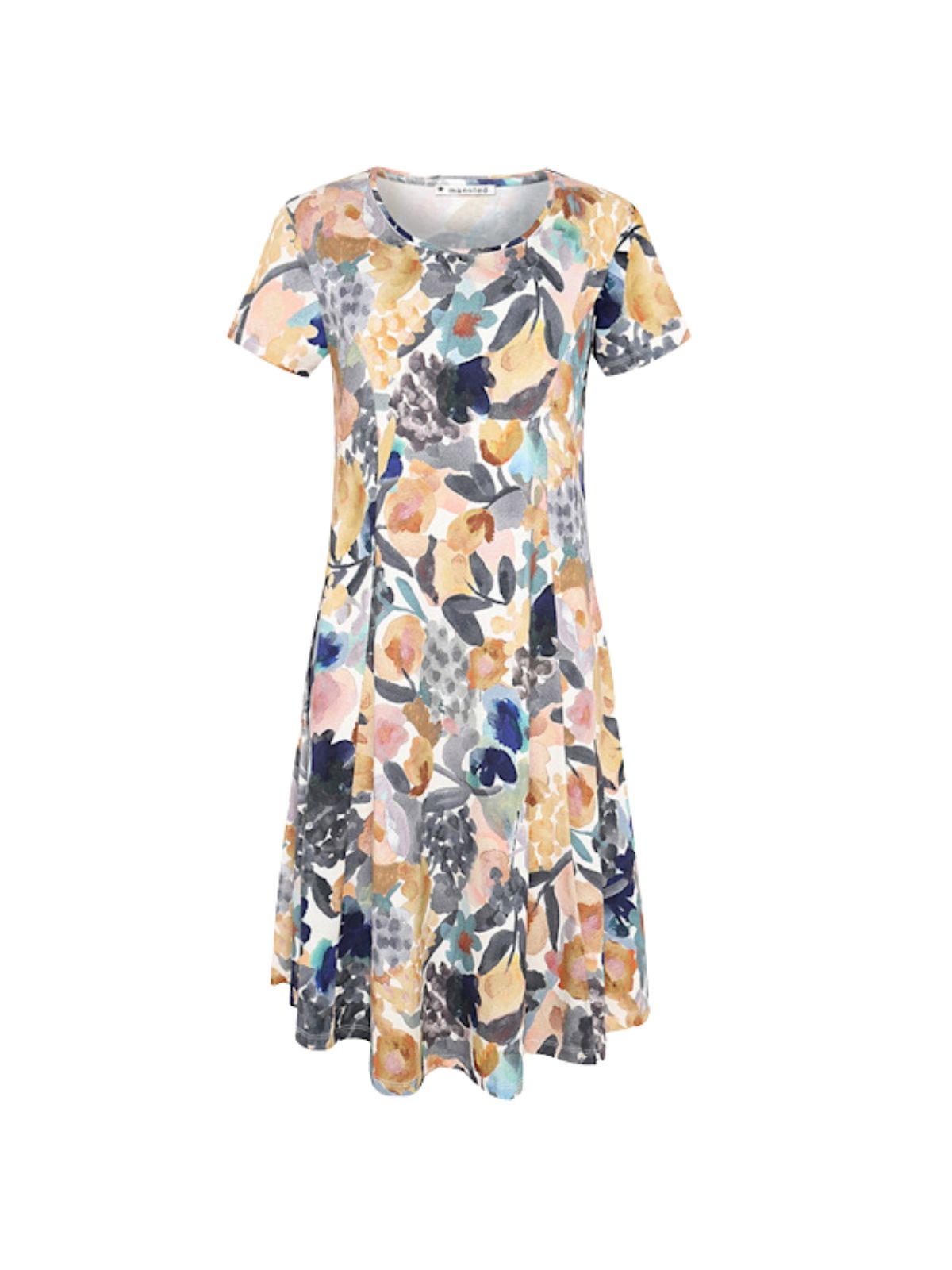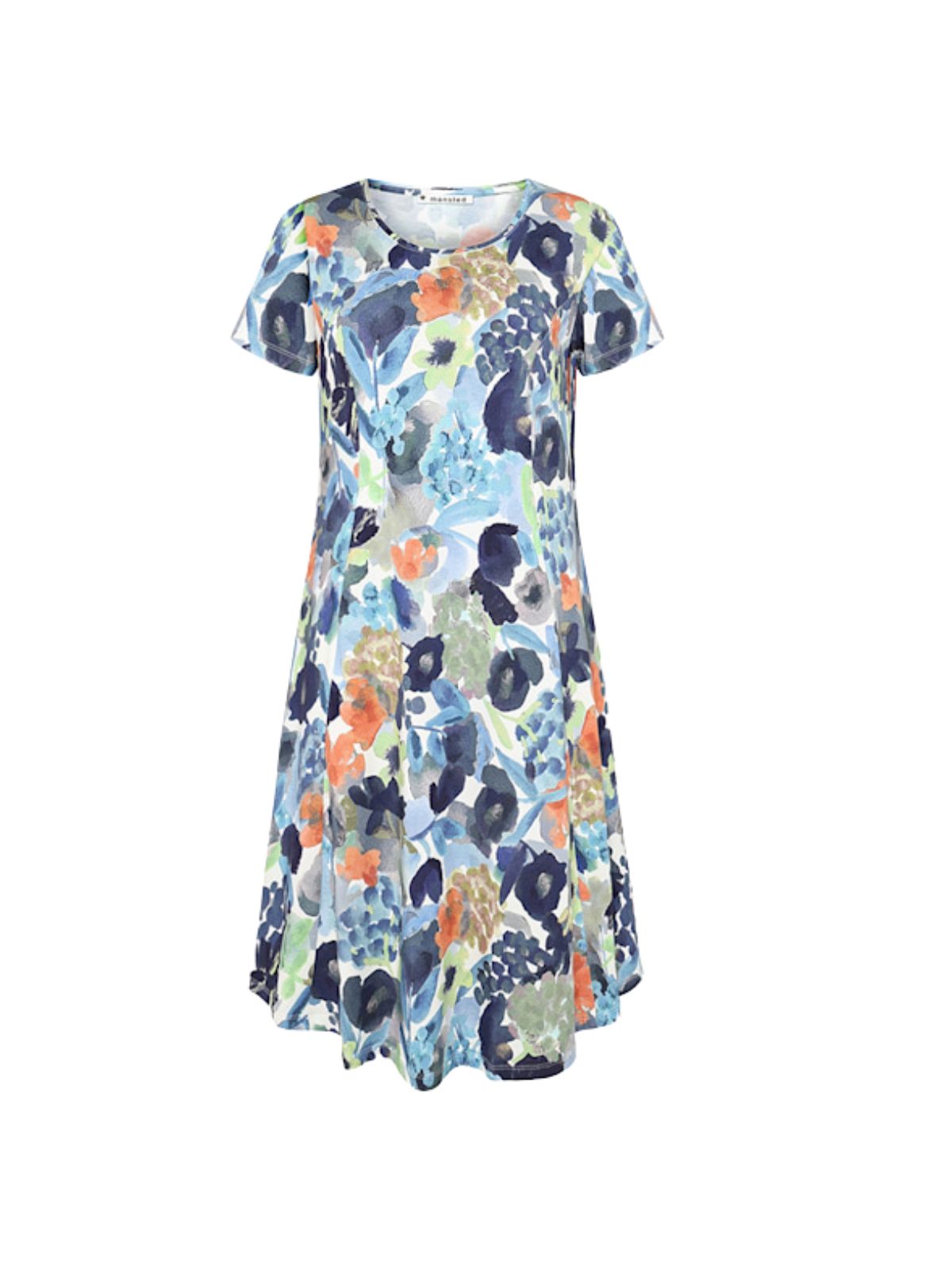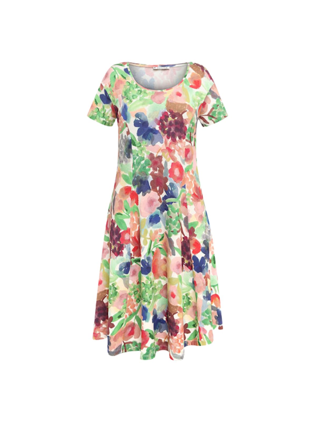 Kortærmet kjole i blød blanding af økologisk bomuld, modal og elastan med en figursyet overdel og A-formet skørt. Kjolen har prinsesseindlæg og et digitalt print med et håndmalet vandfarvehave-motiv.