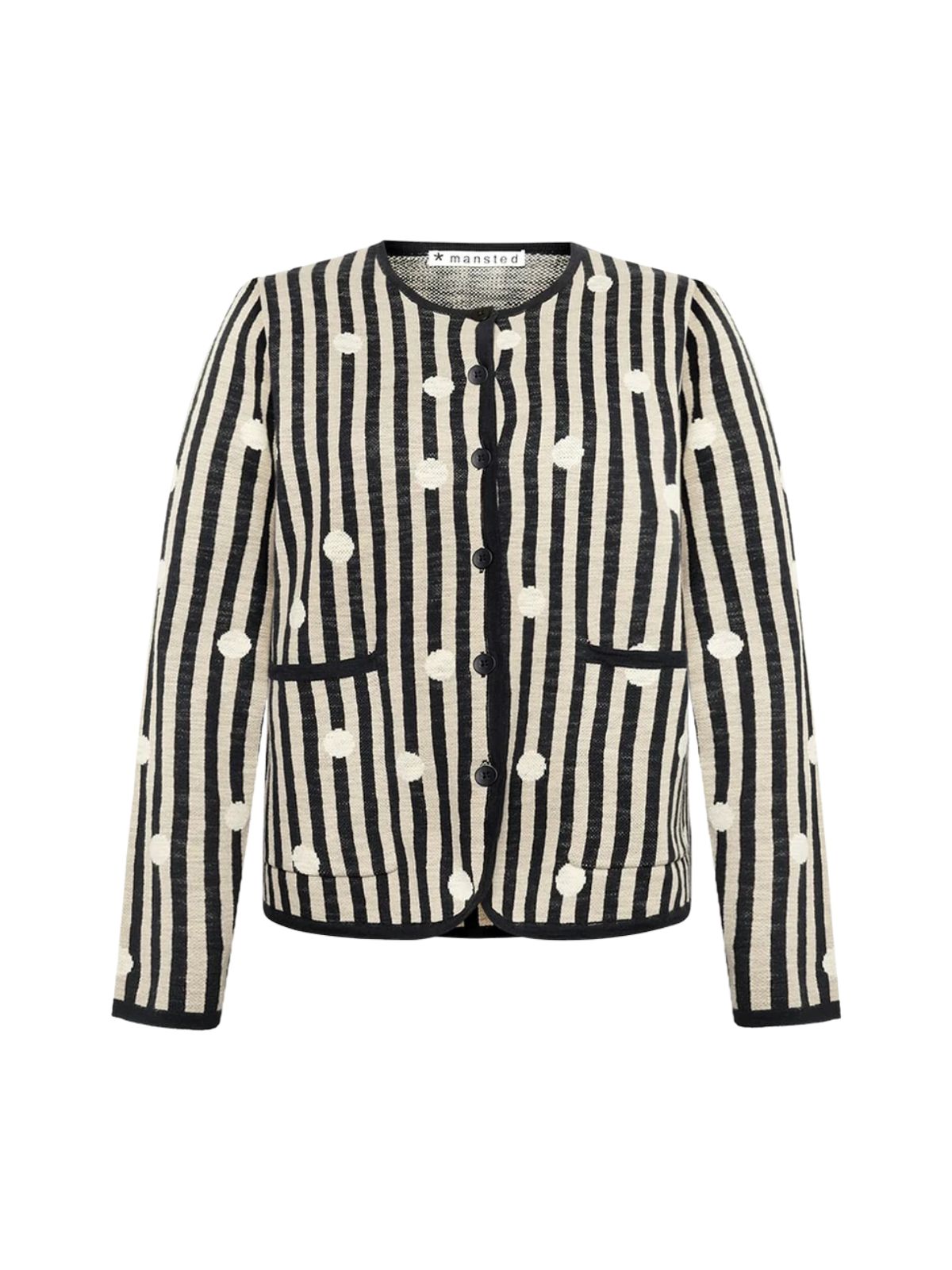Lækker jakke i 100% økologisk bomuld med jacquard dobbeltstrik i striber og prikker. Jakken har en regular fit, lommer foran og knapper af corozo-nødder. Perfekt som let forårsjakke eller til kølige sommerdage.