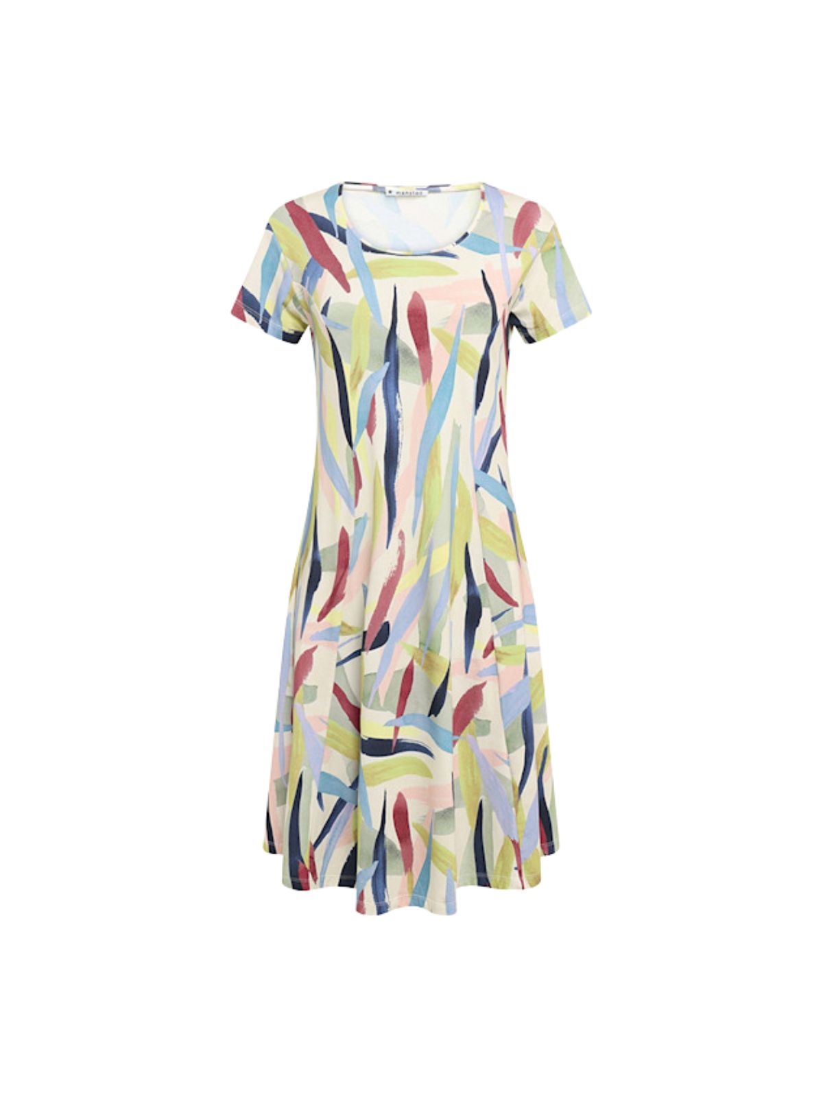 Kortærmet kjole i blød blanding af økologisk bomuld, modal og elastan med figursyet overdel og A-formet skørt. Kjolen har prinsesseindlæg og et digitalt print med håndmalede blade og penselstrøg.