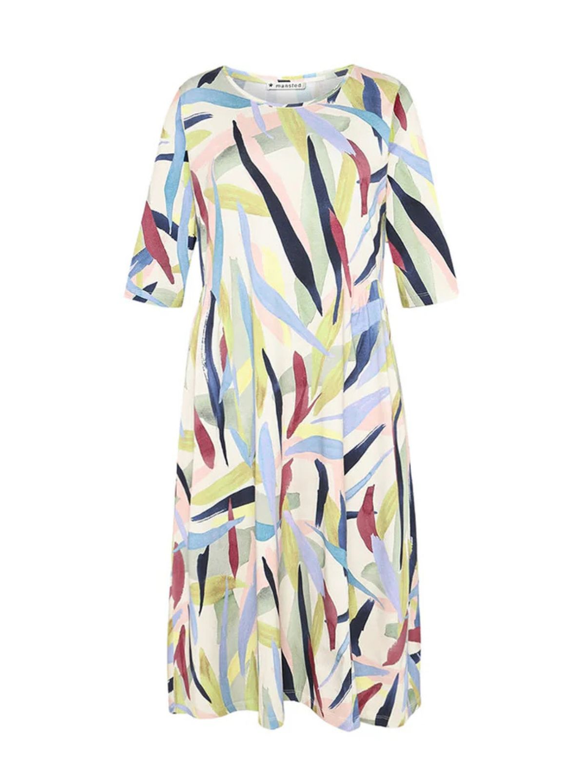 Denne kjole kombinerer komfort med et kunstnerisk udtryk gennem det digitale print med håndmalede blade og penselstrøg. Den har rynk i taljen, der skaber en feminin silhuet, midtlange ærmer og praktiske sidelommer. Den bløde blanding af økologisk bomuld, modal og elastan giver en behagelig pasform med let stretch, hvilket gør kjolen ideel til både hverdag og pænere anledninger.
