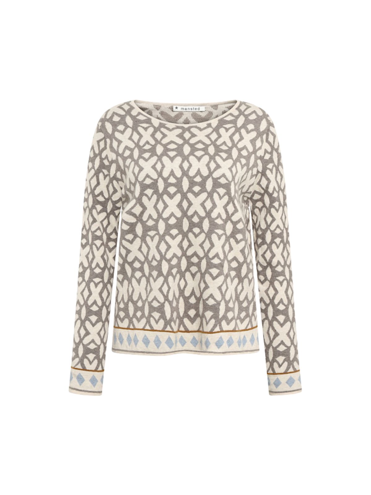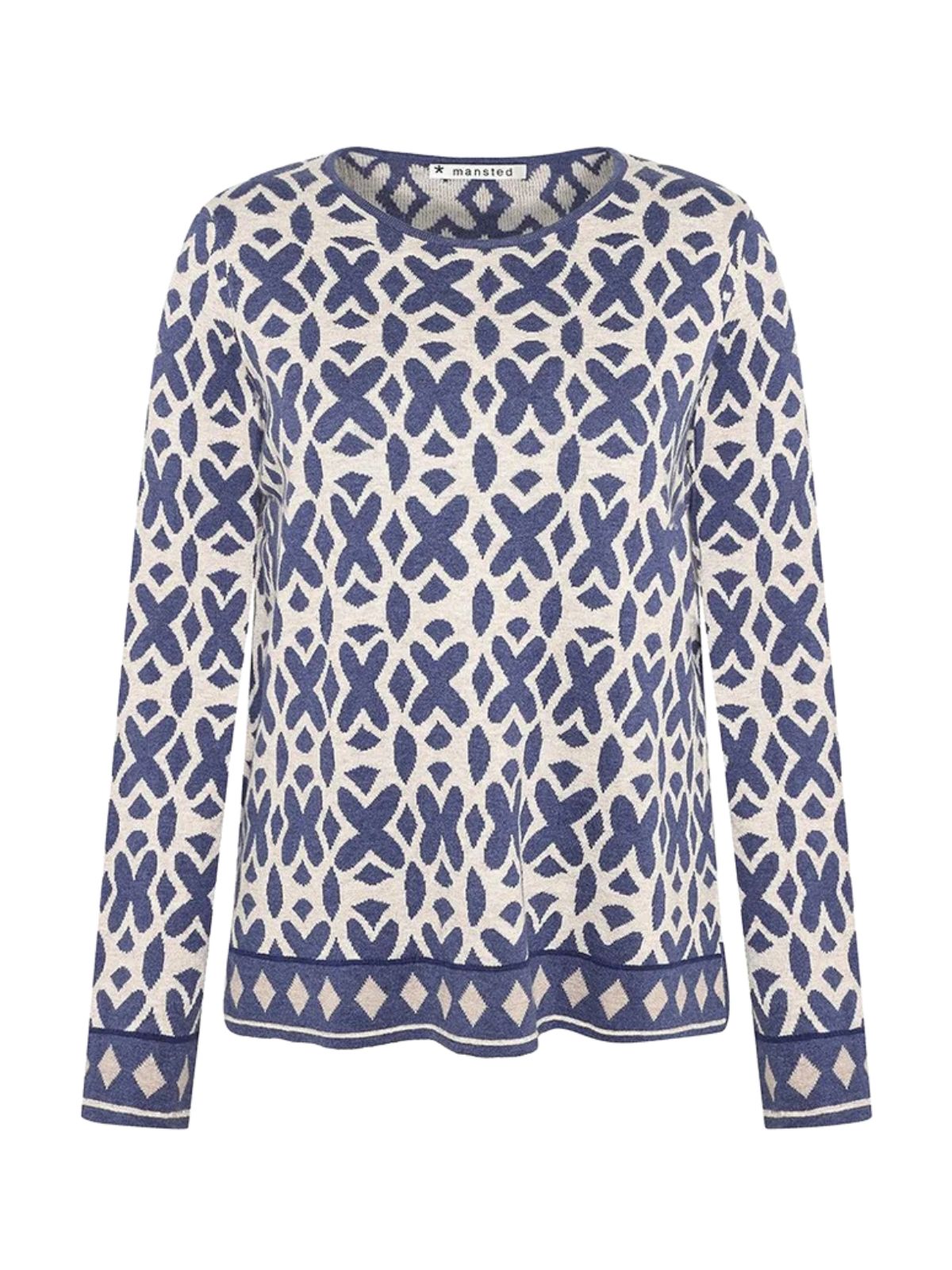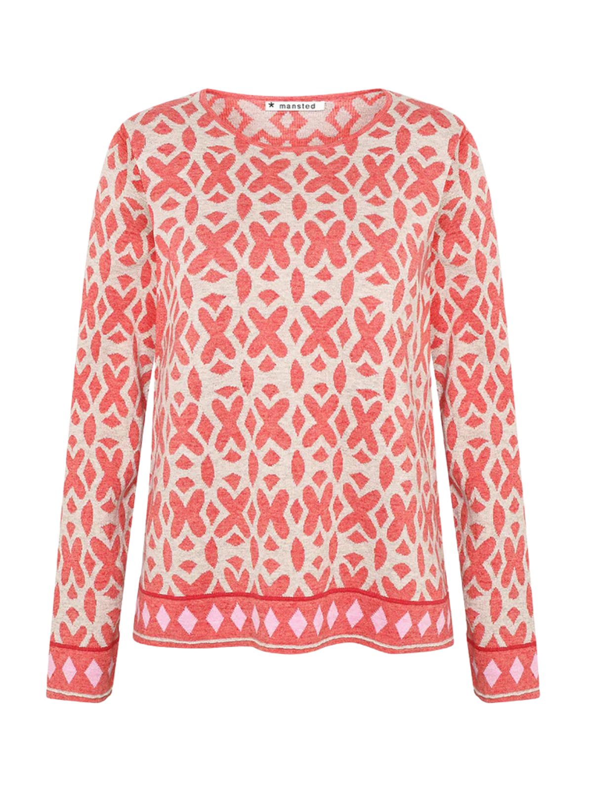 Pullover i 100% økologisk bomuld med finstrik og ladder back jacquard. Den har relaxed fit, slids ved sidesømmene og et grafisk blomsterprint med tuck-striber samt diamantdetaljer på ærmekanter og bund.
