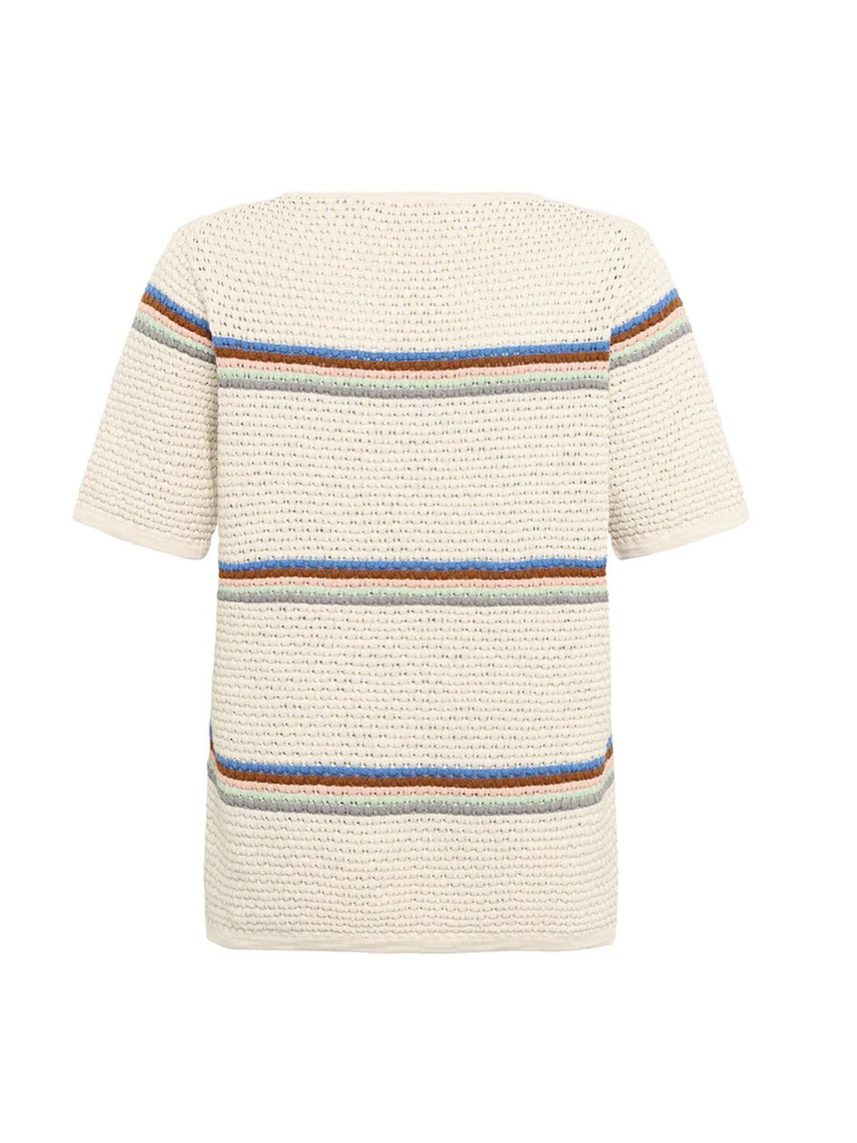 Denne strukturerede T-shirt kombinerer enkelhed med et stilfuldt twist. Den er fremstillet i 100% økologisk bomuld slub med en fin pointelle-strik og vævestruktur, hvilket giver et levende og interessant udtryk. T-shirten har korte ærmer og regular fit, og fås i en version med flerfarvede striber, der tilfører farve og liv til ethvert outfit.