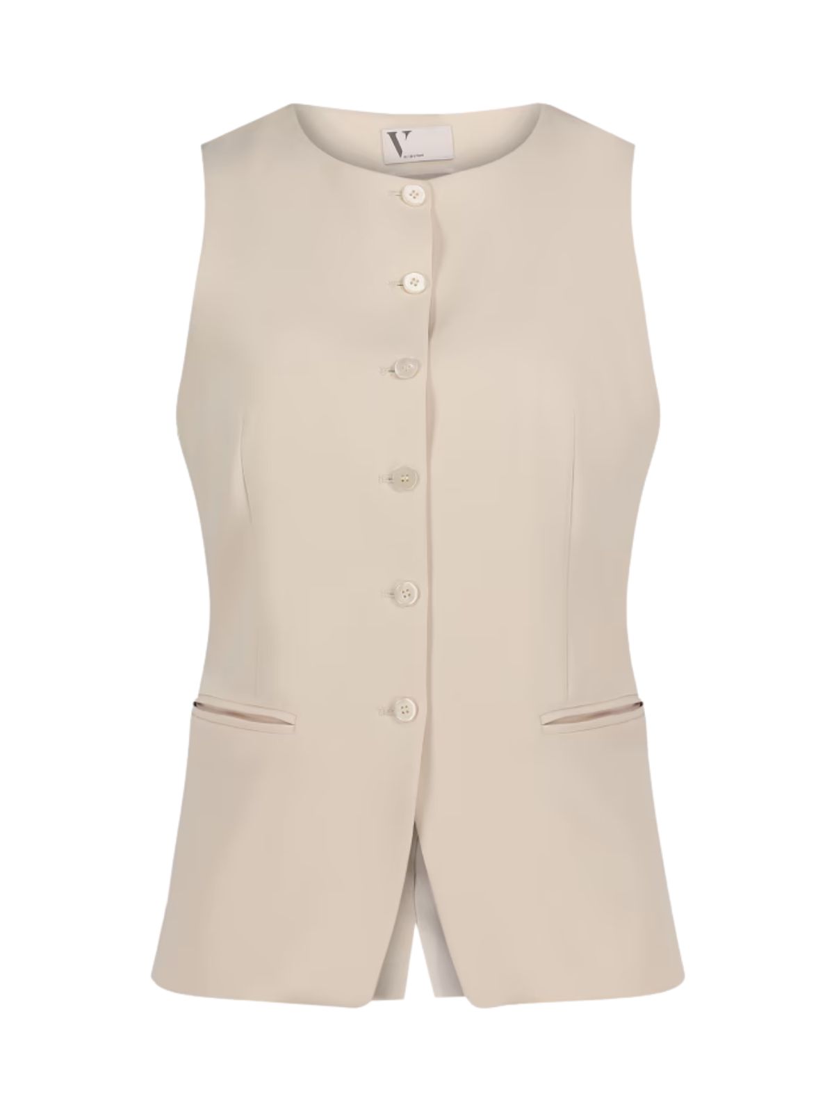 Denne elegante vest er designet med knapper foran, hvilket giver et klassisk og sofistikeret look. Vesten kan styles alene over en skjorte, bluse eller T-shirt, eller bruges som del af et lag-på-lag outfit for et poleret og moderne udtryk.