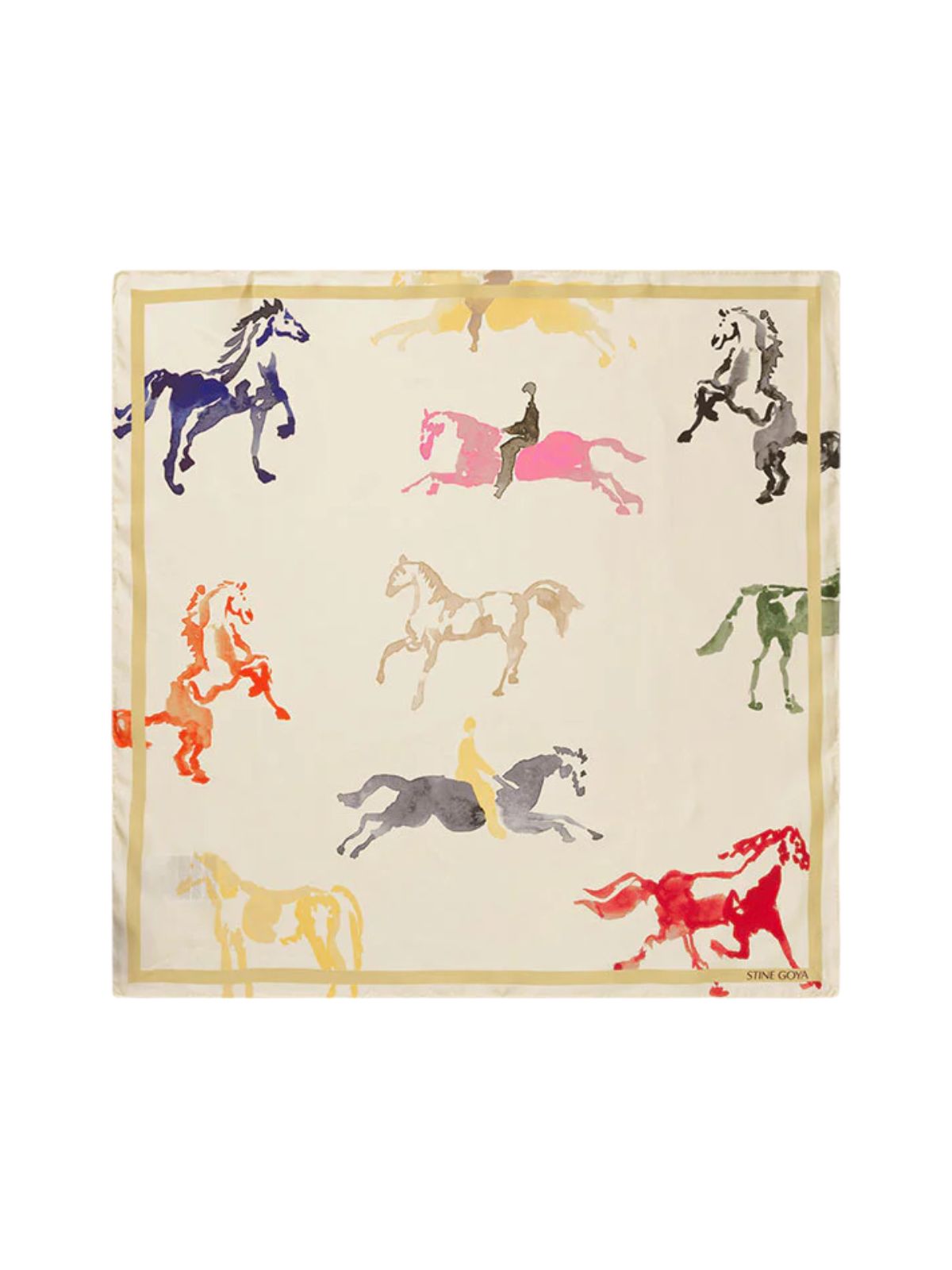 Dette elegante silketørklæde fra STINE GOYA er designet i offwhite med et farverigt, håndmalet hestemotiv. Den gule kant og det diskrete STINE GOYA-logo giver et sofistikeret finish. Tørklædet kan styles på mange måder – som halstørklæde, i håret eller som pynt på tasken – og tilfører ethvert outfit et farverigt og eksklusivt touch.