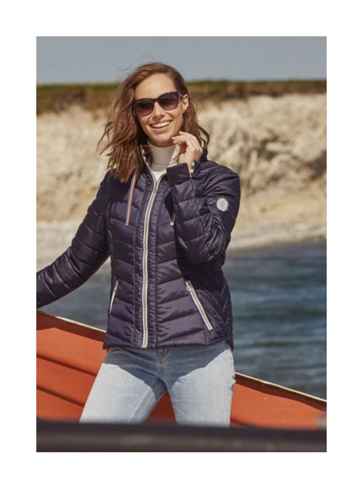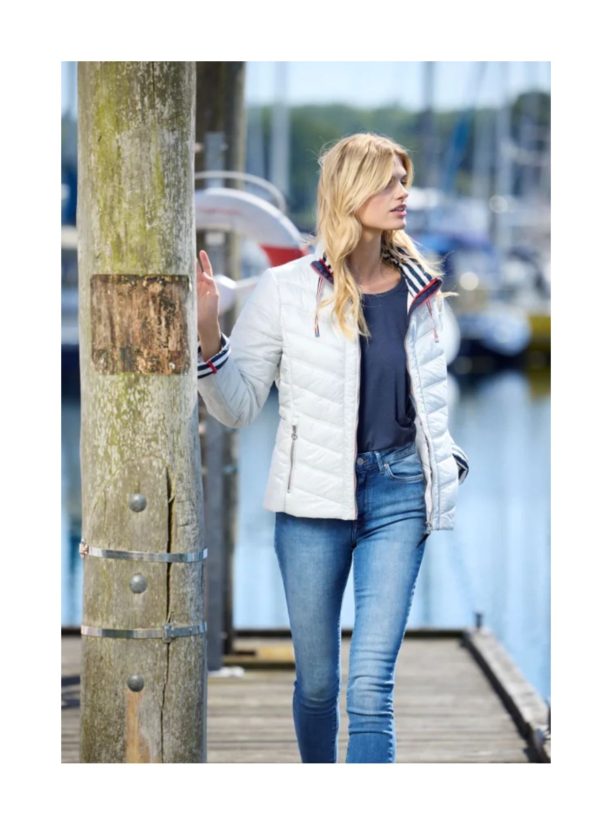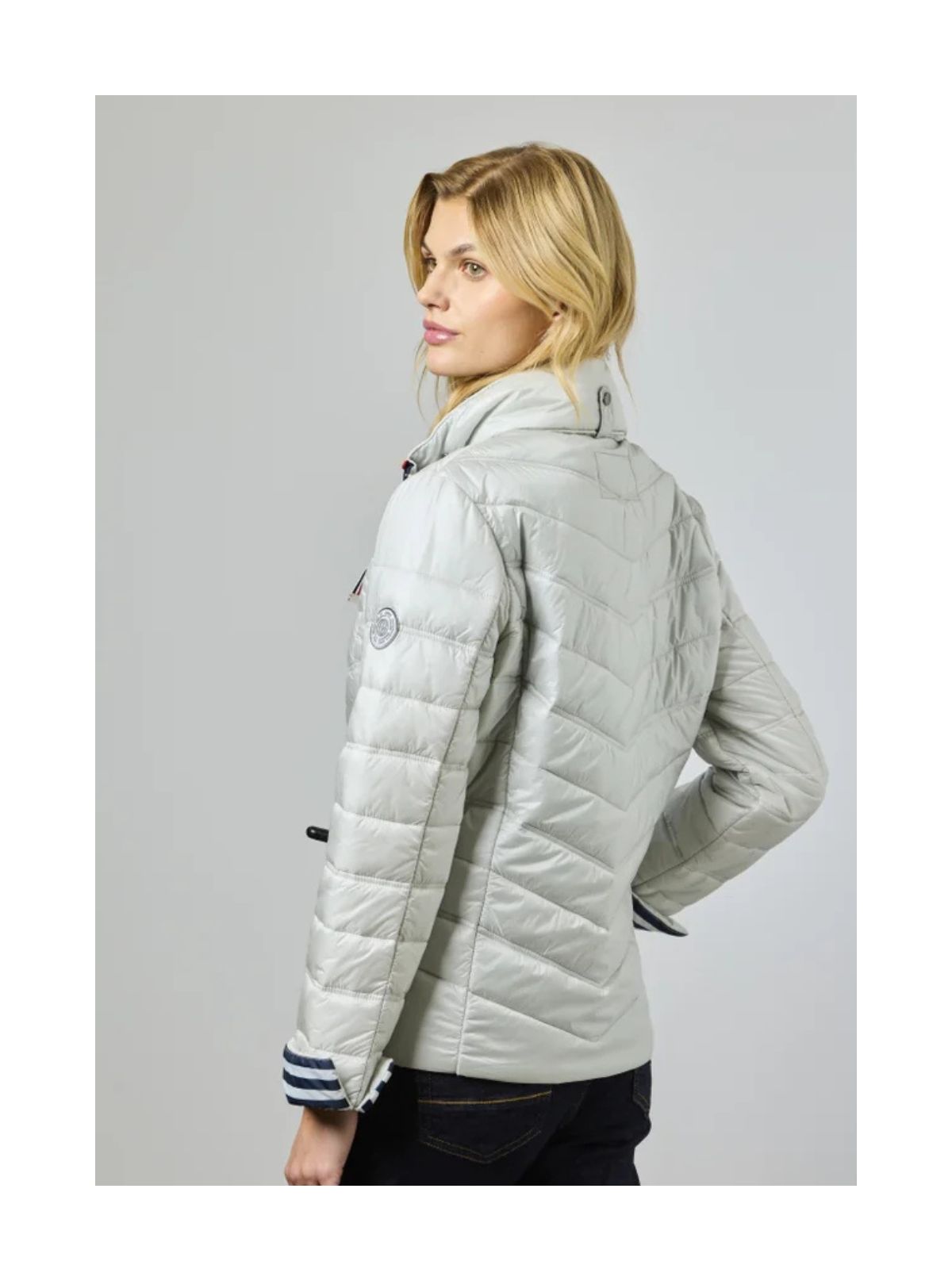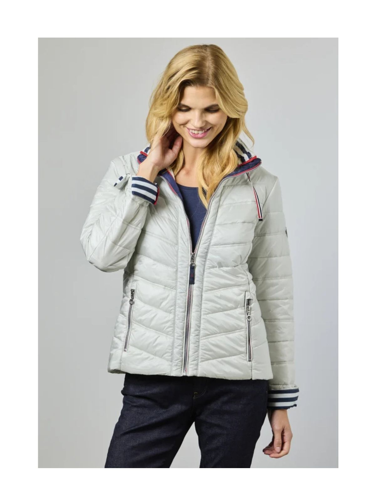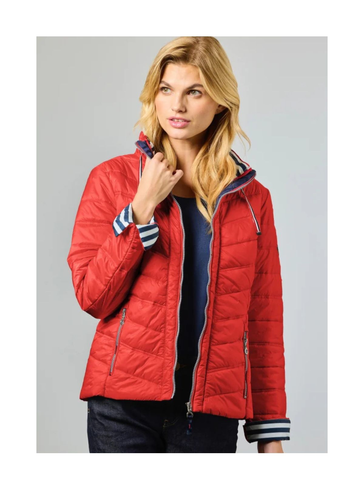 Den skjulte hætte i kraven gør jakken ideel til omskifteligt vejr, mens oplægs-ærmerne med kontrastfarvet indvendig manchet tilfører et dynamisk og stilfuldt element. Udvalgte farver har en maritim-inspireret, stribet foring for et friskt, sporty look, mens beige-varianten har tone-i-tone foring med guldtilbehør for et mere sofistikeret udtryk.
