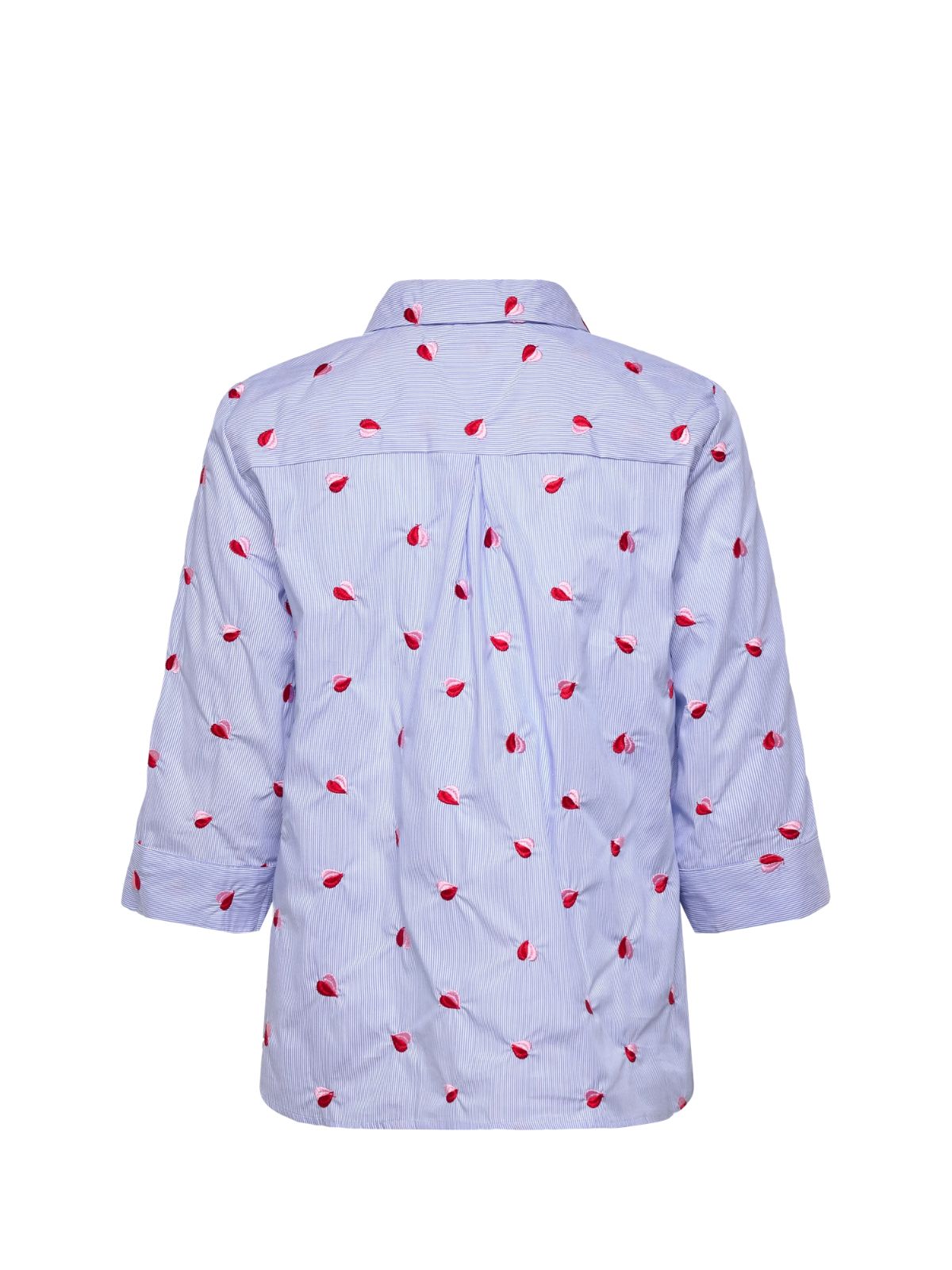Smart skjorte bluse fra Freequent med striber og broderede detaljer der giver denne bløde skjorte et elegant præg. Den har en enkel silhuet med trekvartærmer, en foldet krave, knaplukning og en plissé på ryggen.Længde: ca. 60 cm