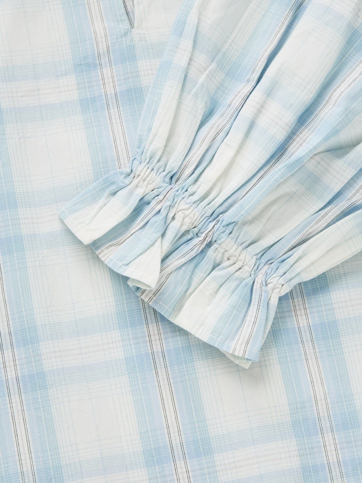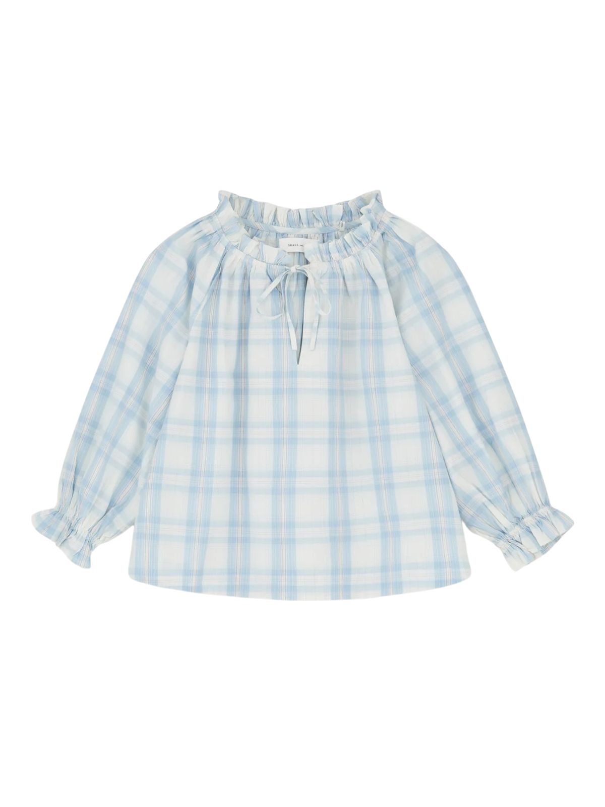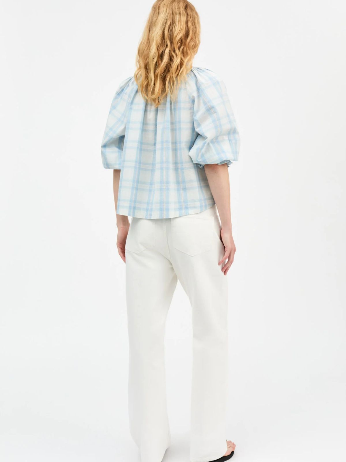 Feminin bluse fra SKALL i et løst design med draperinger for volume samt i et smukt ternet mønster. Blusen en rundet halsudskæring med flæsedetaljer, slids og bånddetaljer samt 3/4 lange ballonærmer med elastisk manchet.Længde: ca. 59 cm - målt i str. 38