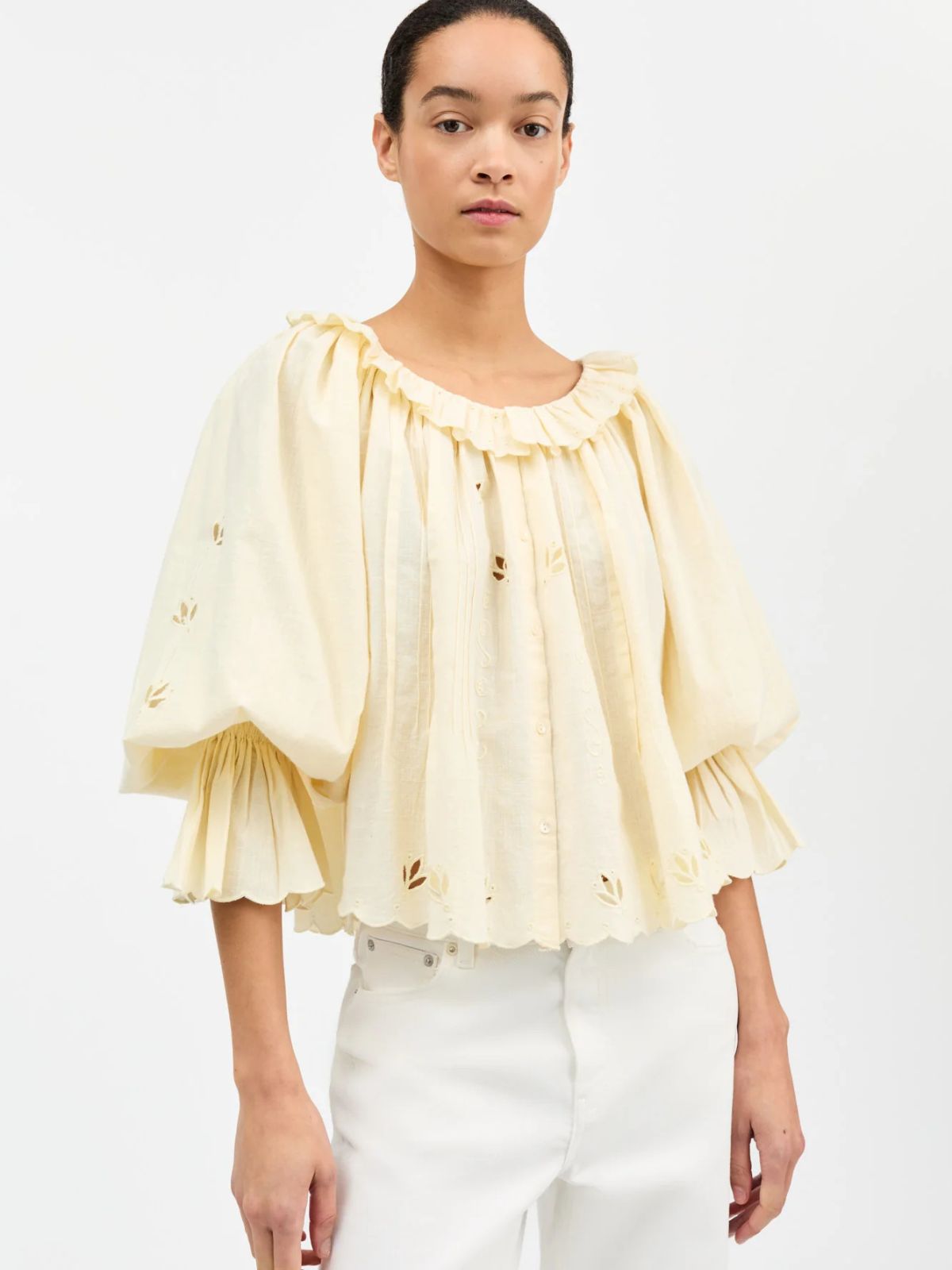 Stilfuld bluse fra SKALL i loose fit design med smukt broderi anglaise, rund hals med flæser, knaplukning foran, raglan skuldre samt lange ærmer med elastisk manchet.Længde: ca. 60 cm
