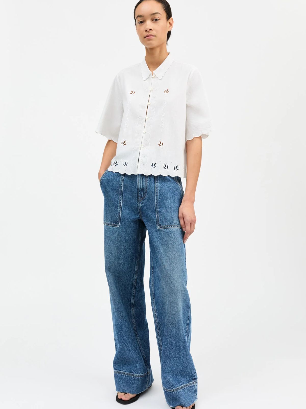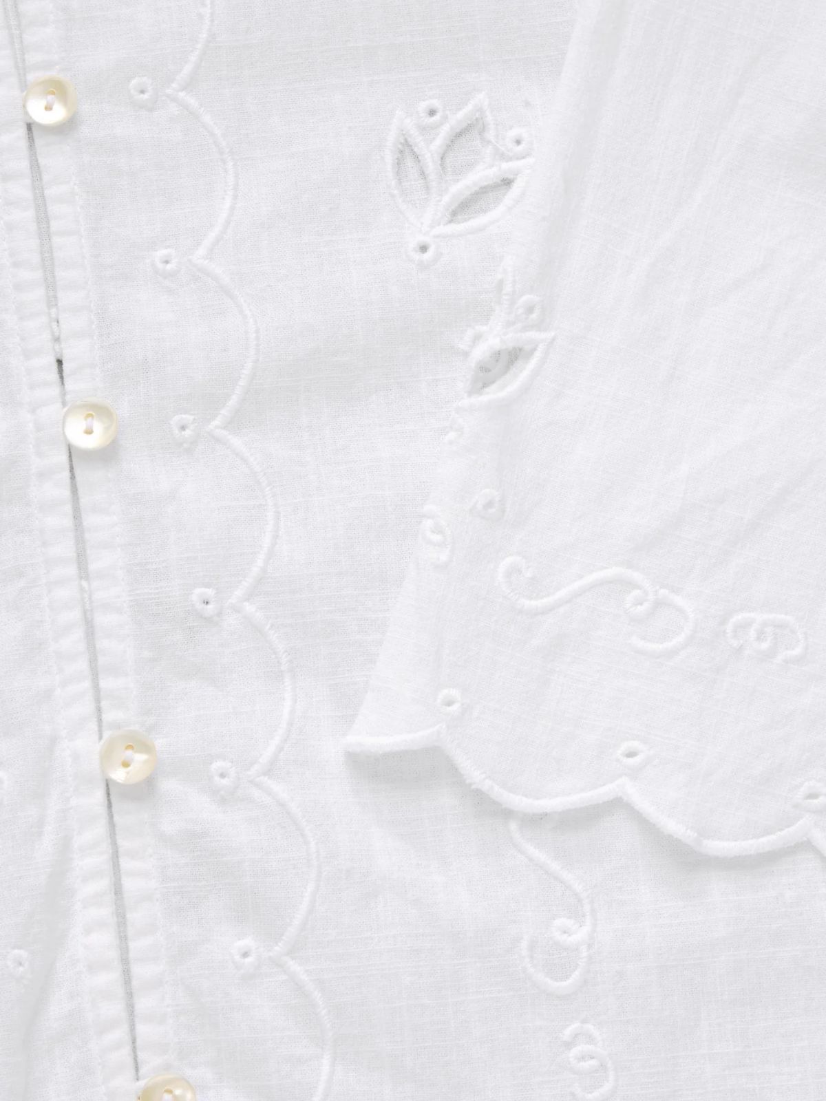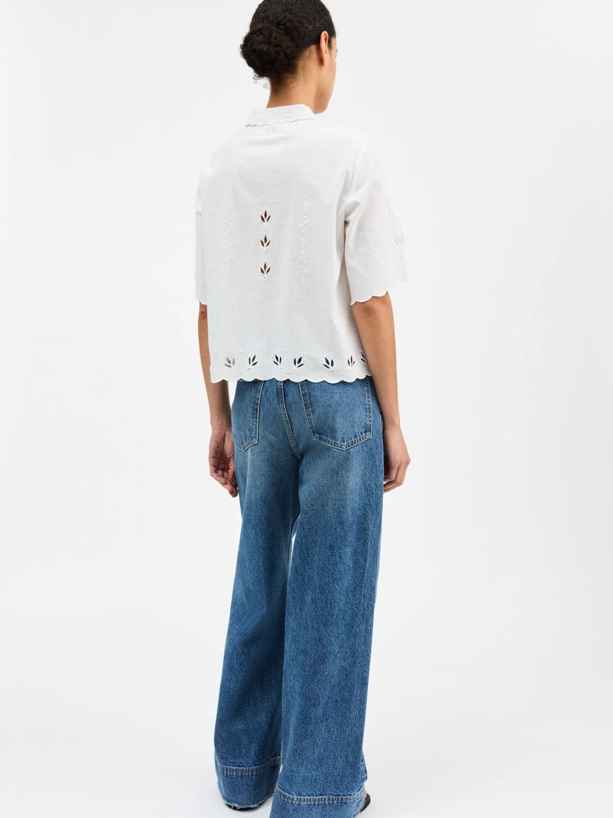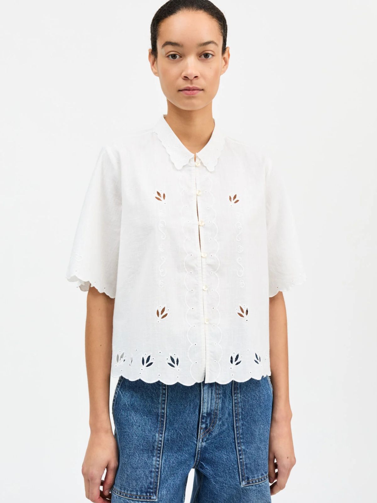 Raffineret skjortebluse fra SKALL med krave, fint broderi anglaise hulmønster, perlemorsknapper og korte ærmer med elegant bølget kant ligeså nederste kant.Længde: 60 cm