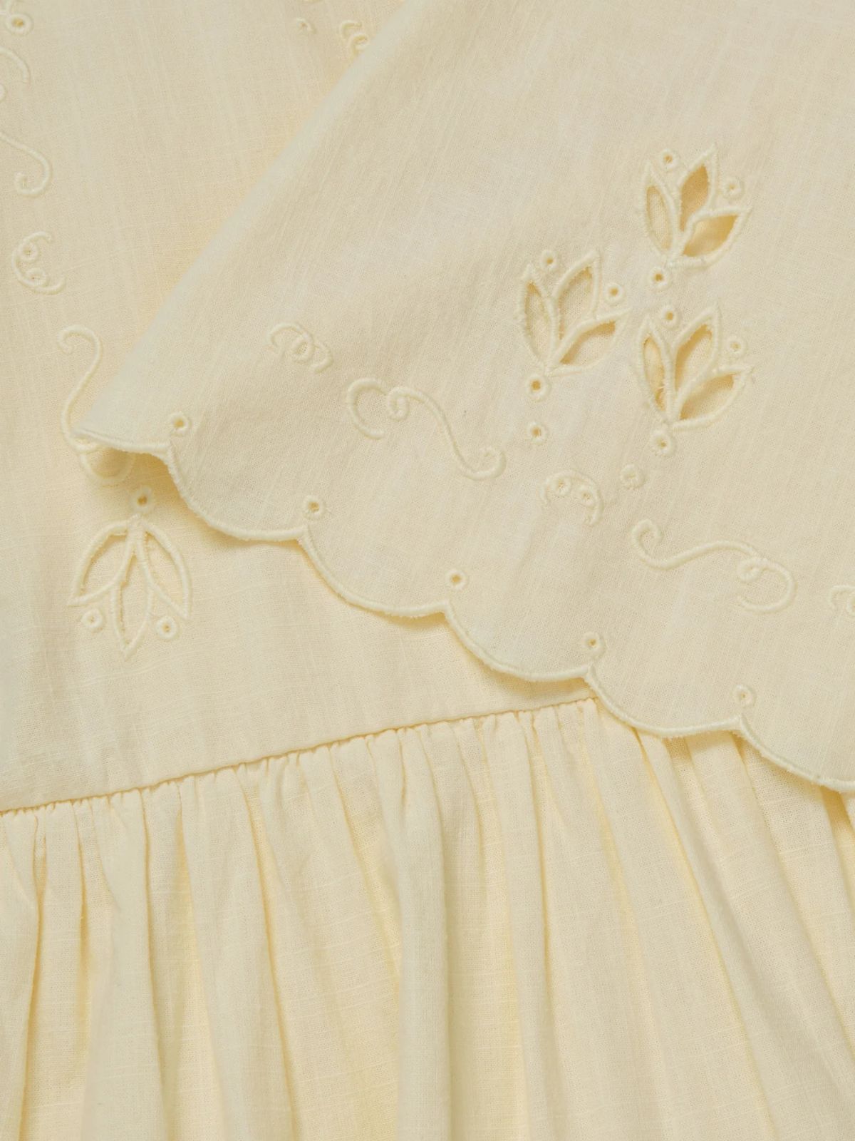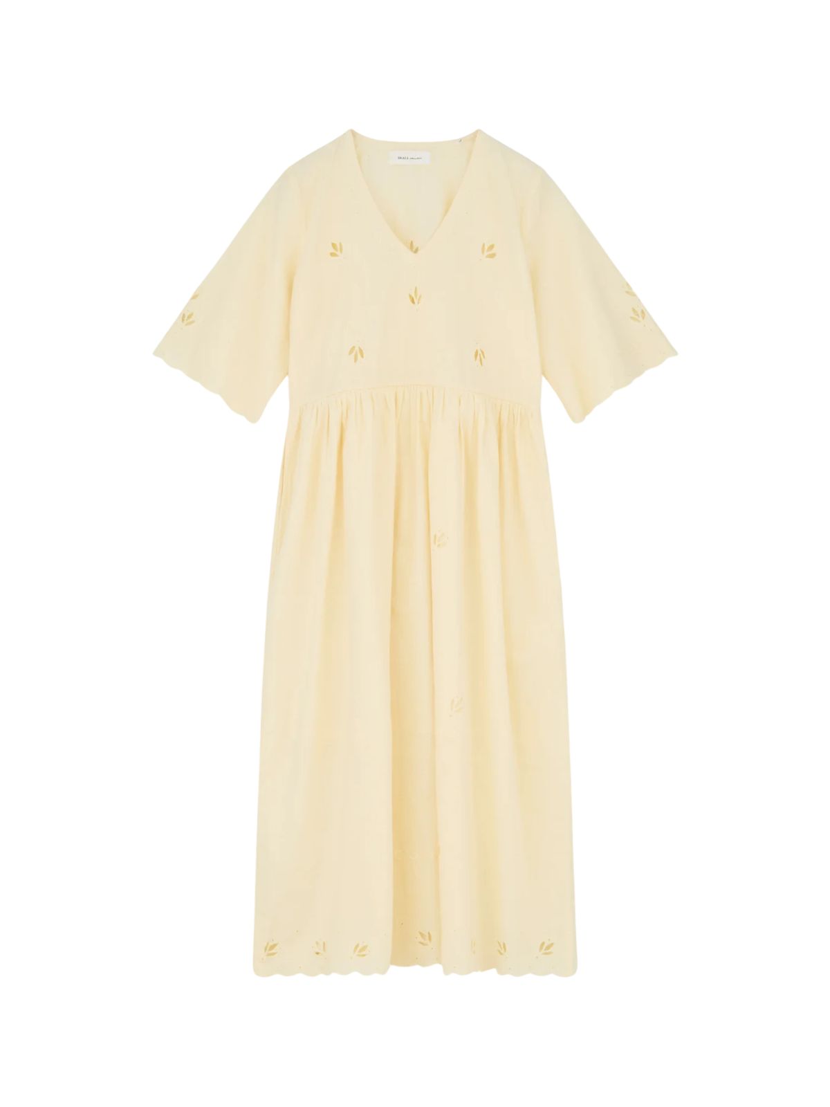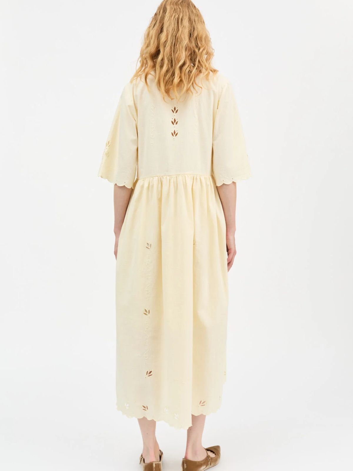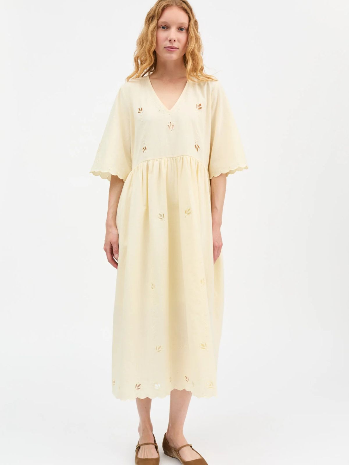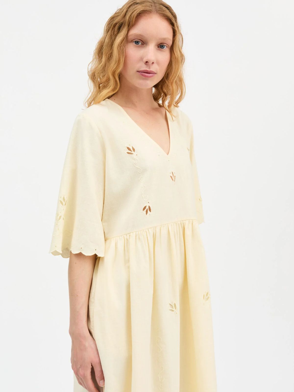 Charmerende kjole fra SKALL med broderi anglaise detaljer samt i en skøn bomuld og hør kvalitet. Kjolen har en dyv V-udskæring, draperet overskæring under bryst skaber en behagelig komfort. Kjolen har korte brede ærmer.Længde:ca. 130 cm målt i str. 36