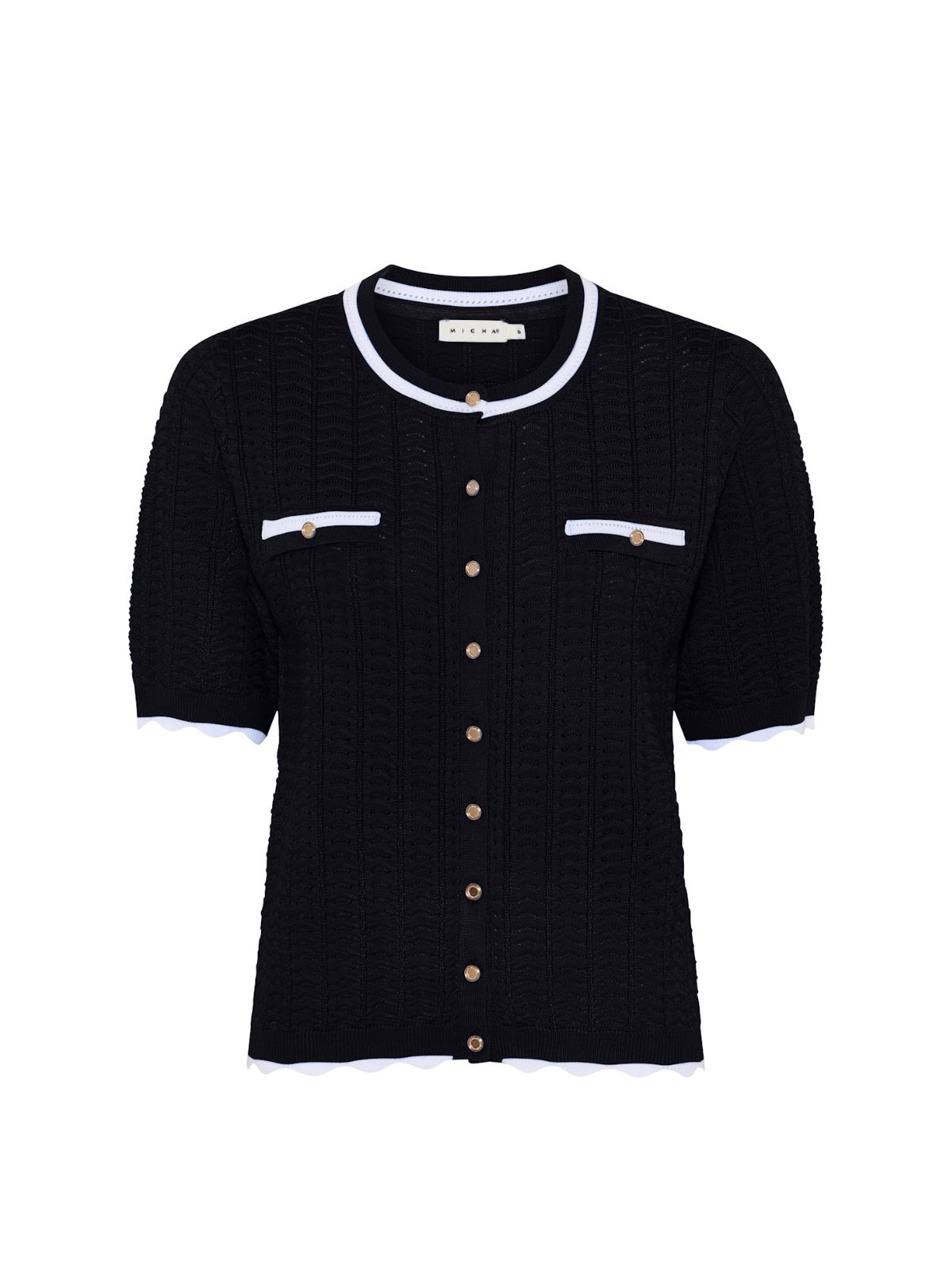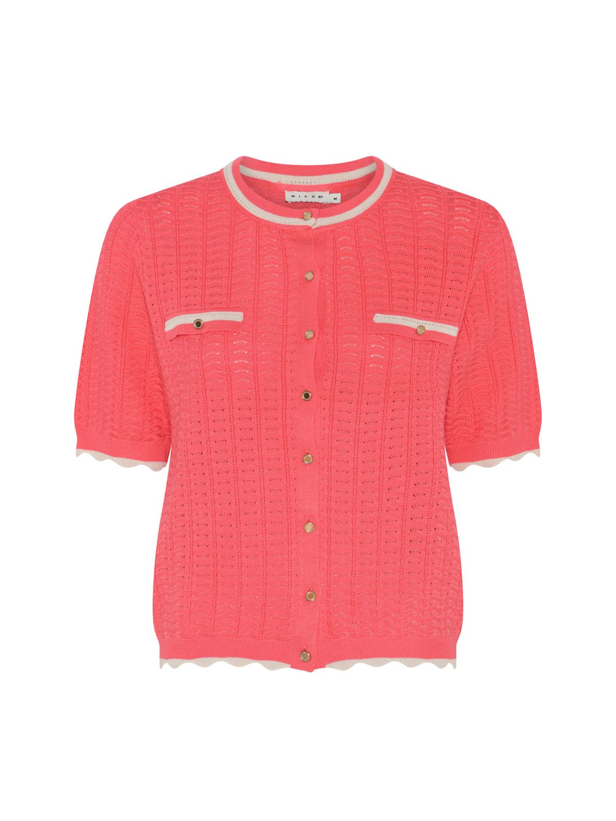 Elegant strikcardigan fra MICHA i klare farver samt i fint struktur strikmønter. Strikken har rund hals med kontrastkant, fin knaplikning samt korte ærmerm med bælget kant ligeså nederste kant.Længde: ca. 60 cm