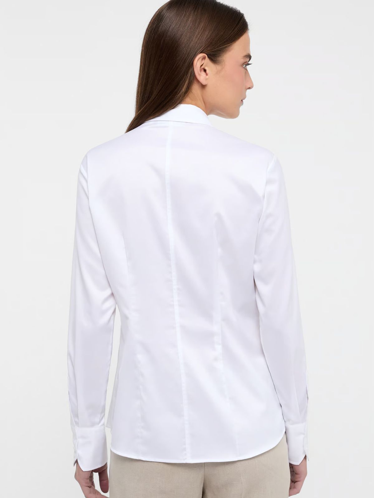 Klassisk skjortebluse fra ETERNA i let taljeret design med cute away krave i en behagelig bomulds kvalitet. Skjorteblusen har gennemgående knaplukning samt taljering og lange ærmer med bred manchet. Et " Must Have " til din garderobe.