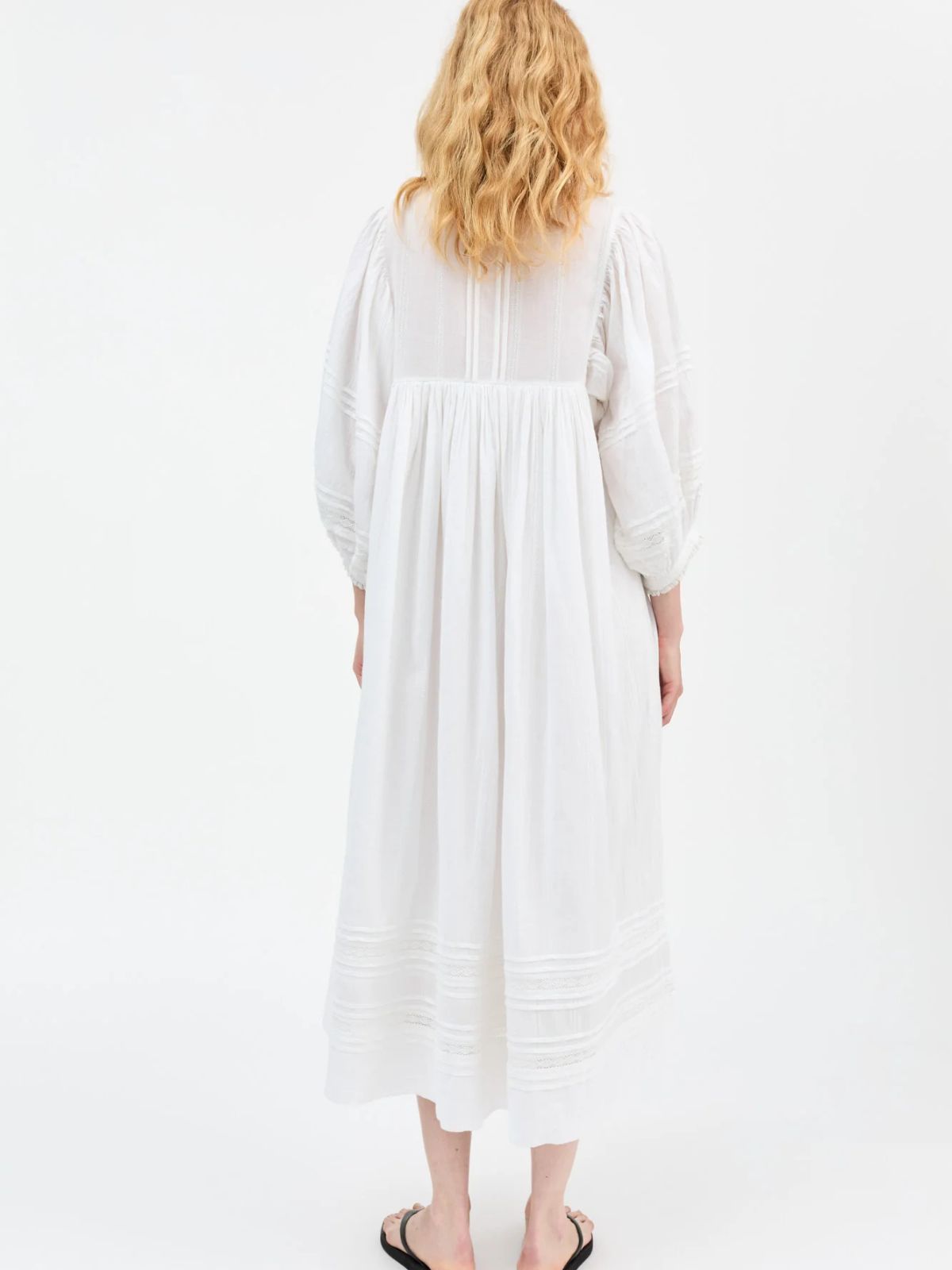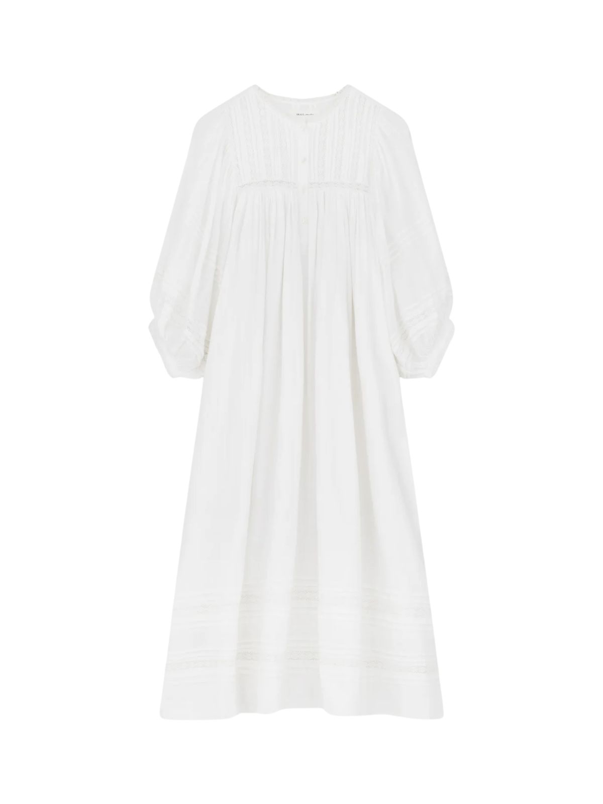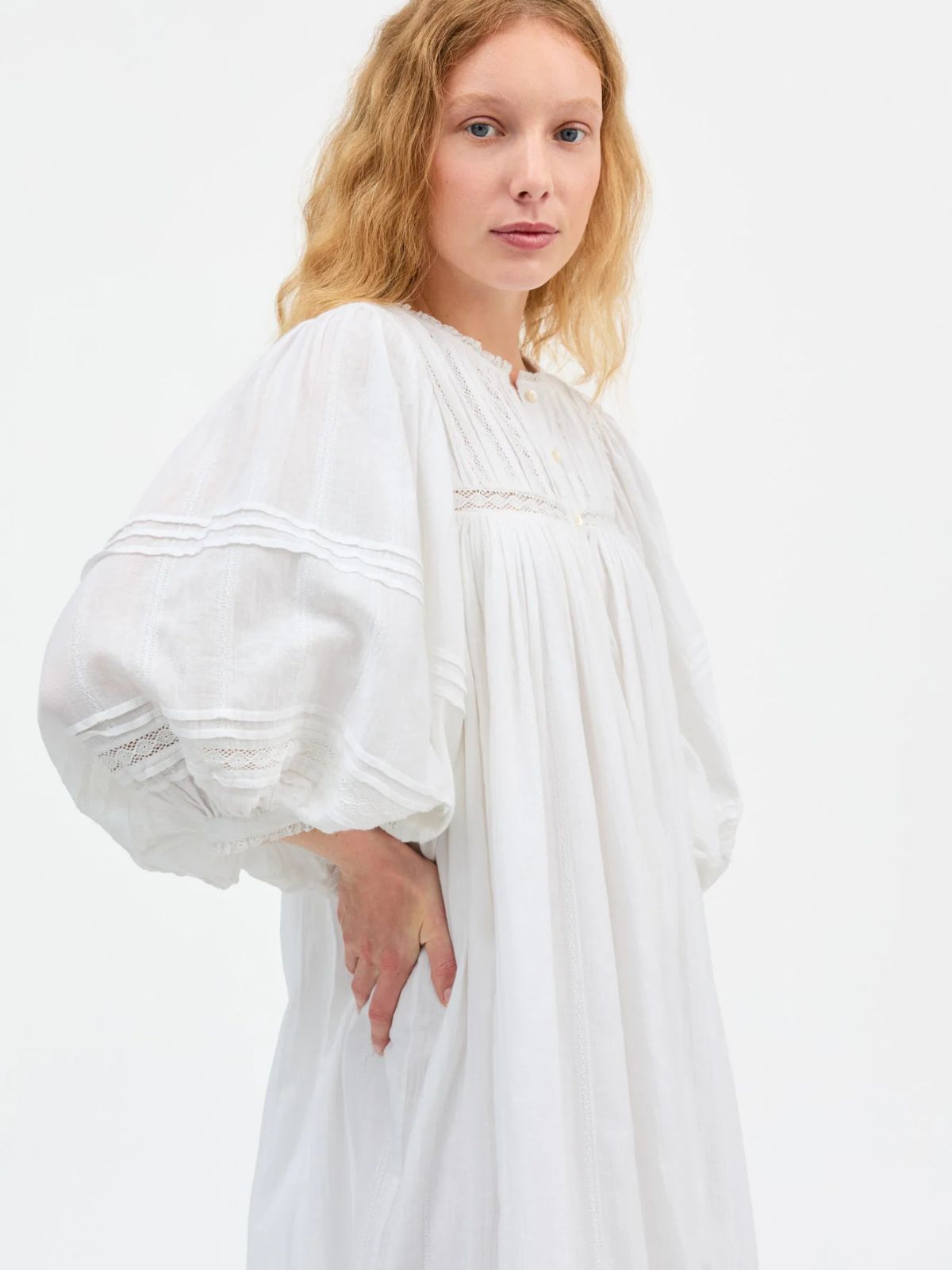 Romantisk kjole fra SKALL med sarte fine blonde detaljer samt i et komfortabelt loose fit volume design med draperinger for og bag. Kjolen er med rund hals samt elegante ballonærmer.Længde: ca. 130 cm målt i str. 36