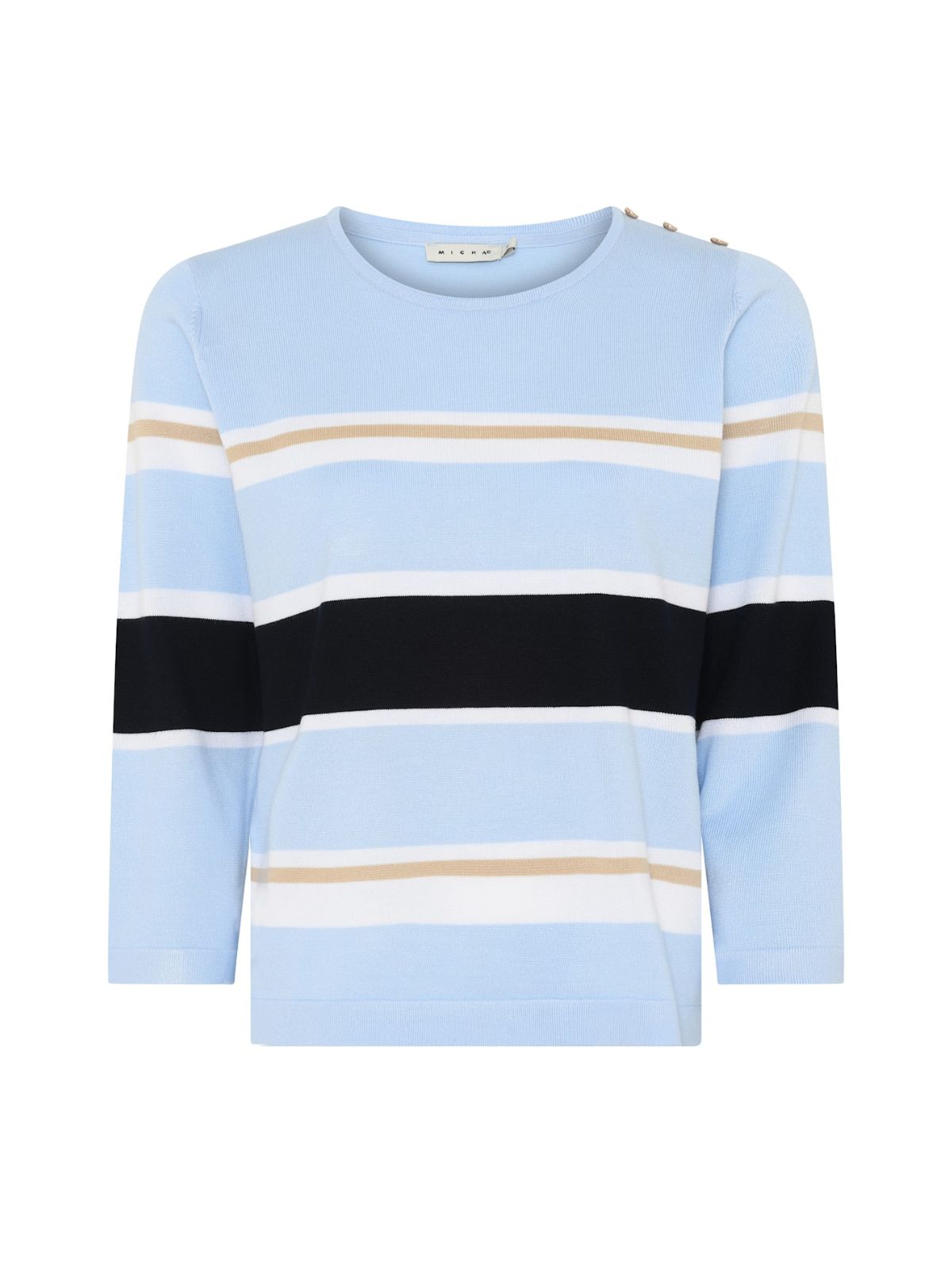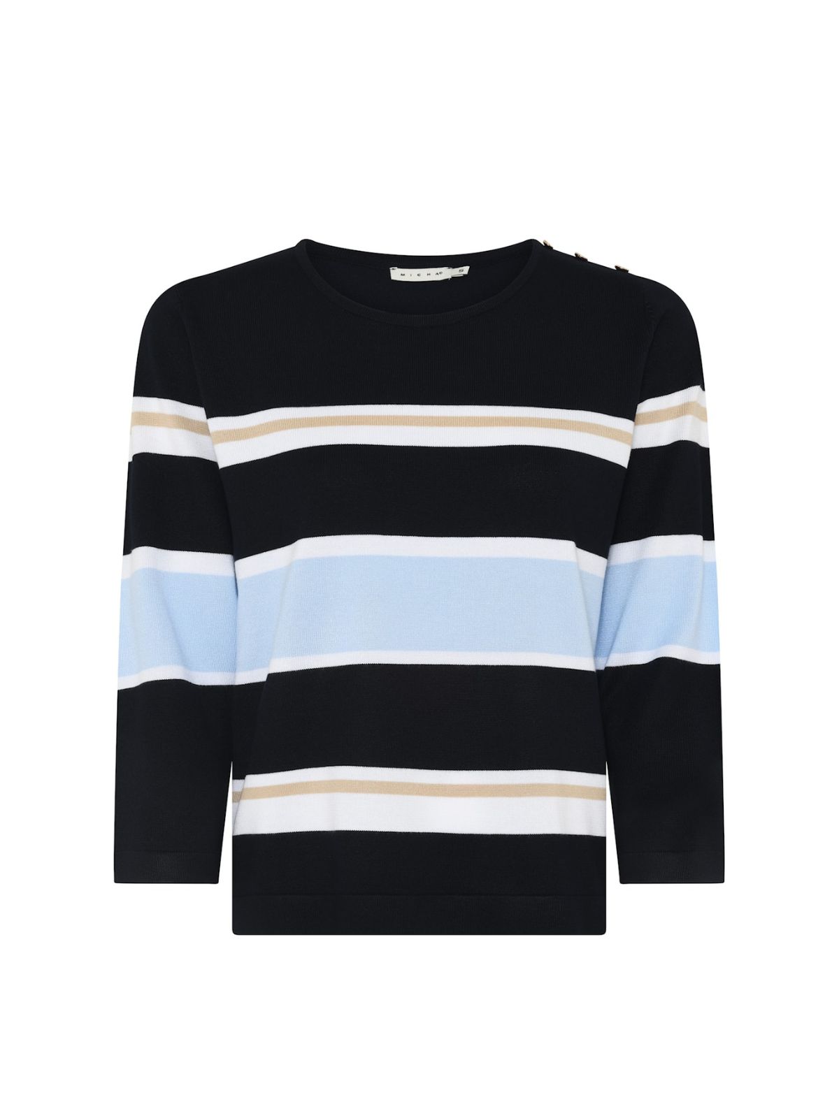 Feminin strik fra MICHA med stribet effekt samt med rund hals og 3/4 lange ærmer samt knap detalje på venstre skulder.Længde: ca. 60 cm