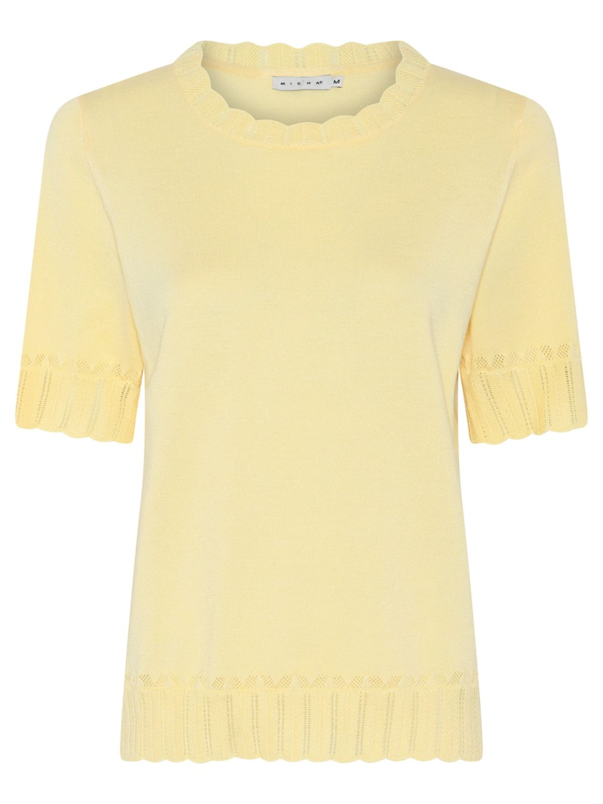 Fin kortærmet let strik fra MICHA i smart deisgn med dekorativt hulmønster i den runde halsudsæring samt ærmer og bund.Længde: ca. 60 cm