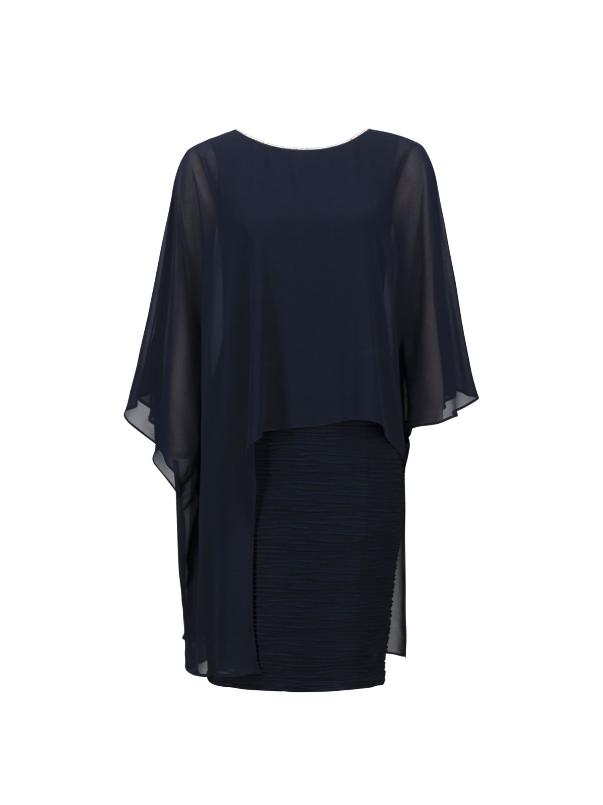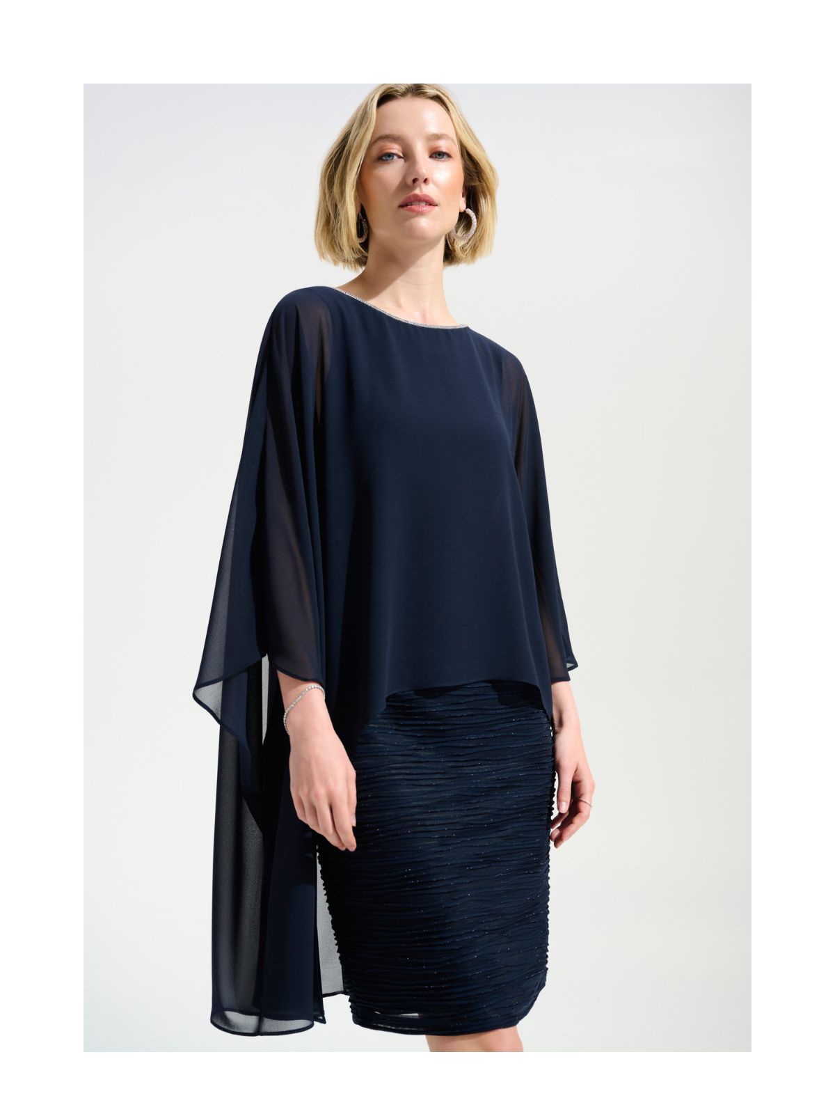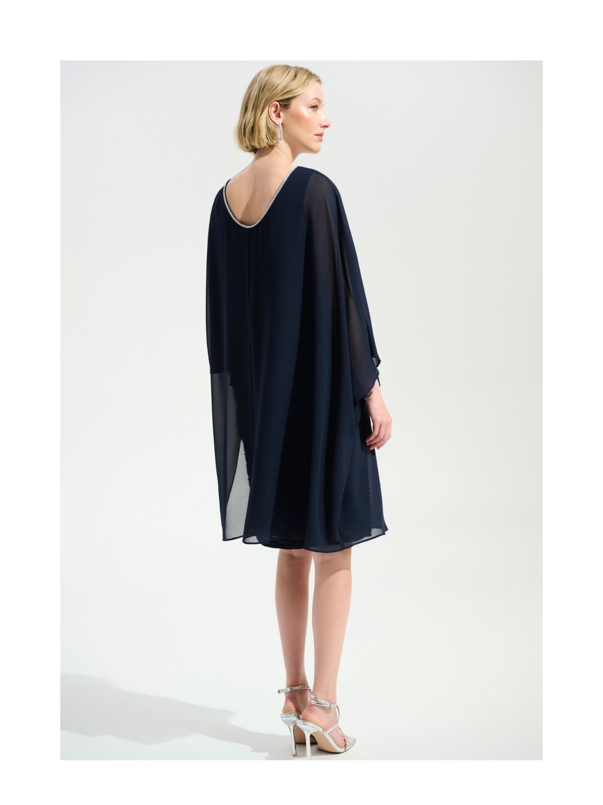 Feminin kjole fra Joseph Ribkoff er en perfekt blanding af elegance og sofistikering. Kjolen fast underkjole i strukturvævet dessin og har en bådudskæring samt 3/4 lige ærmer fra den let transparente bolero overlayer, der giver et raffineret look. Udsmykket med glitter juvel pipeline langs halskanten som bagpå går dybt ned og fremhæver den feminine stil. Denne kjole er både til formelle og semi-formelle kjole.Længde: ca. 102 cm