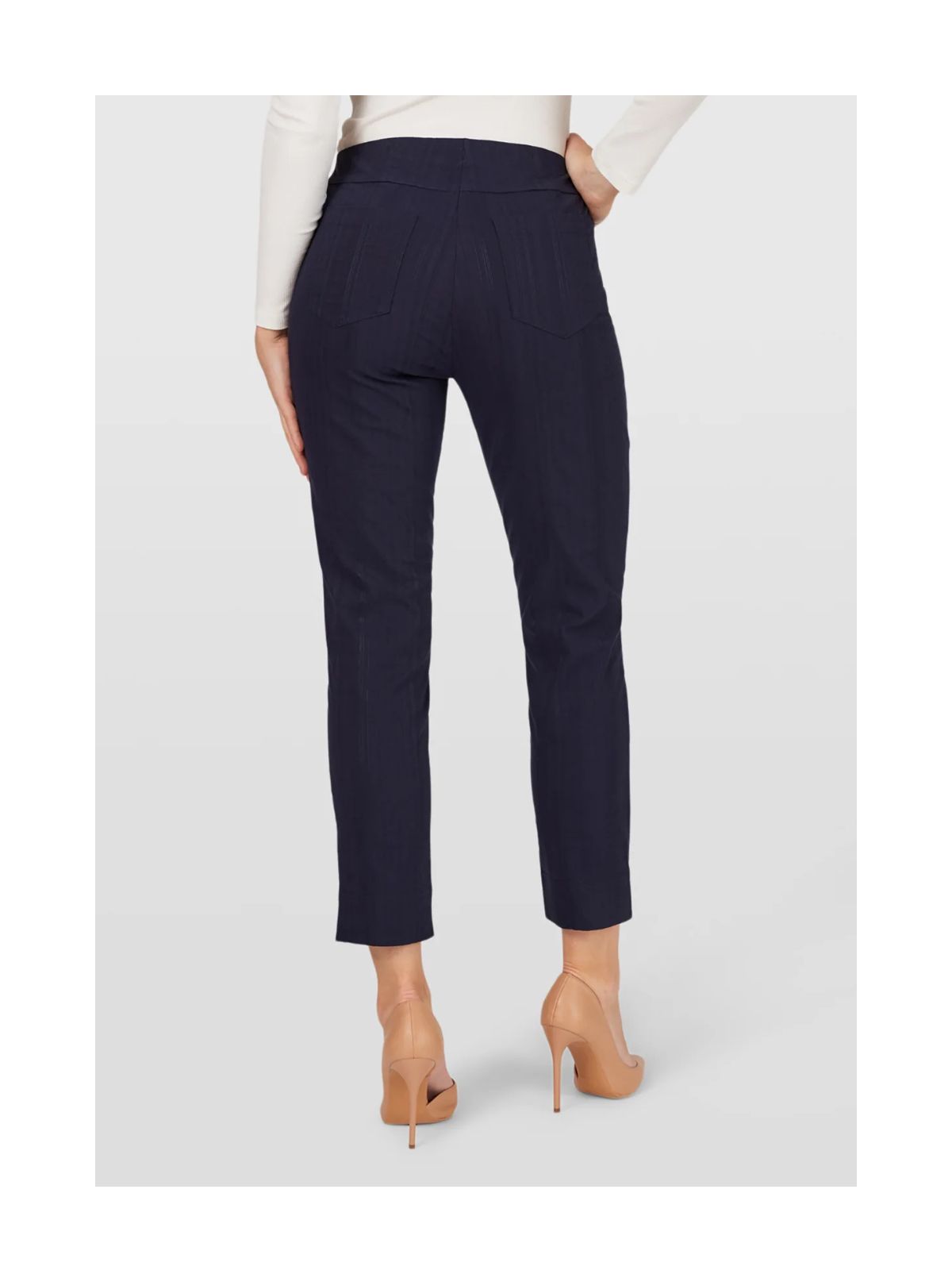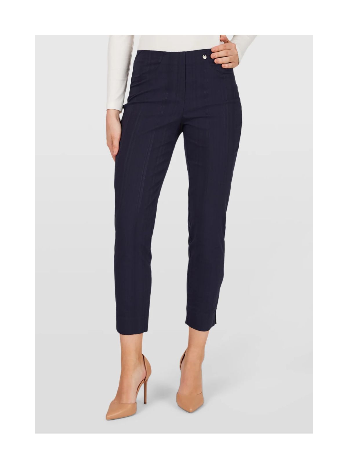 Bella 09 buksen er fremstillet i en let og strækbar seersucker-kvalitet, der føles luftig og behagelig mod huden – ideel til de varme måneder. Stoffets fine struktur giver et afslappet, sommerligt udtryk, mens den mediumhøje talje og det lige bensnit sikrer en klassisk pasform, der sidder flot uden at stramme. De formgivende baglommer giver en pæn silhuet, og slidsdetaljen nederst på benet tilfører både bevægelsesfrihed og et elegant finish. En alsidig buks, der nemt kan styles til både hverdag og mere velklædte anledninger.