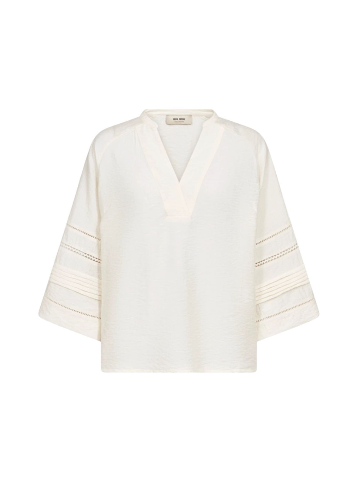 Smuk Mos Mosh Aleysa Nila bluse i ecru med afslappet silhuet og elegante anglaise-detaljer ved ærmerne. Perfekt til både skræddersyede bukser og denim for et raffineret, ubesværet look.