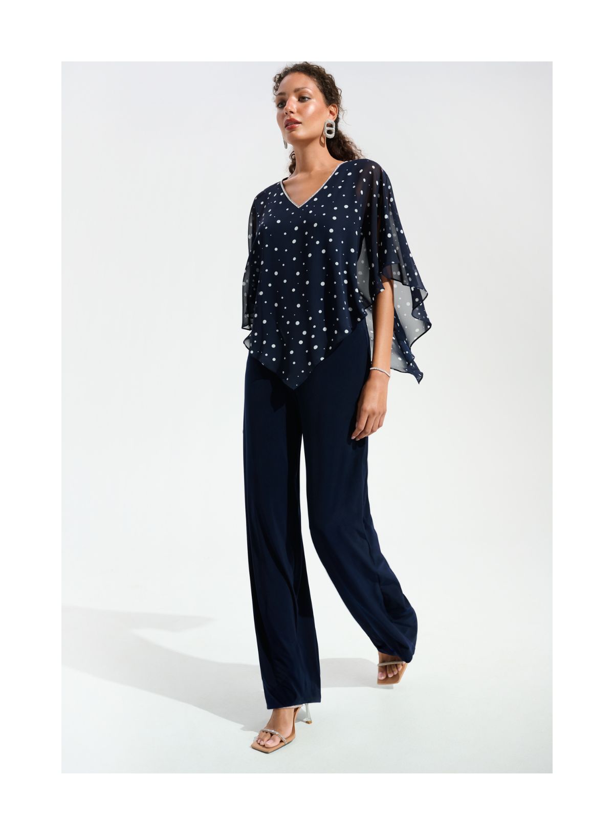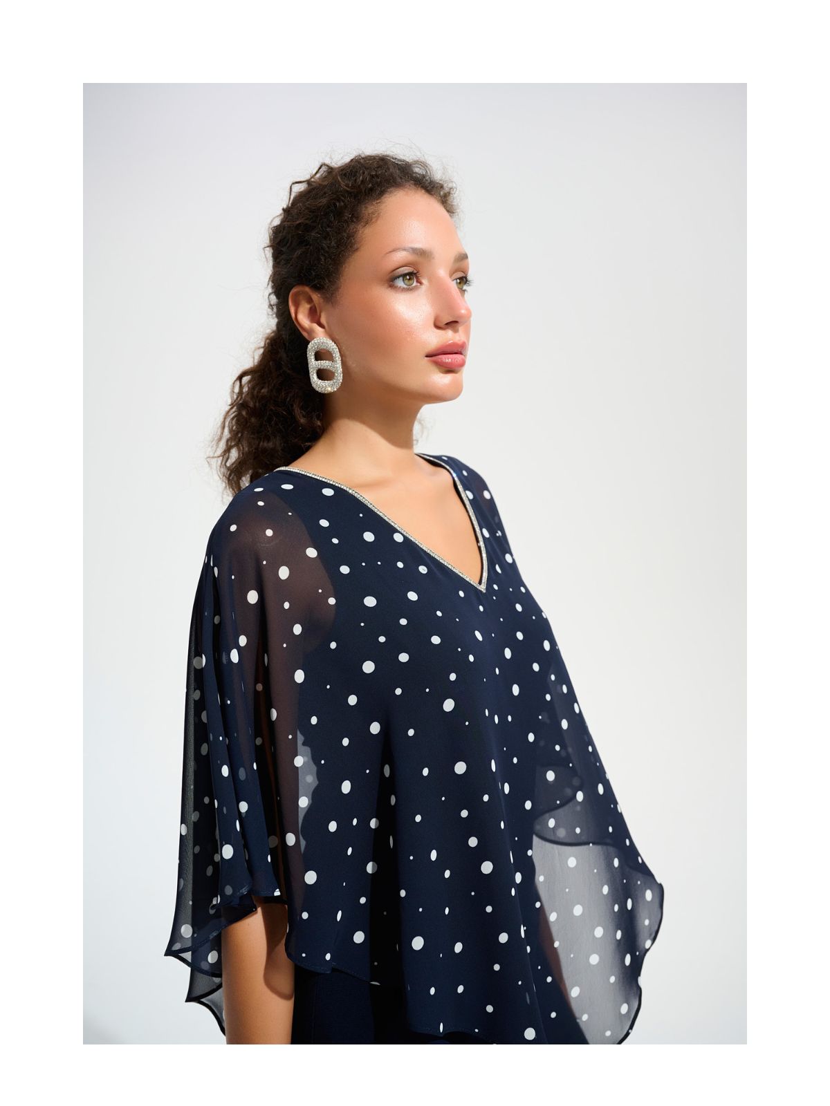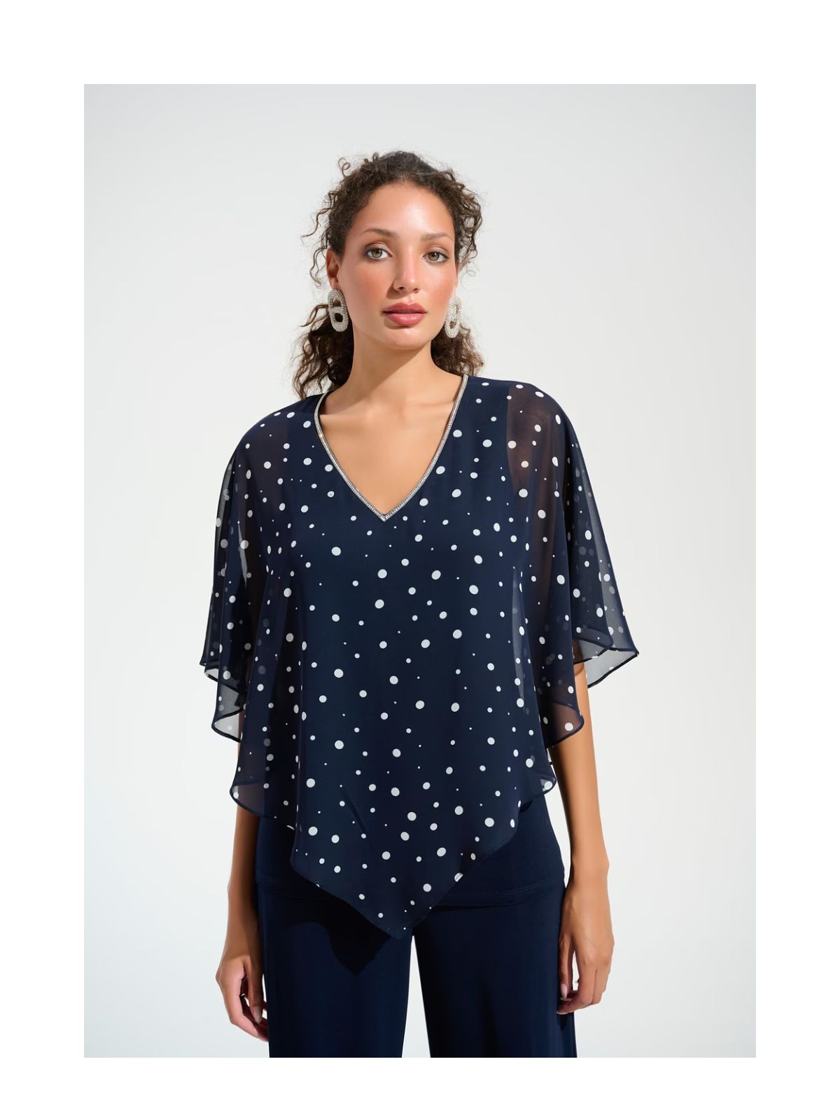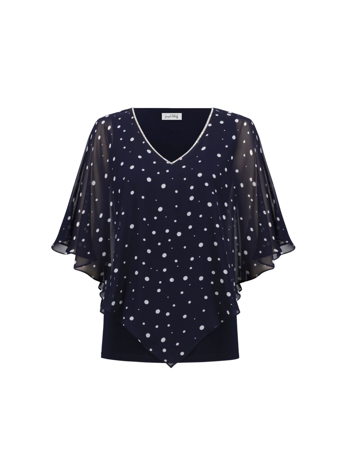 Elegant bluse fra Joseph Ribkoff har en afslappet pasform og et hoftelangt design for ultimativ komfort. Blusen er udsmykket med juvel pipeline og et legende polkaprikket mønster på det let transparente overlayer. Blusen har en flatterende v-hals og korte ærmer med flatterende detaljer. Denne top er perfekt til både buks eller nederdel for et iøjnefaldende look.Længde: ca. 66 cm