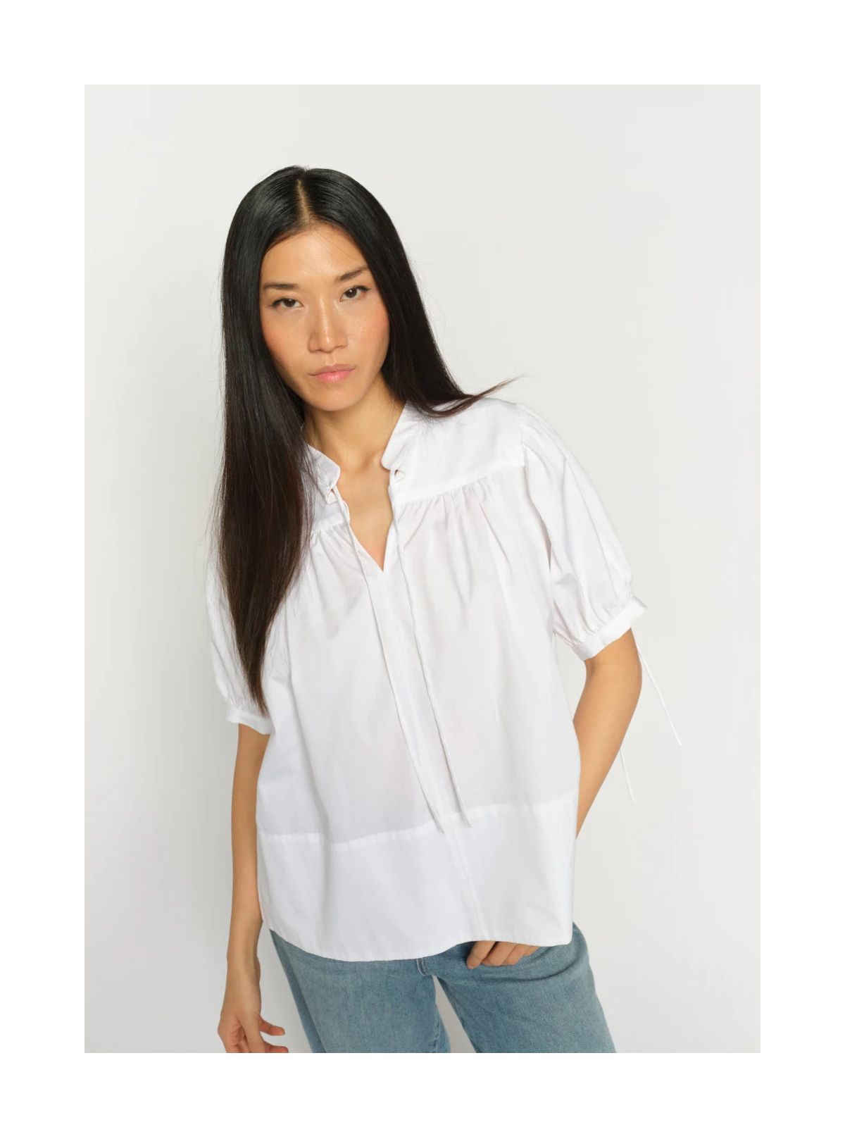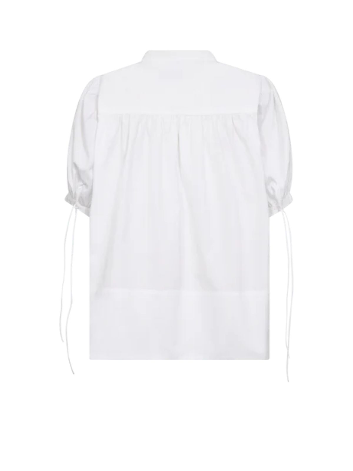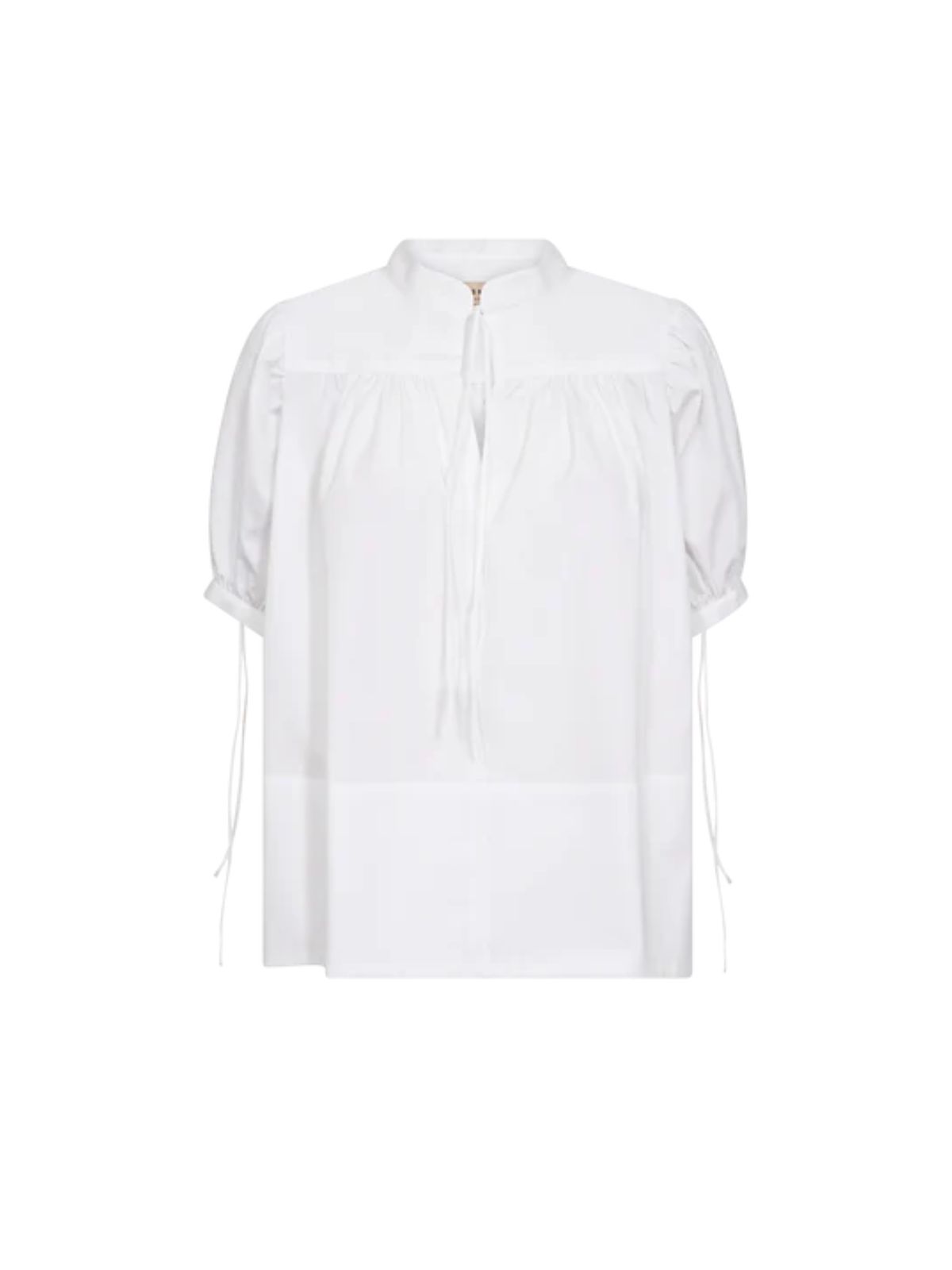 TARIMA - En let bluse i økologisk bomuld fra MOS MOSH med et moderne twist. Den er designet med båndkrave, korte ærmer med justerbare snører og fine rynkedetaljer, der giver ekstra volumen. Den afslappede silhuet gør den perfekt at style med både skræddersyede styles og afslappet denim.Længde: ca. 60 cm