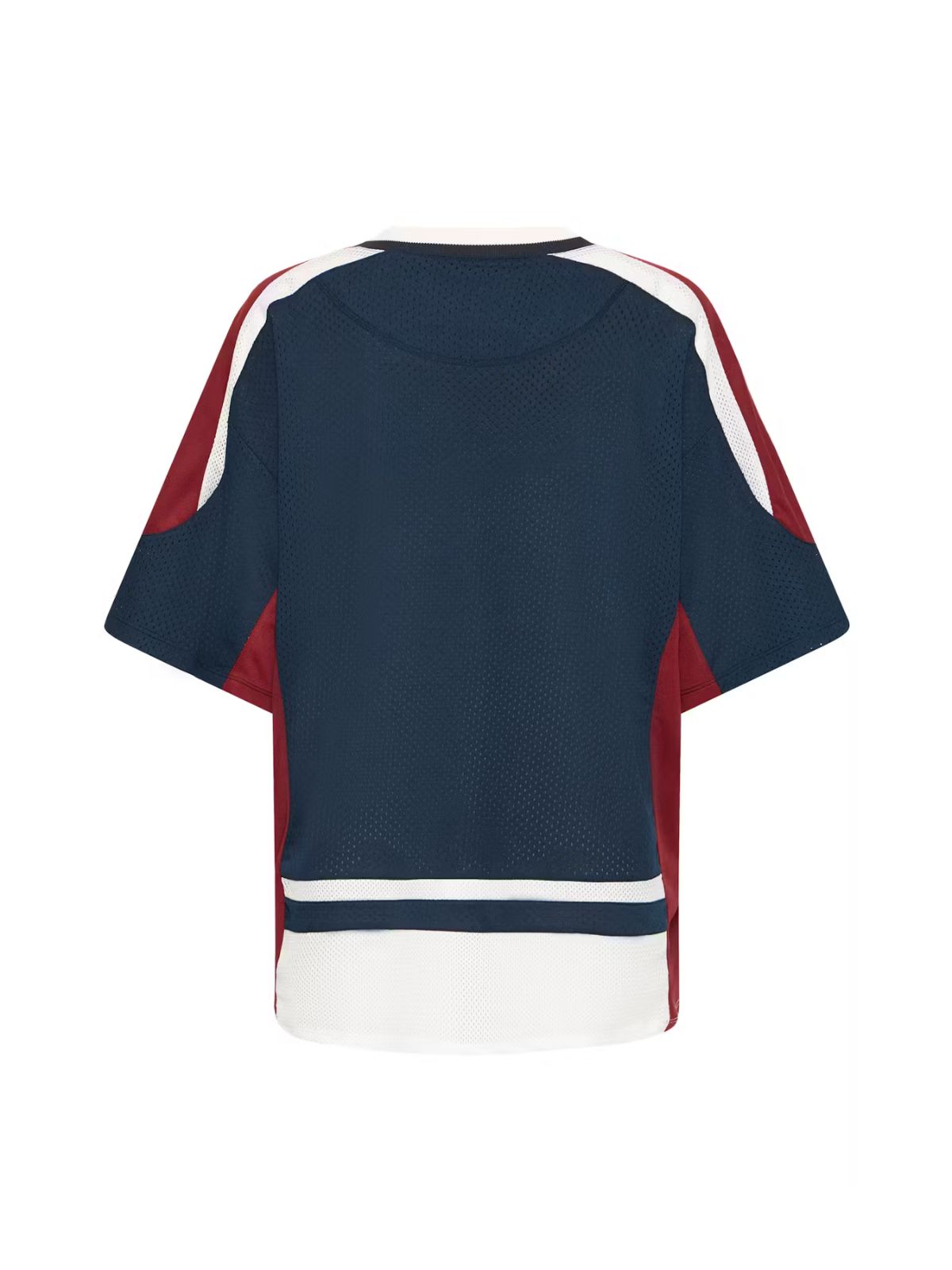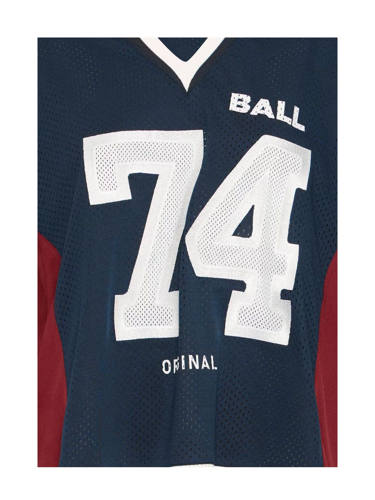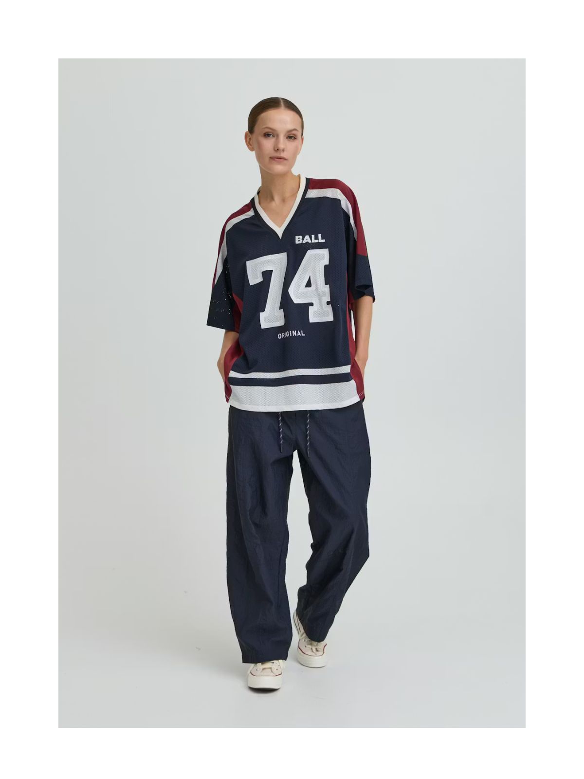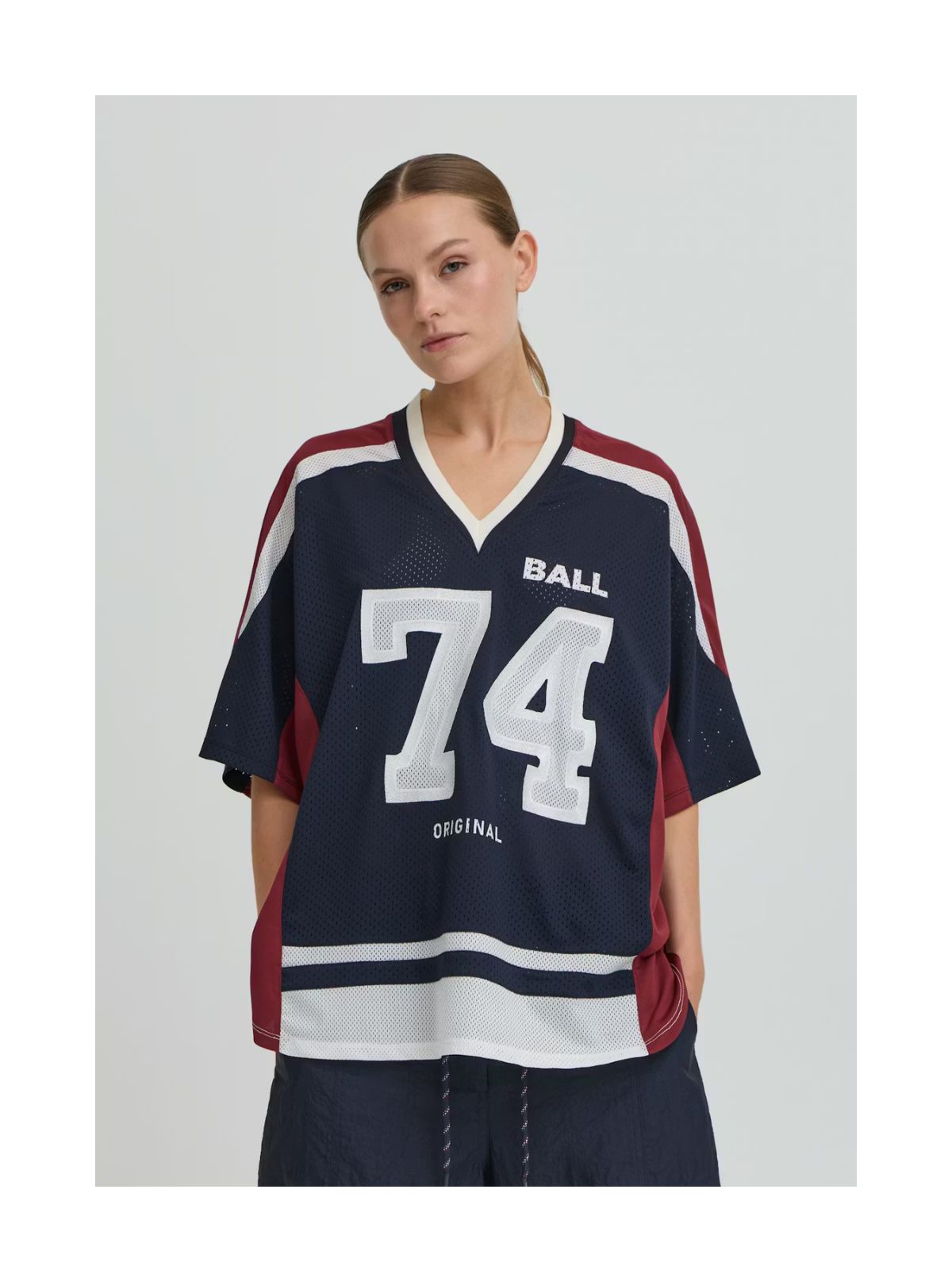 BAMARNI oversized mesh-jersey bluse fra BALL med brede korte ærmer, løs pasform og V-hals i baggi fit. Kontrastpaneler langs skuldre og sider samt stor applikation foran.Længde: ca. 70 cm