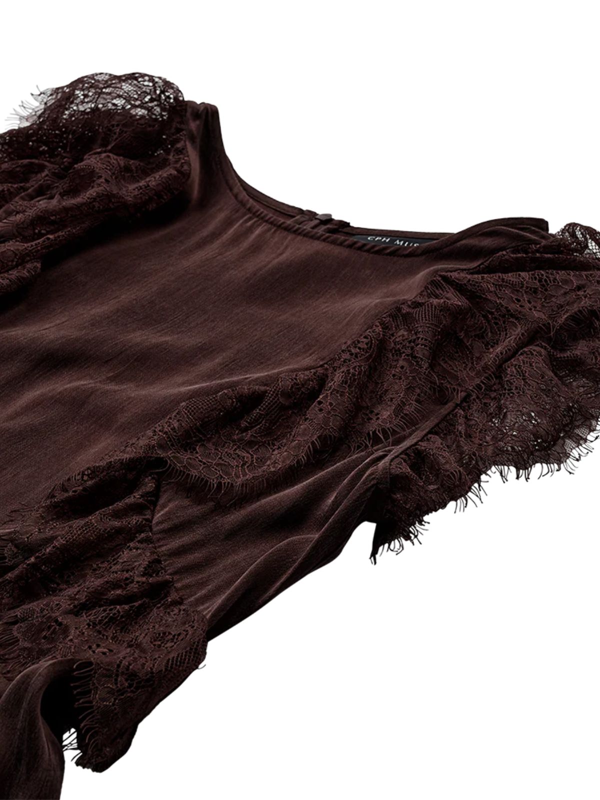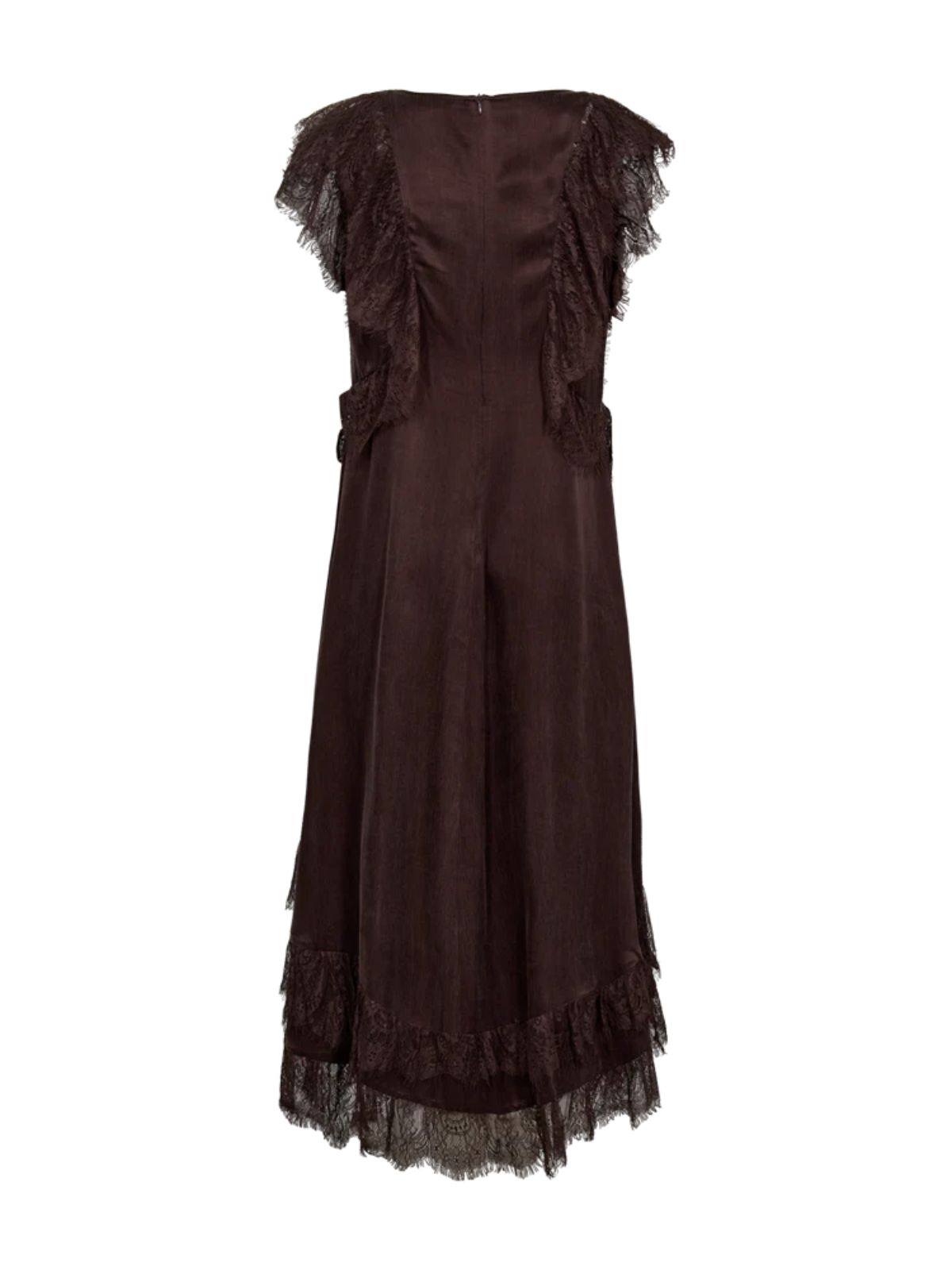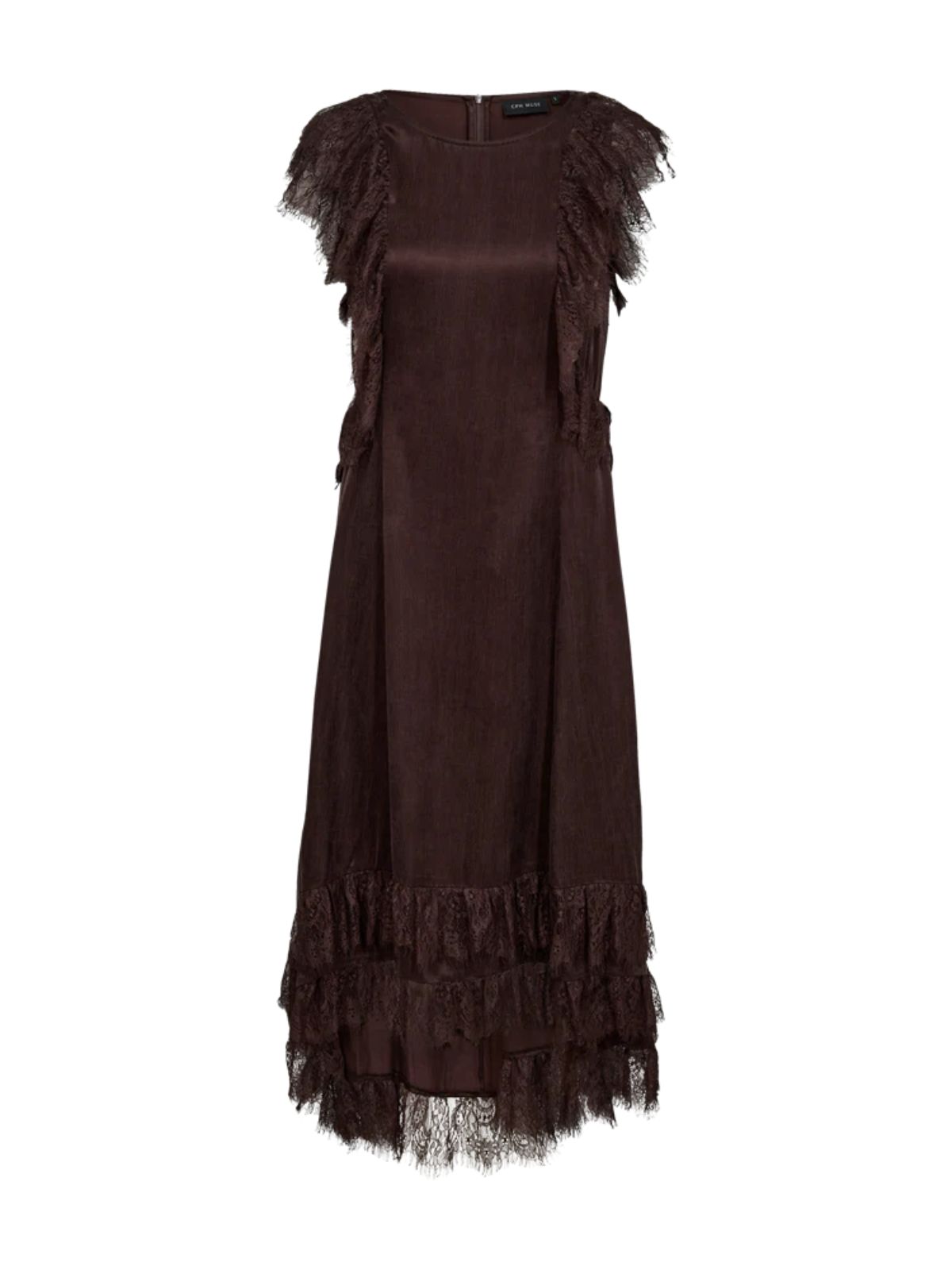 Charmant MARTA-DRESS fra Copenhagen Muse i en vævet cupro–viskoseblanding med et blødt, flydende fald og en subtil glans. Kjolen har en feminin A-line silhuet fremhævet af flæser langs ærmekanter og bund samt en lagdelt high-low bund, der skaber smuk bevægelse samt skjult lynlås lukning bagpå. De blondebesatte skulderstropper kan knappes op og falde blødt ned over skuldrene for et off-shoulder udtryk.Længde: ca. 110 cm