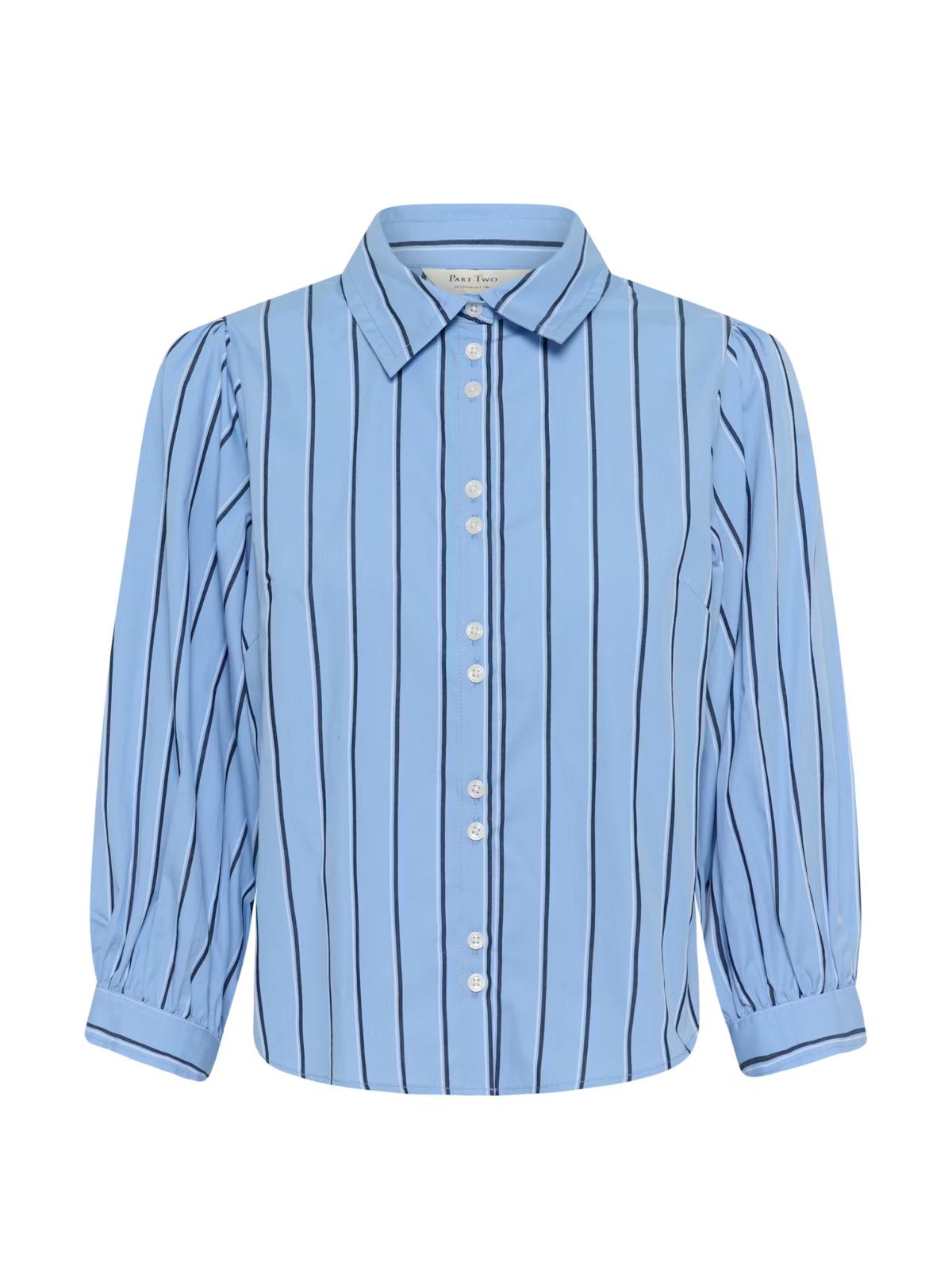 Denne stribede skjorte kombinerer klassisk design med moderne detaljer. Den har en lige silhuet, klassisk krave og gennemgående knaplukning, mens de lange voluminøse ærmer med manchetter tilfører et feminint og afslappet touch. Den krispede, strukturerede overflade giver skjorten karakter og et stilfuldt udtryk.