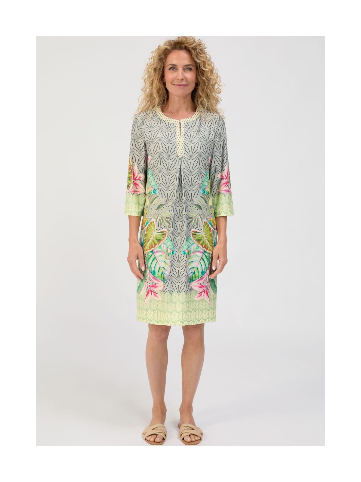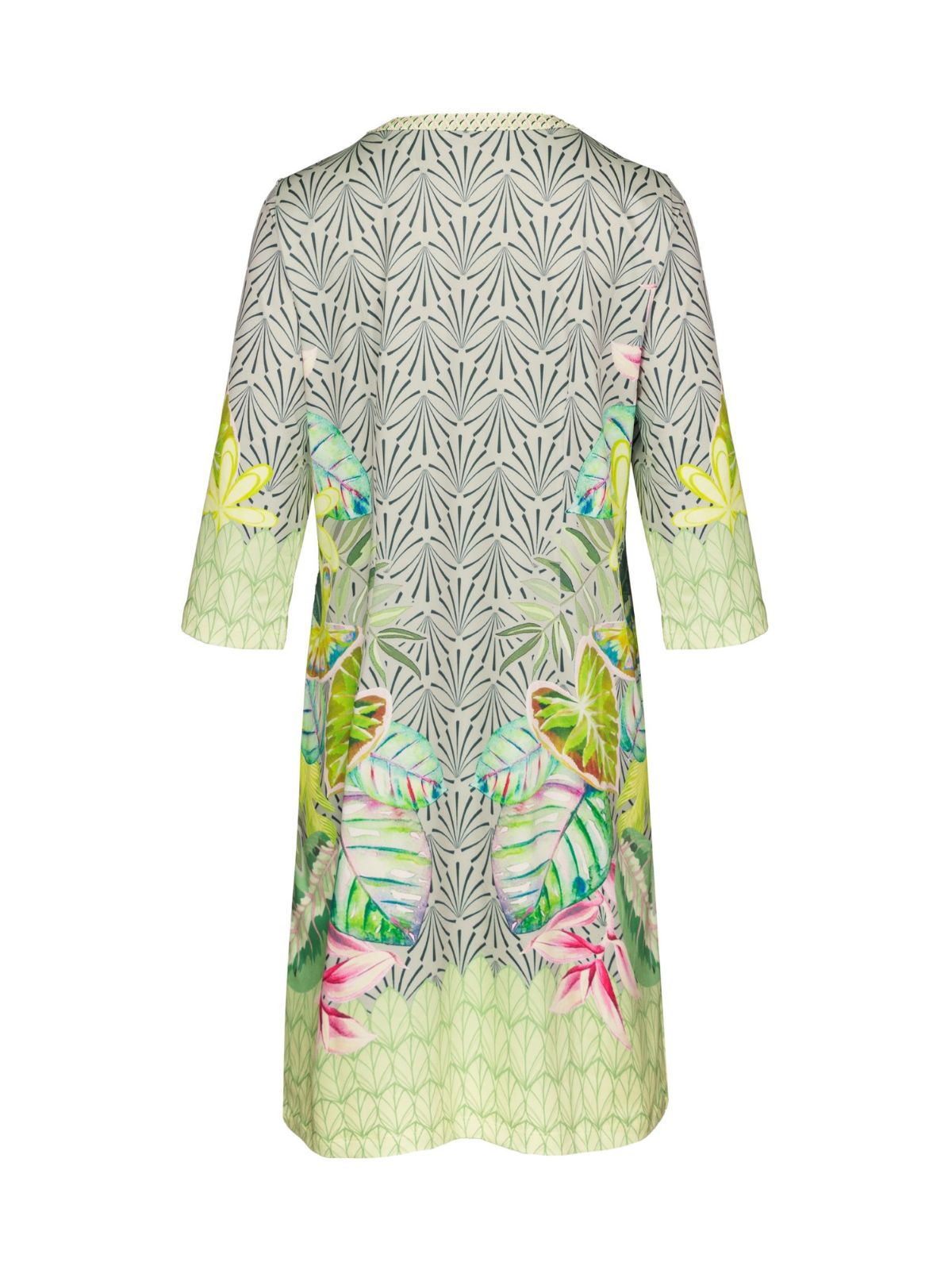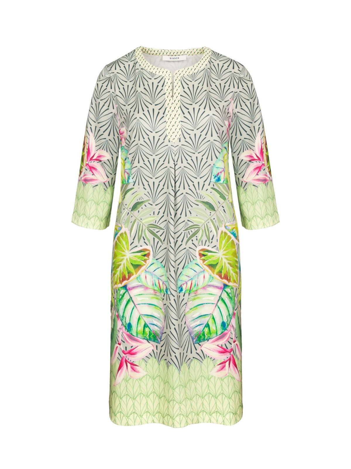 Danilo kjolen fra BIANCA imponerer med sit moderne print i sæsonens mest trendy farver! Den høje kvalitets af letplejede stofblanding med elastan og den afslappede pasform sikrer en behagelig fornemmelse. Et særligt højdepunkt er den dekorative kant ved tunikaudskæringen og kanterne på kjolen og ærmerne. Uanset om du klæder dig elegant til din næste fest eller afslappet til hverdag, er Danilo en alsidig ledsager til mange lejligheder.Længde: ca. 94 cm / For størrelse 38: længde ca. 94 cm, fra størrelse 40 ca. 1 cm længere pr. størrelse.