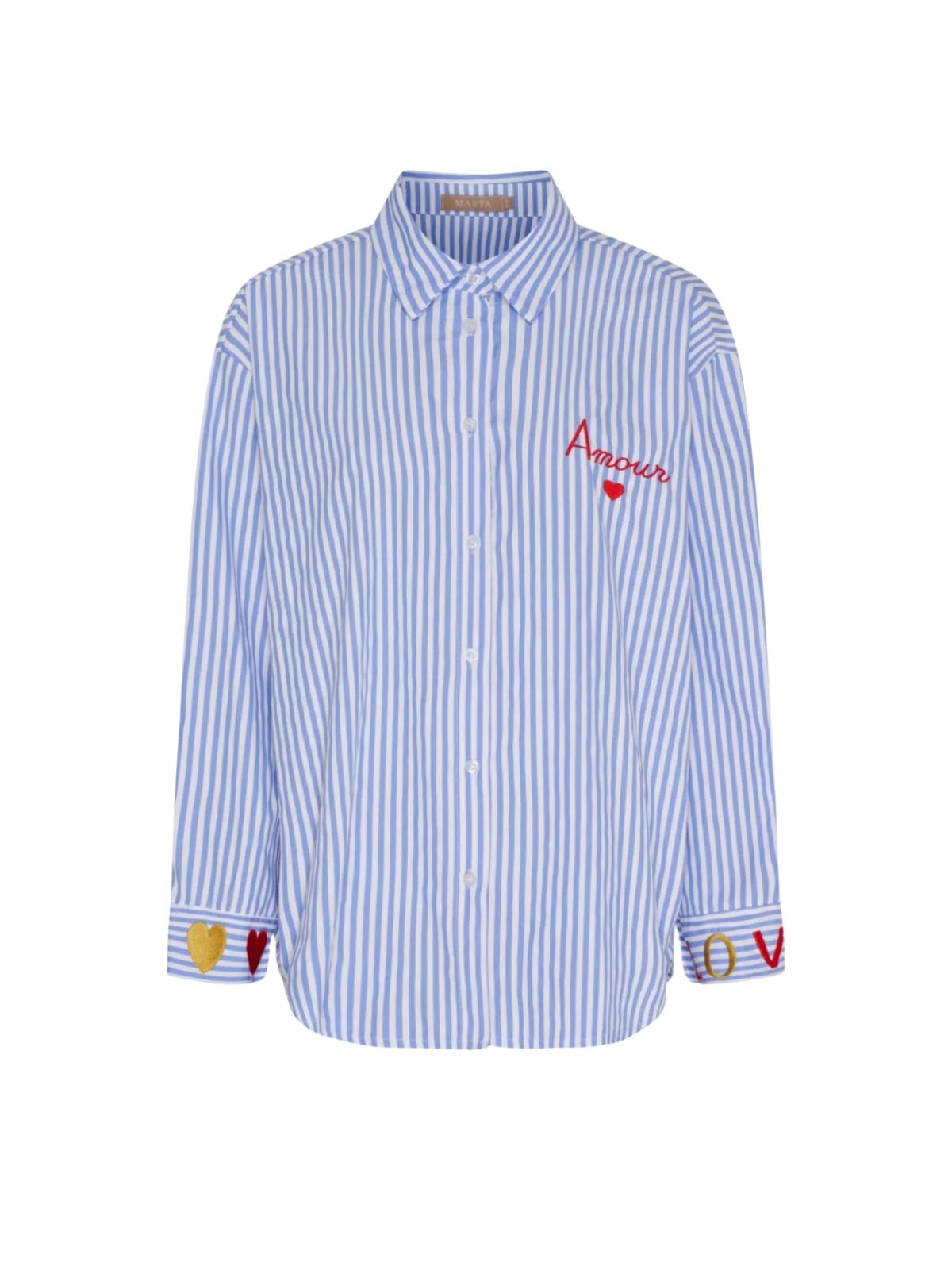 Marta Du Château skjorte i lyseblå striber med fine broderede “Amour”-detaljer og små hjerter giver et charmerende og feminint udtryk. Afslappet pasform med klassisk krave og knaplukning gør den perfekt til både jeans og nederdel.