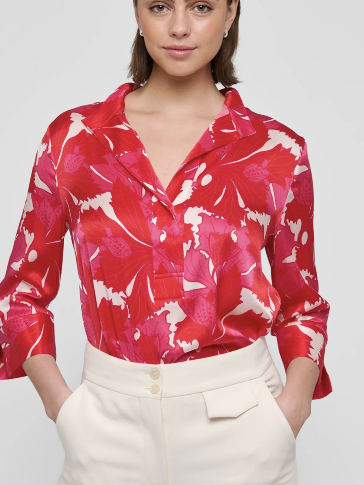 Sofistikeret silkebluse i almindelig pasform med et iøjnefaldende blomsterprint i røde og pink nuancer. Designet har ståkrave, crossover-lukning og 3/4-ærmer med kimono-inspirerede manchetter.