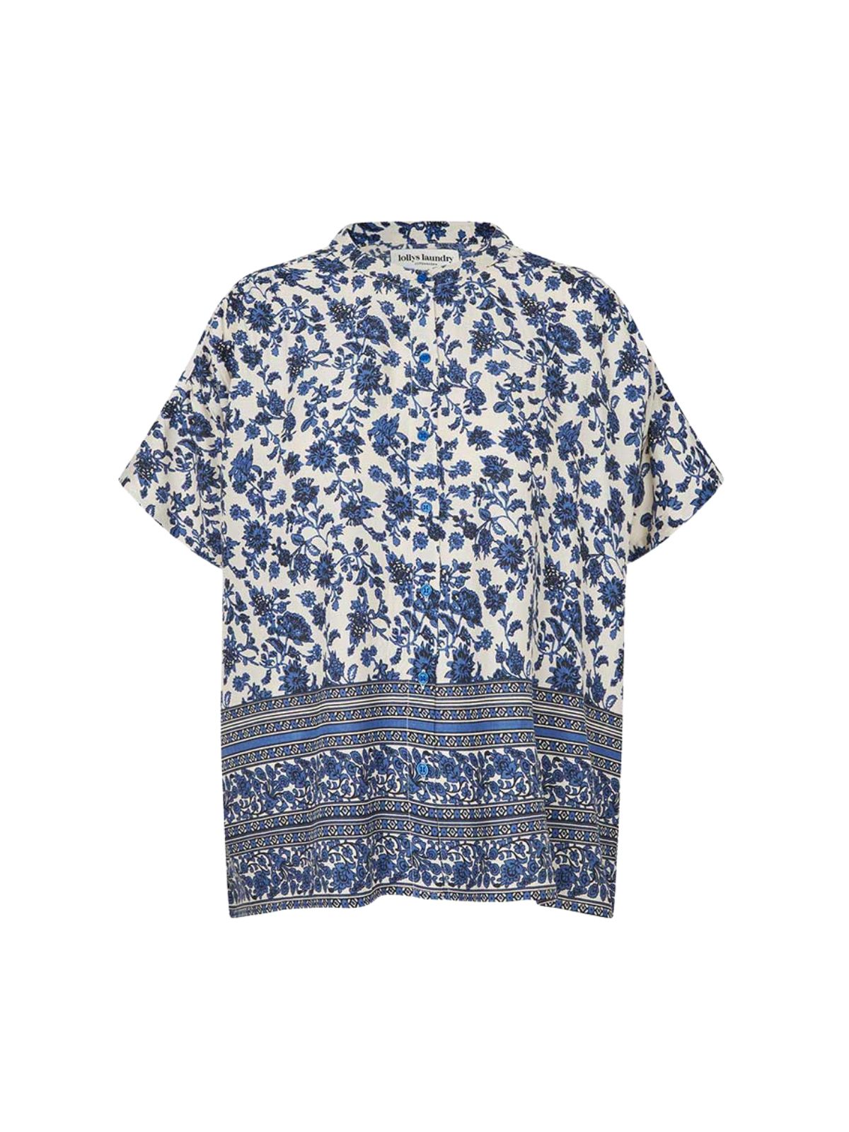 Mya skjorten fra Lollys Laundry er en elegant og bæredygtig skjorte, fremstillet i 100% Ecovero viscose, som kombinerer luksuriøs komfort med miljøvenligt design. Skjortens eksklusive blå print giver et feminint og kunstnerisk udtryk, der løfter både hverdags- og festoutfits. Den lette og åndbare kvalitet sikrer komfort hele dagen, mens den flydende pasform skaber en elegant silhuet, der fremhæver den feminine figur. Kortærmet og alsidig, Mya skjorten er perfekt til både casual og smart casual styling.