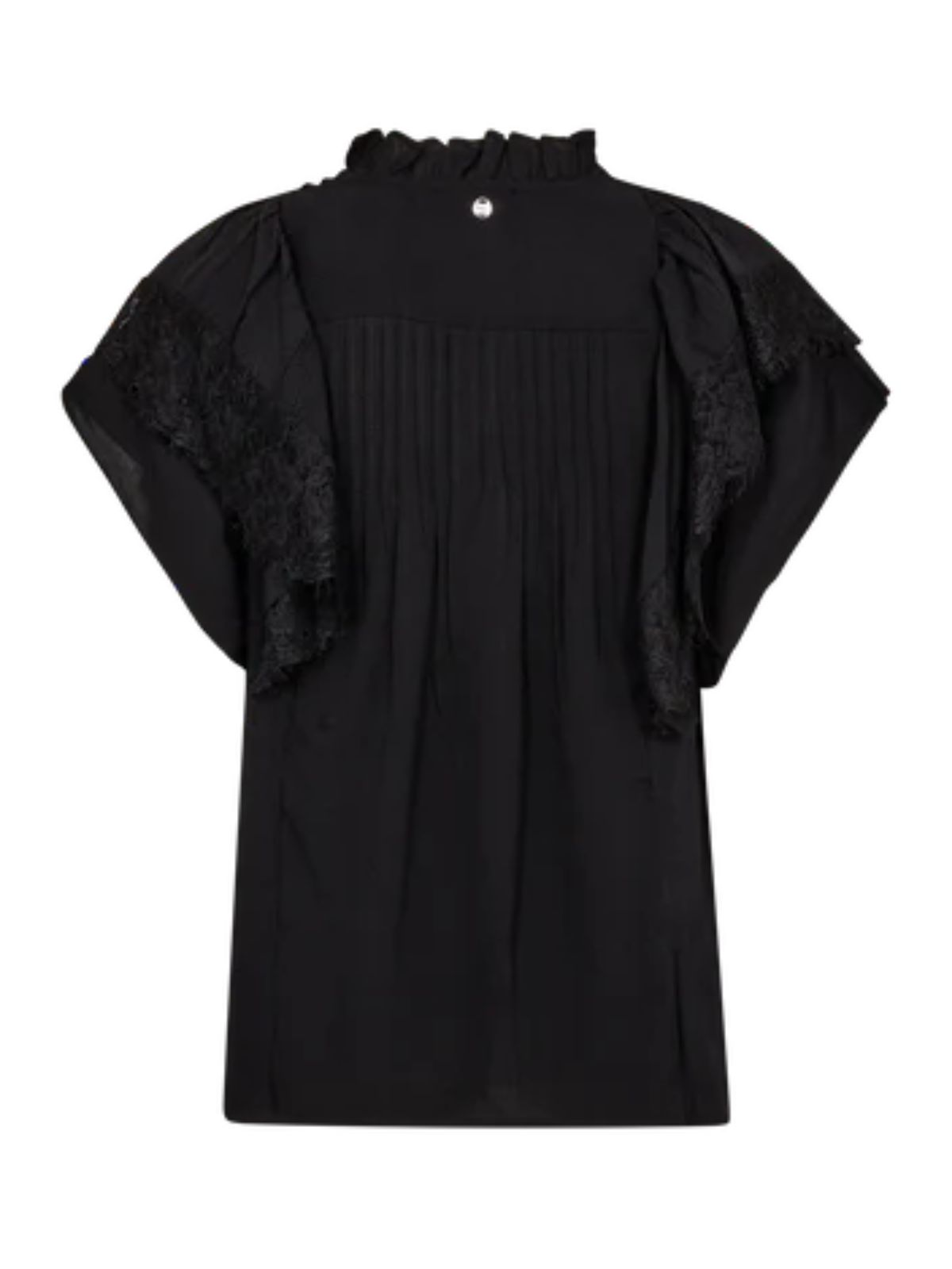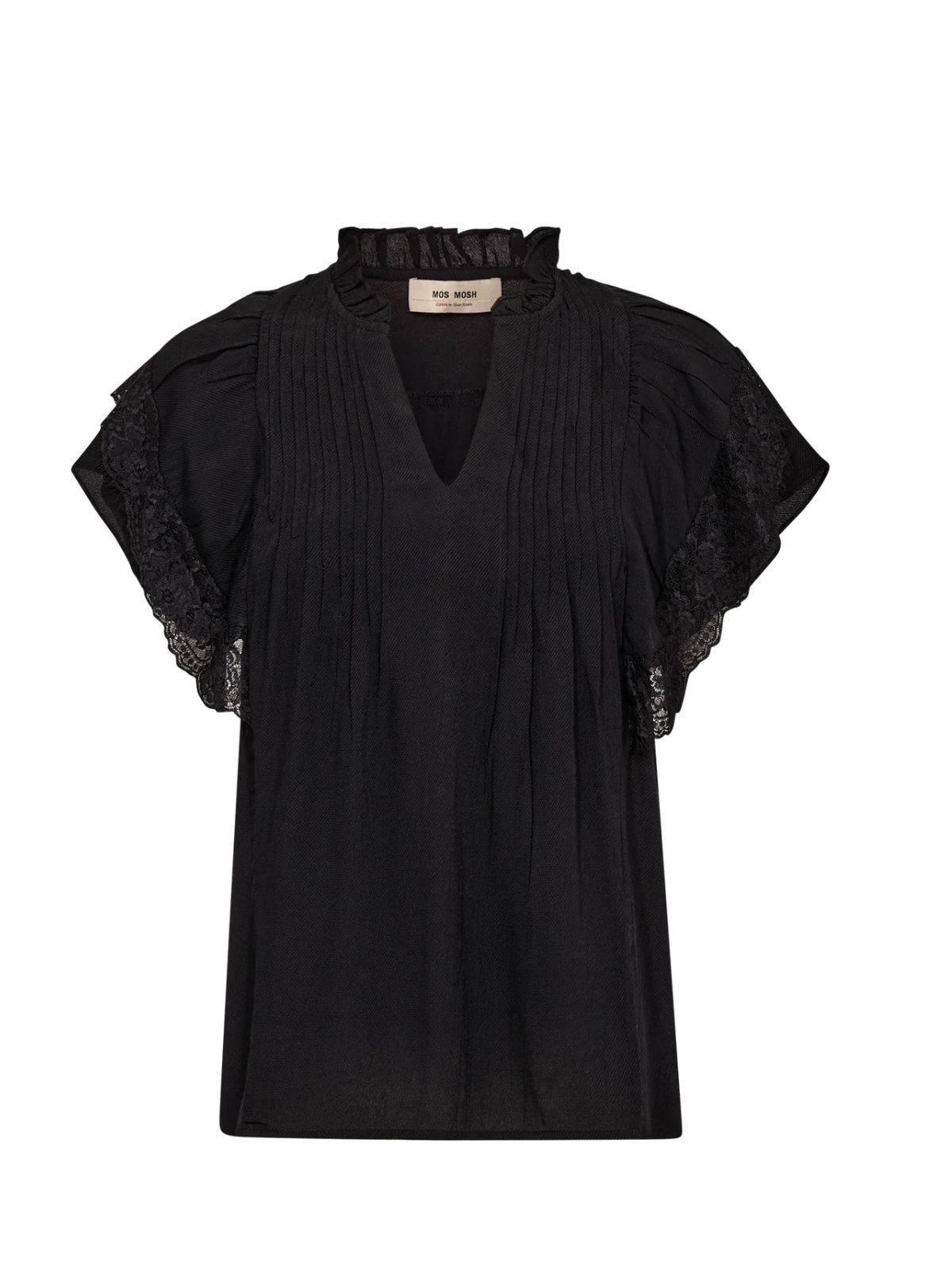 Bluse fra MOS MOSH i blød viskose med feminine blondedetaljer ved ærmerne. Den har regular pasform, V-udskæring og fine læg foran, som skaber en elegant silhuet.Materiale: 100% viskose