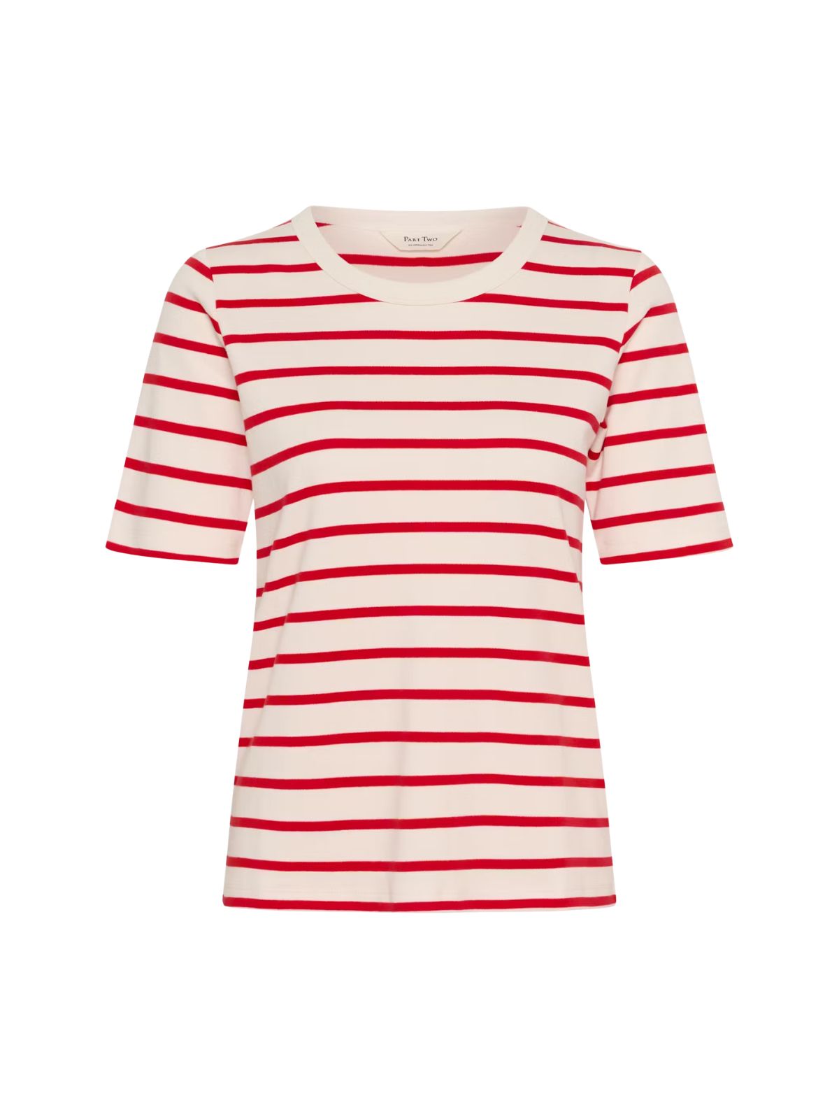 Denne dame-T-shirt i Poppy Red kombinerer klassisk stil med komfort. Med sin regular fit, korte ærmer og rund halsudskæring er den ideel til både hverdagsbrug og som lag under andre outfits. Fremstillet i 100% økologisk bomuld sikrer den blødhed, åndbarhed og bæredygtighed, hvilket gør den til et alsidigt og ansvarligt valg til garderoben.